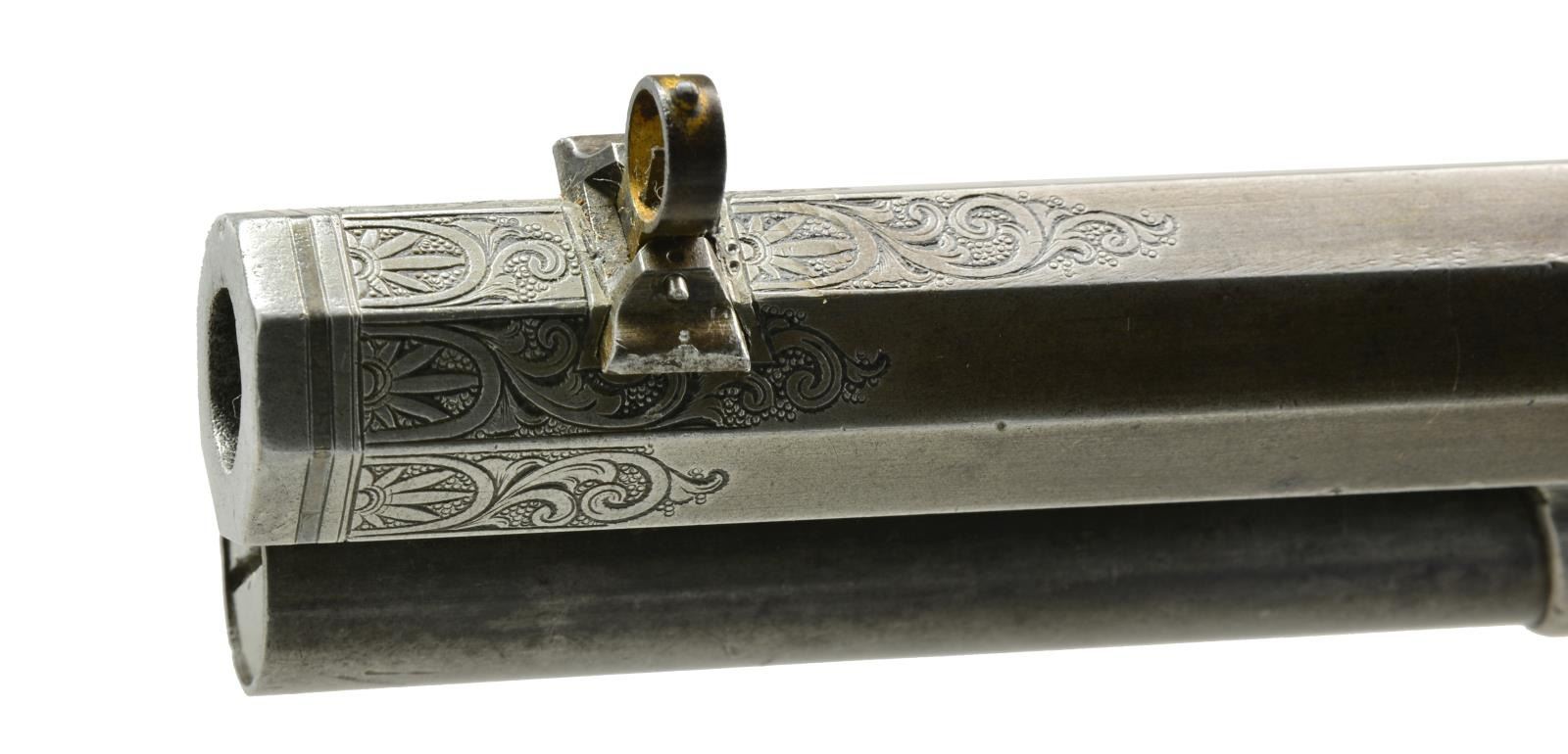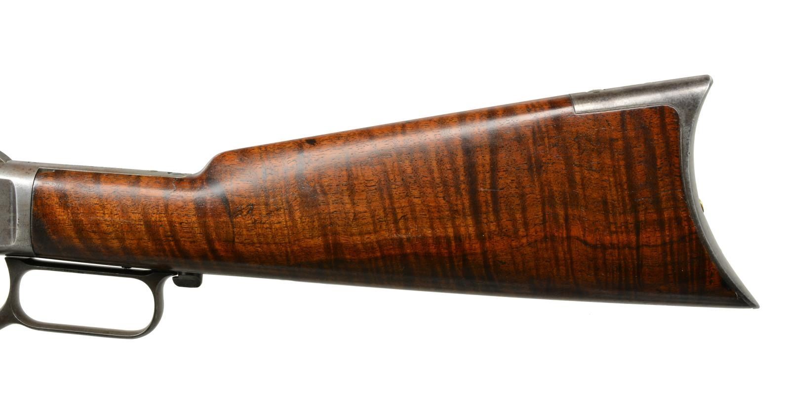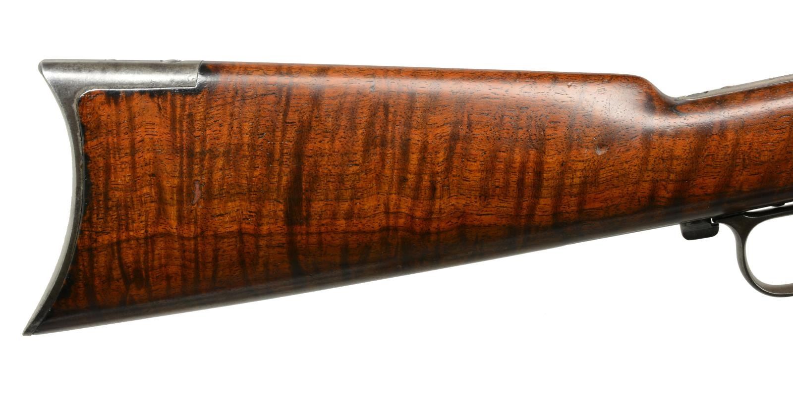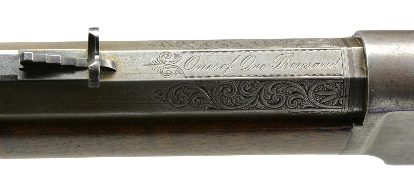 THOUSAND DISPLAYED AT THE ORPHEUM THEATER FOR THE PREMIERE OF “WINCHESTER 73” & LATER EXHIBITED AT THE CODY FIREARMS MUSEUM. Cal. 44 WCF (44-40). S# 30783. During the 1950’s Steve Hannigan prepared a report of "1 of 1000 Model 1873". This report is the result of the One of One Thousand Search, which promoted Universal-International’s feature film "Winchester 73" starring Jimmy Stewart. This rare rifle was number 18 among the One of One Thousands discovered during the movie publicity search. This search fostered the popularity of gun collecting as we know it today. At the time of the 1950 movie search, this rifle was owned by US Navy Cmdr. T.R. Jordan, of Seattle, Washington and in the notarized letter to Universal, Cmdr. Jordan states he acquired the rifle a few years back (1946 or 1947). This exact Winchester One of One Thousand was at the "Orpheum Theater" in a glass case for the initial release of the movie in 1950 "everyone stopped in the theater to view the rifle & Wanted Poster in the lobby". The promotional search for the surviving Winchester One of One Thousand by Universal created far more enthusiasm than the original sales promotion conducted by Winchester. The original marketing by Winchester for the One of One Thousand rifles targeted clients seeking a superior level of performance from their rifles. The firearms were built around barrels found to have extra merit & built into special guns with set triggers & extra finish. This rifle exhibits even further scarcity with a 2" longer than standard 24" octagon barrel which is engraved in script font "One of One Thousand" on the breech end of the top barrel flat. This marking is highlighted by vine type foliate scroll with punch dot backgrounds on the adjacent flats & around the muzzle. Muzzle & breech end of the barrel inlaid with silver bands. Sights consist of a gold washed Beach's combination front & short semi buckhorn V notch rear sight with serrated edges. Full length magazine. First Model action having a mortised thumb print dust cover & set trigger. The factory “XX” stock & forearm are of non-checkered tiger striped American black walnut and fitted with crescent steel trapdoor buttplate that holds a four piece cleaning rod. This is the only One of One Thousand known with this stock configuration. Left inside of lower tang is marked with assembly number "732" & wood grade marking "XX". This rifle was recently displayed at the Buffalo Bill Center of the West in Cody, Wyoming for the grand reopening of the Firearms Museum. UNATTACHED ACCESSORIES: Cody Firearms Museum letter dated Nov. 02, 2017. This letter lists the following information for serial number 30783 “Type: Rifle / Barrel Type: Octagon / Barrel Length: 26 inches / Trigger: Set / XX Stock / Sights: Sporting leaf / Casehardened / 1 of 1000 / Received in warehouse on July, 24 1878 / Shipped from warehouse on August 02, 1878, Order number 12475”. Other information includes copies of Winchester ledgers pertaining to the One of One Thousands, a list of known owners dated Dec. 31, 1952, & a letter from Steve Hannigan to J. T. Boone of Winchester listing the owners. Additionally there are copies of several letters of correspondence between Cmdr. Jordan & Steve Hannigan regarding discovery of this rifle in July 1950. CONDITION: metal retains some light & fading blue in protected areas with exposed areas fading to a mild gray patina showing minor handling parts. The Beeches front sight retains much of its gold finish. The wood is lightly sanded & restored showing scattered fine scratches & mild marks. The stock shows a couple of very sm. chips at both sides of top tang & along left side of lower tang with a sm. hairline crack at right rear of top tang. Front right side of forearm has a documented added wood repair that was referenced in famed author & retailer Theodore Dexter's 1958 advertisement of this rifle. Smooth mechanics. Bore retains sharp intact rifling showing scattered spots of minor pitting. PROVENANCE: Cmdr. T.R. Jordan, USN - 1947; F. Theodore Dexter – 1958; Hank Vogel collection – 1968; William F. Mitchell Collection – 1968; Leroy Merz; Collection of Dr. Edmund Lewis; James D. Julia Auction - Oct. 2017; The Esteemed Personal Collection of Native South Texan, Vicente Sepulveda. Thanks to Cmdr. Jordan's & Steve Hannigan's meticulous records & extensive additional research at the Cody Museum Library by the current owner, this authentic rifle is now one of the best documented One of One Thousands in existence. This is a rare opportunity to own a One of One Thousand discovered during the 1950 "Winchester '73" movie search, the actual rifle displayed at the Orpheum Theater during the movie premier and perhaps one of the most prized American made collectible rifles in existence. PROVENANCE: From The Vince Sepulveda Collection. (01-17685/DS). ANTIQUE. $90,000-150,000.