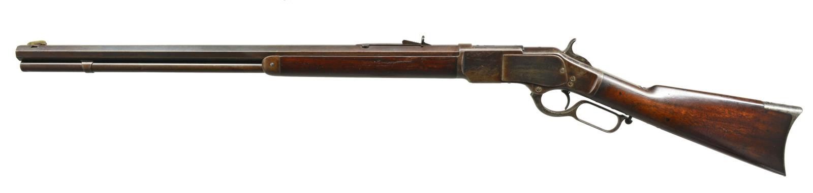 Cal. 44 WCF. S# 10132. Bbl. 24" oct. w/ Rocky Mountain front sight & sporting rear sight. Full length mag. Set trigger. Replacement thumb print dust cover. Walnut forearm & straight grip stock w/ crescent steel trapdoor buttplate. 1875 Mfg. UNATTACHED ACCESSORIES: 3 piece cleaning rod in butt. CONDITION: bbl. & action have a mottled brown patina appearance w/ areas of light pitting. Wood has lightly cleaned finish showing handling marks. Bore has worn rifling showing scattered pitting. (01-17891/DS). ANTIQUE. $4,500-6,500.