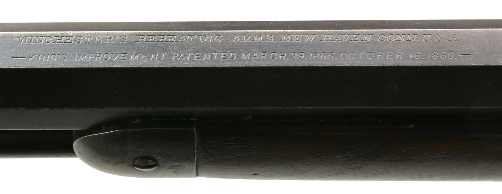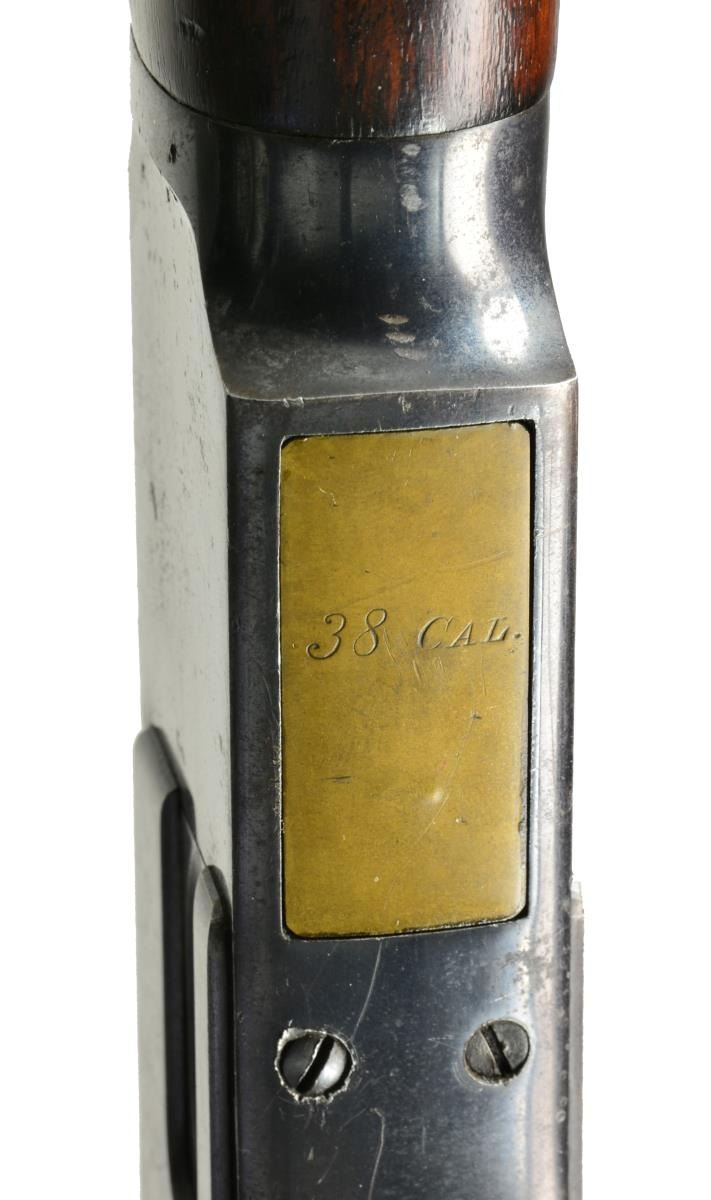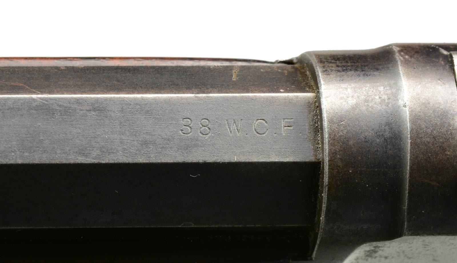 Cal. 38 WCF. S# 319671B. Bbl. 24" oct. w/ original sporting sights. Full length mag. Blue finish w/ case colored hammer, lever & crescent steel trapdoor buttplate. Walnut forearm & straight grip stock. Mfg. 1889. CONDITION: 70% dull lightly fading blue showing scattered scratches & spots of freckling. Wood is sanded & properly refinished showing some remaining handling marks. Sound mechanics. Bore retains largely intact rifling showing spots of pitting. (01-17955/DS). ANTIQUE. $2,000-3,000.