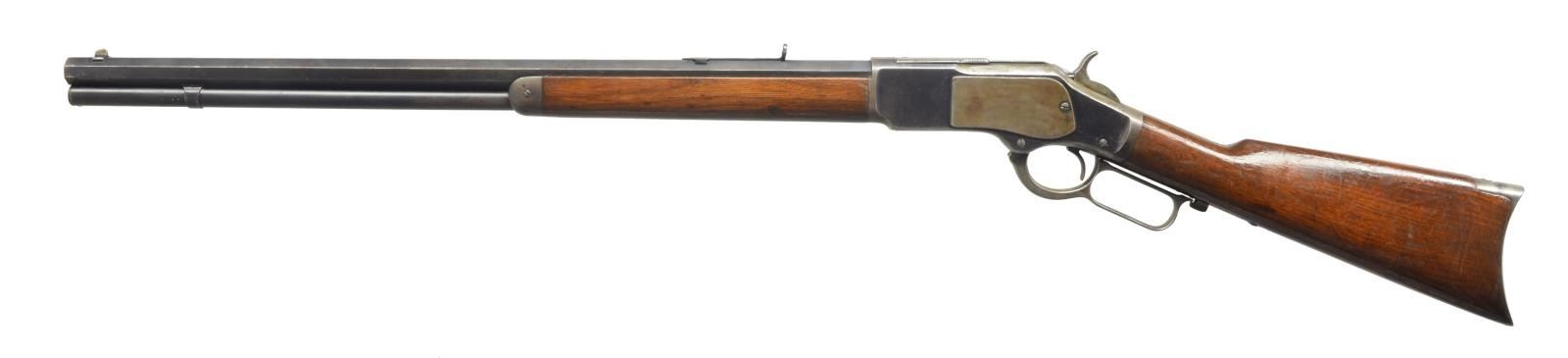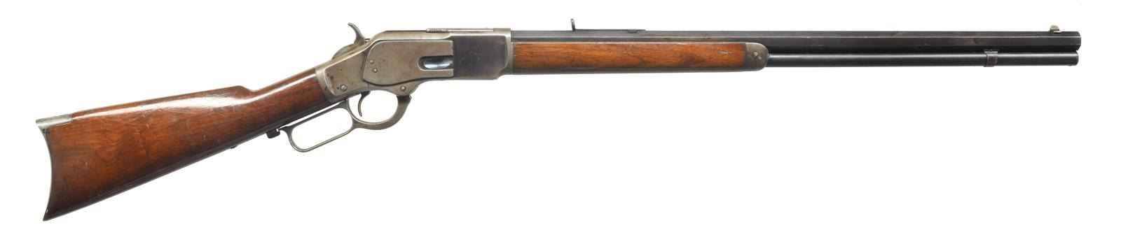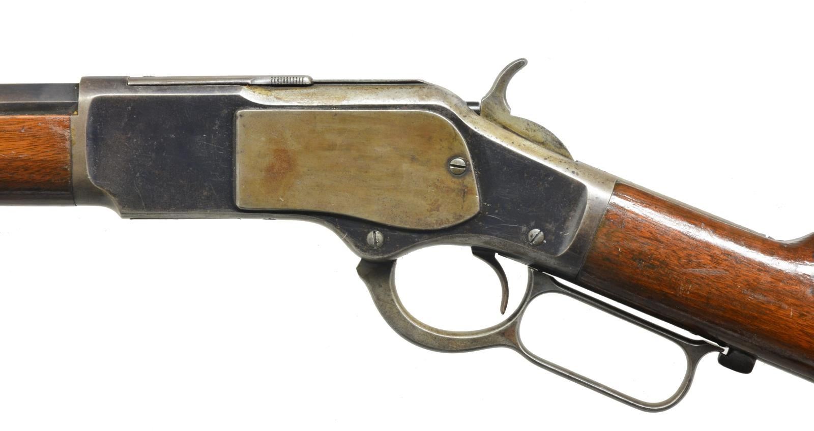 Cal. 44 WCF (44-40). S# 577341B. Bbl. 24" oct. w/ sporting sights, rear sight missing elevator. Tubular mag. Walnut forearm & straight grip stock w/ crescent steel trapdoor buttplate. 1902 Mfg. UNATTACHED ACCESSORIES: 4 piece cleaning rod held in trapdoor. CONDITION: bbl. & mag. tube retain 70% dull lightly faded blue showing edge wear & handling marks. Action retains 40% dull lightly faded blue w/ side plates & much of receiver fading to gray showing sm. spots of corrosion. Wood has added finish over scratches & handling marks. Bore is bright retaining strong rifling showing sm. spots of very light darkening. (20-3612/DS). CURIO. $1,500-2,000.