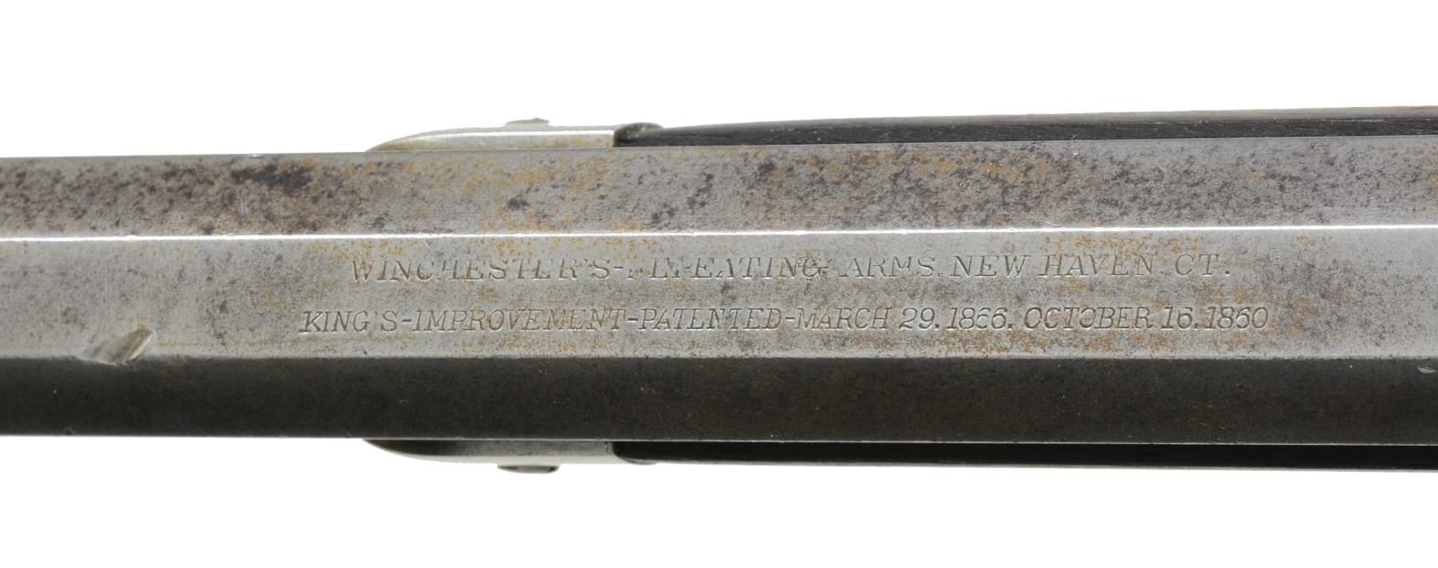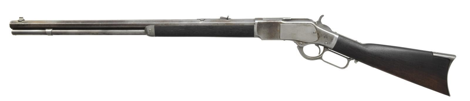 Cal. 44 WCF. S# 104213A. Bbl. 24" oct. w/ Lyman front sight & original flat top sporting rear sight. Full length mag. Walnut forearm & straight grip stock w/ crescent steel trapdoor buttplate. 1882 Mfg. CONDITION: metal has mottled brightly cleaned appearance showing scattered spots of pitting & surface corrosion. Stocks are heavily sanded & show considerable oil darkening. Good mechanics. Bore retains intact rifling showing light general pitting. (01-17959/DS). ANTIQUE. $1,000-1,500.