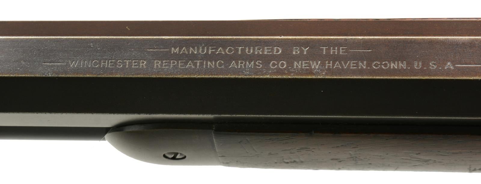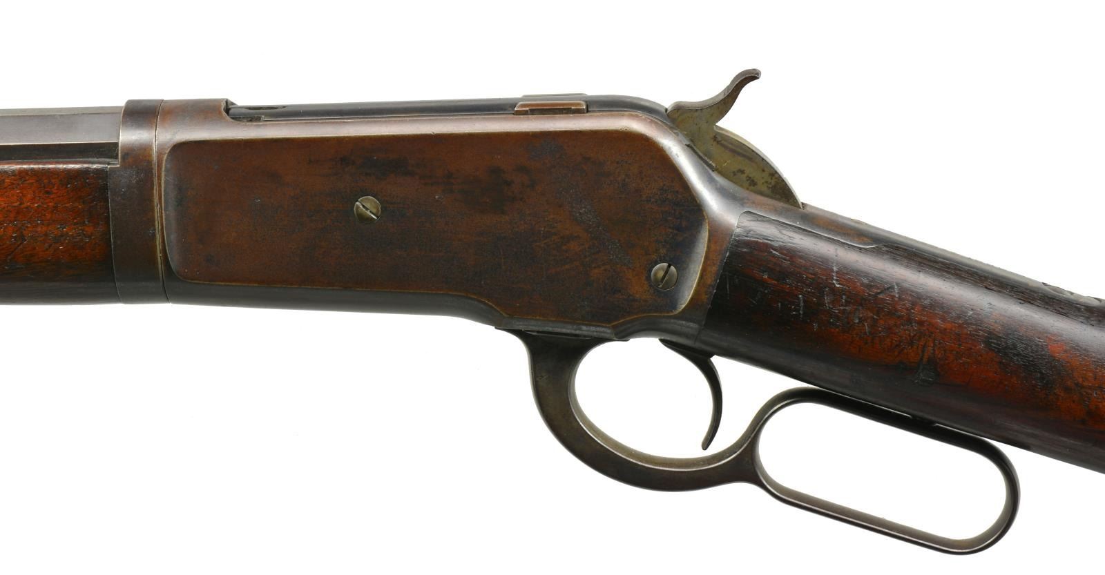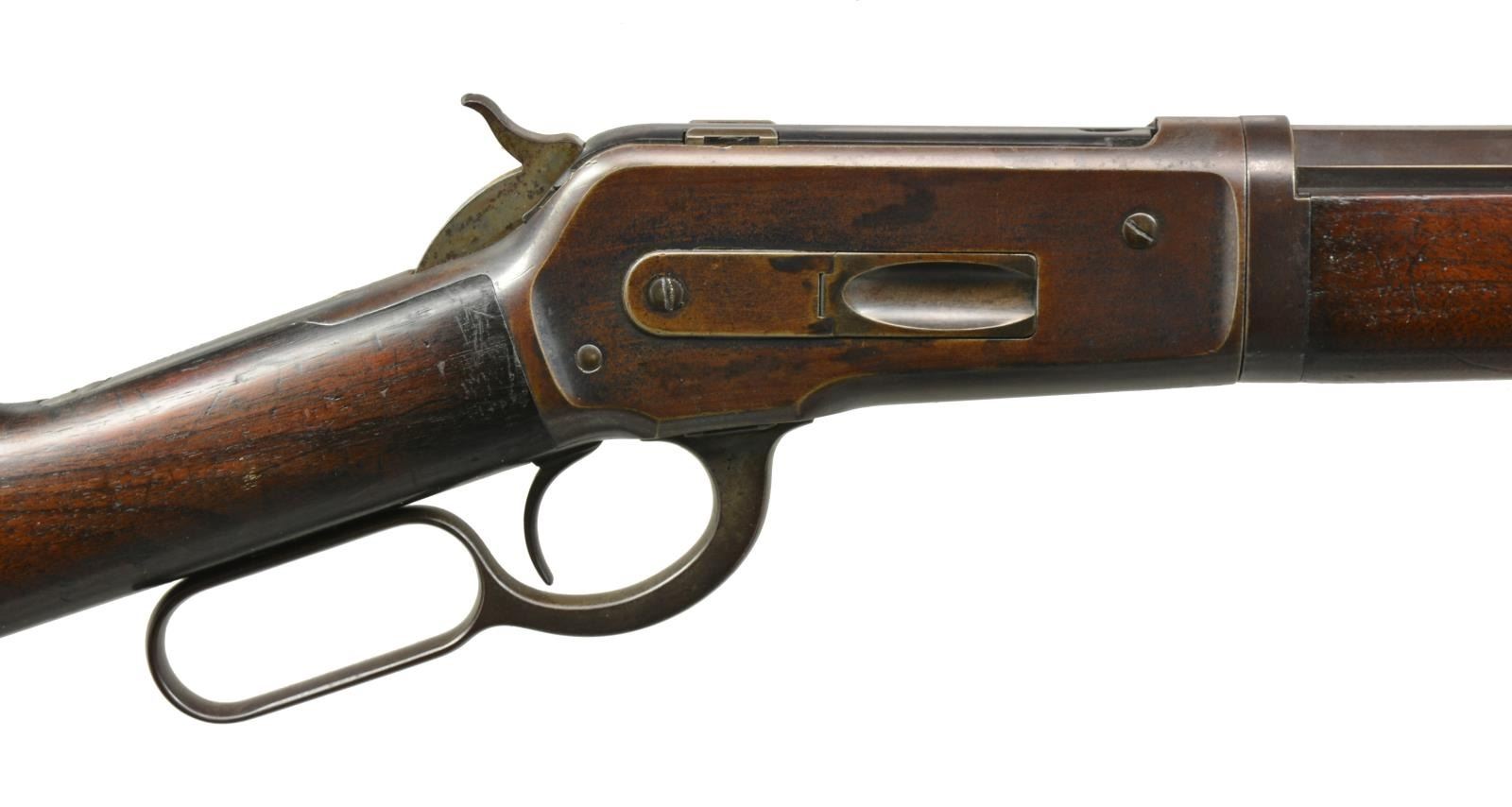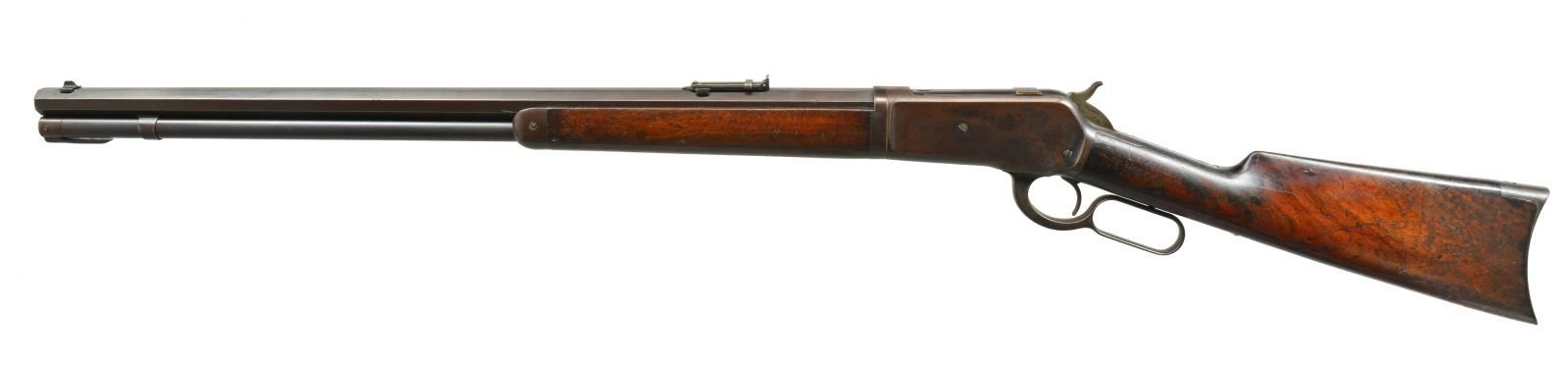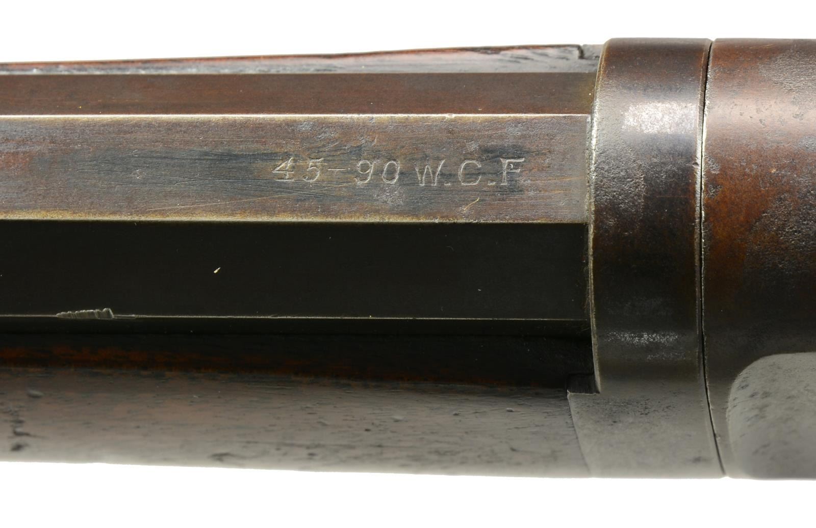 Cal. 45-90. S# 111857. Bbl. 26" oct. takedown w/ replacement bead front sight & 1000 yd. graduated sporting leaf rear sight. Full length takedown mag. Case colored action. Walnut forearm & straight grip stock w/ crescent steel buttplate. 1897 Mfg. CONDITION: bbl. & mag. tube retain 50% blue fading to brown. Action has faded to dark patina showing faint traces of colors. Stocks have age darkened worn appearance showing numerous scratches, dents & handling marks. Bore has darkened appearance & worn rifling showing light pitting. (01-17864). ANTIQUE. $5,000-7,000.