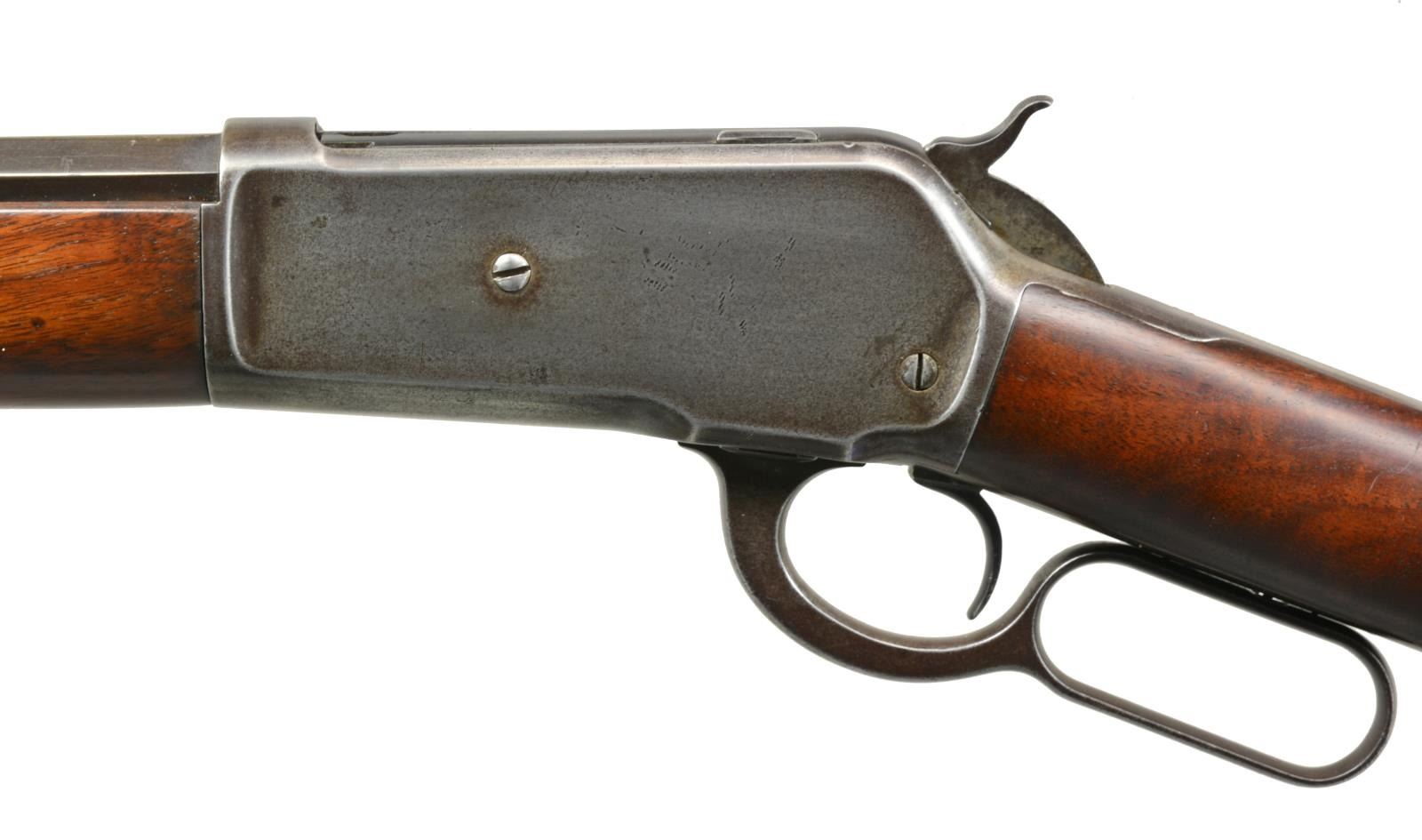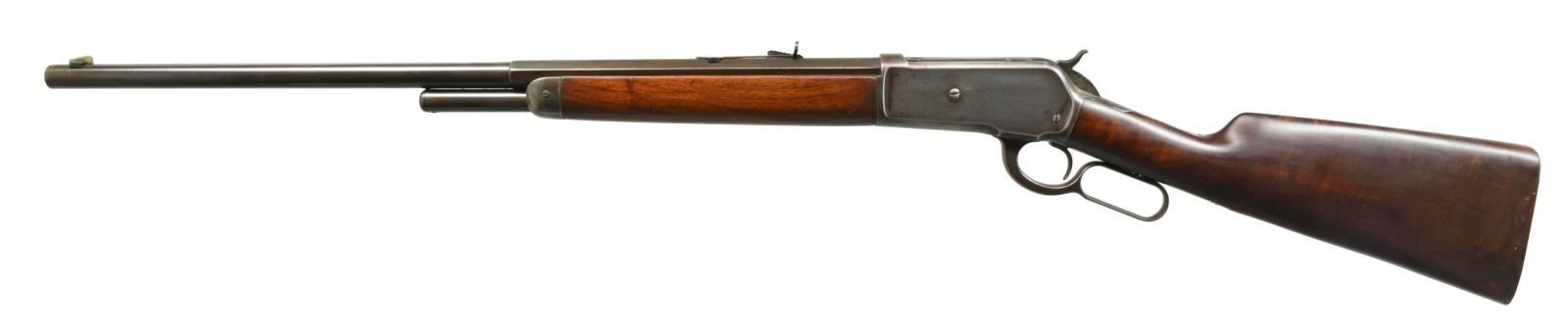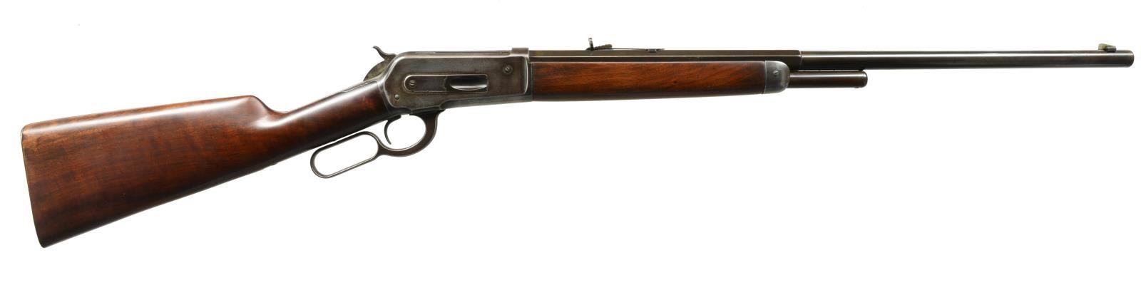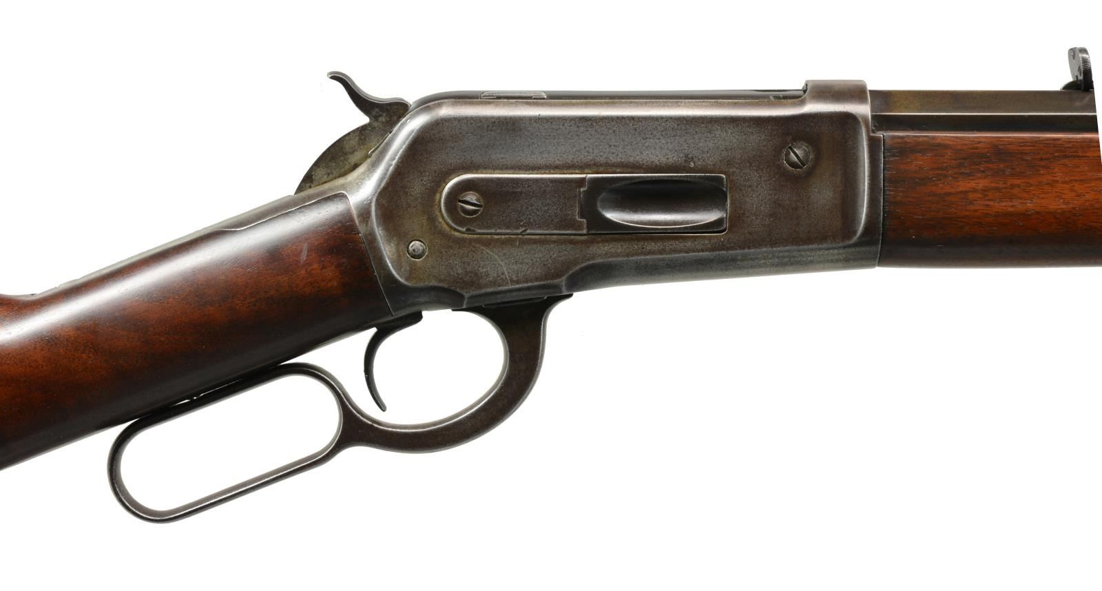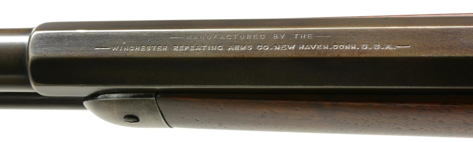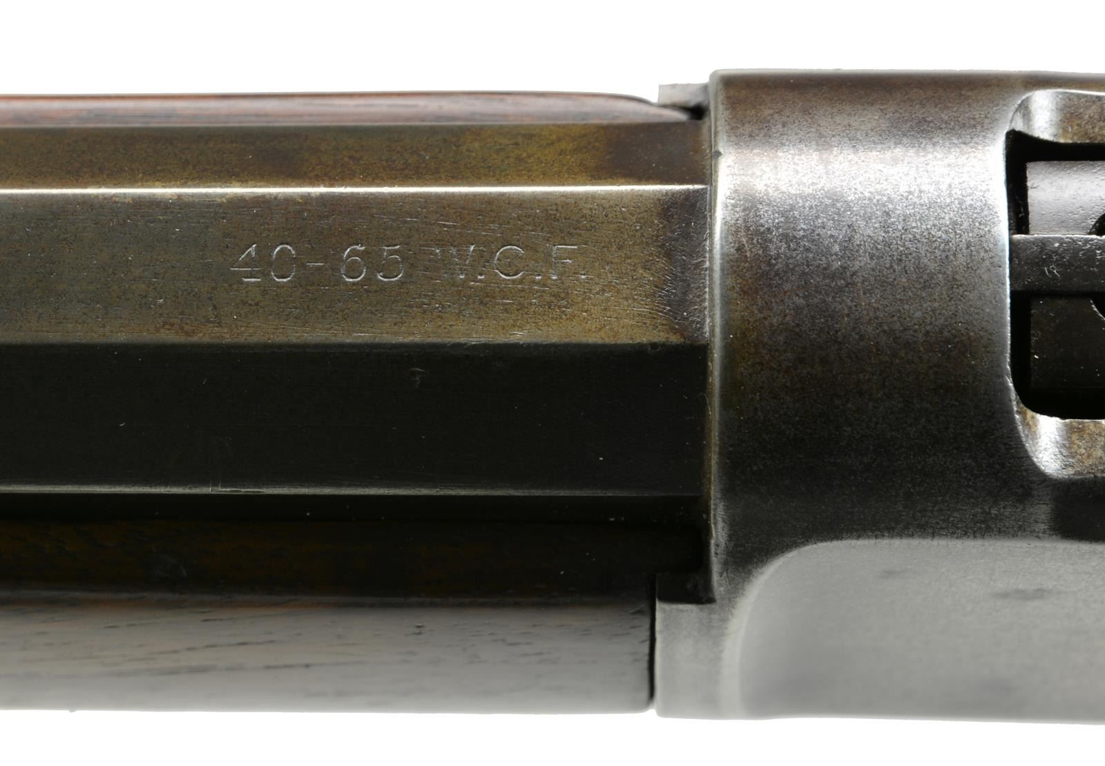 Cal. 40-65 WCF. S# 39163. Bbl. 26" oct. to rnd. Rocky Mountain front sight w/ sporting rear sight. Half length mag. Original walnut forearm. Replacement straight grip stock of nicely grained walnut utilizing steel shotgun butt. UNATTACHED ACCESSORIES: Cody Firearms Museum Records check states the following information: "Date in: 3-4-1890 / Type: Rifle / Caliber: 40/65 / Barrel: 1/2 Octagon / Trigger: Plain / Sights: Winchester Express Ft & rear / Magazine: 1/2 mag. 5 ctgs / Butt: Shotgun Butt / Date Shipped: 3-4-1890. / Order# 9776 / Other Remarks: 3 lb. pull.". CONDITION: bbl. & mag. tube have smooth brown patina appearance. Action has cleaned mottled gray appearance over some very light pitting & sm. handling marks. Forearm has good refinish. Stock has good finish showing sm. marks. Bore has dark frosted appearance w/ intact rifling showing scattered pitting. (01-17875). ANTIQUE. $3,000-5,000.