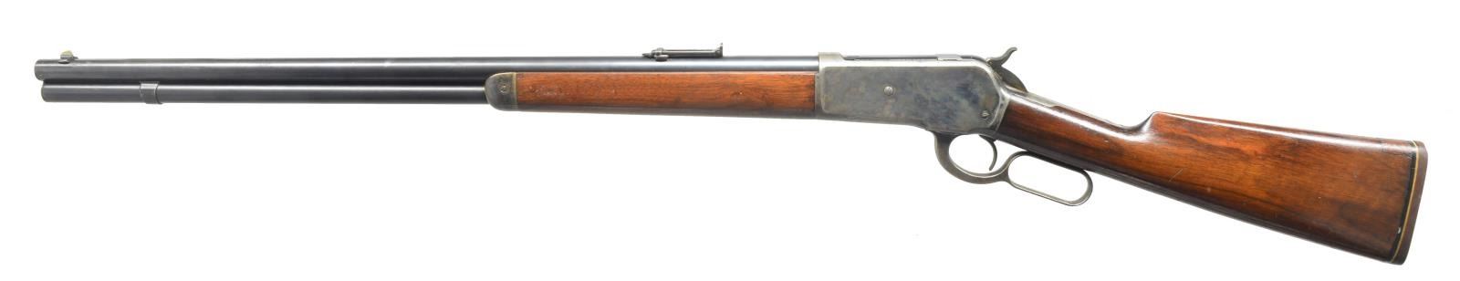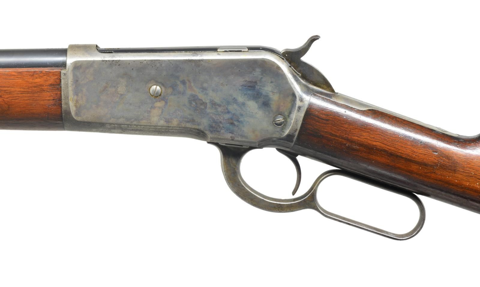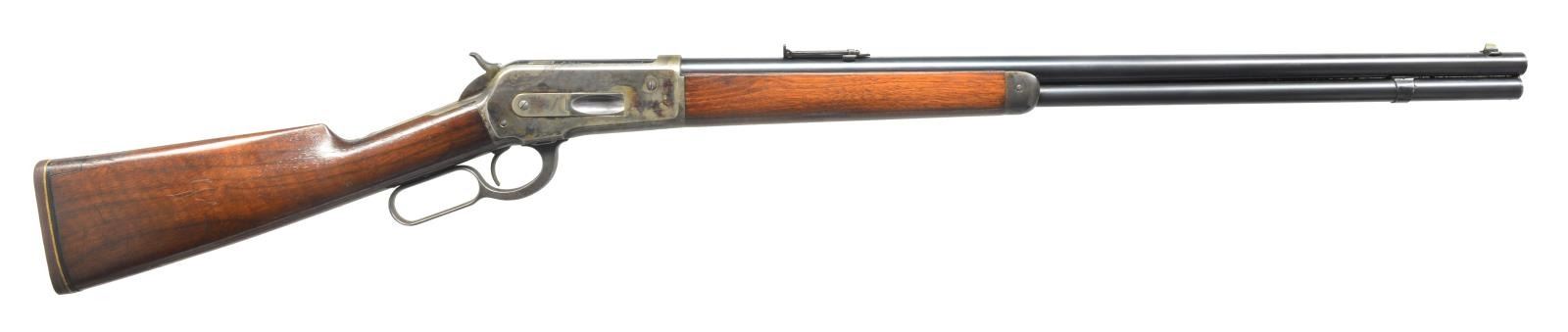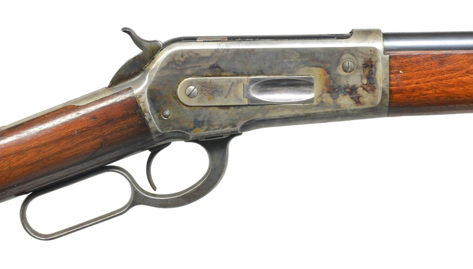 CASE HARDENED FRAME. Cal. 45-70. S# 121767. 26 1/2" Blued rnd. bbl. has Winchester markings on top & is fitted w/ optional rifle type flip up ladder rear sight & sourdough type German silver blade front. Full mag. Case hardened action is marked “MODEL 1886” on top tang & has blued bolt & loading gate. American walnut straight grip buttstock measures 13 3/4" & is fitted w/ rifle pad. Standard uncheckered forend has case hardened cap. CONDITION: fine as partially altered. Bbl. & mag. tube retaining approx. 90% original blue. Loading gate retains about half its blue. Action w/ about 60% original case hardened color w/ some scattered light pitting, mostly around bottom & sides & some dark pitting on top edge, left side. Buttstock refinished, crescent buttplate replaced, butt thinned & slimmed. 1" x 1/2" Piece of wood set into heel. Forend wood has what appears to be most of its original finish. Color hardening on cap is over 80%. Bright bore w/ some light frosting, mechanically good. (20-3994/MGM). CURIO. $3,000-5,000.