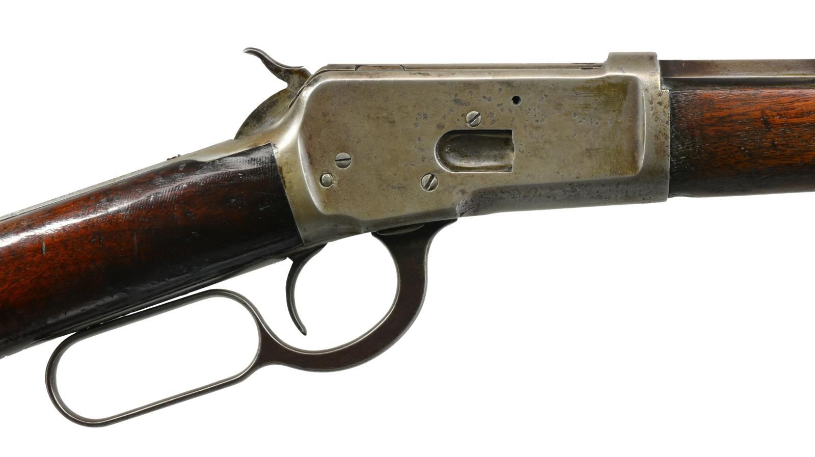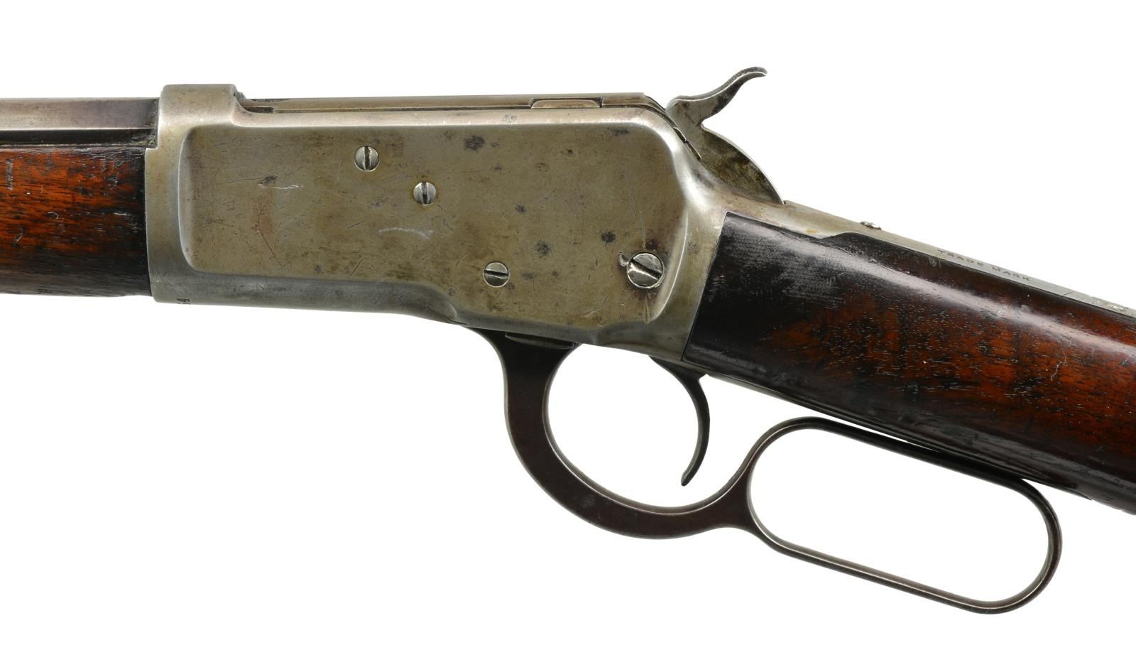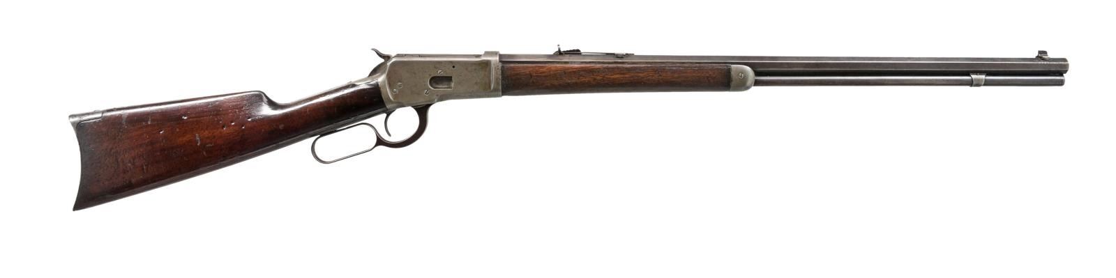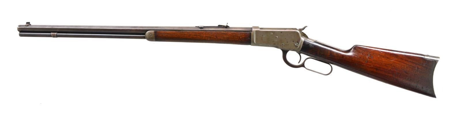 Cal. 32 WCF (32-20). S# 375054. Bbl. 24" oct. w/ replacement blade front sight & sporting rear sight. Full length mag. Walnut forearm & straight grip stock w/ crescent steel buttplate. Toeline of stock has 14 hand cut notches. 1906 Mfg. CONDITION: metal finish has faded to gray/brown showing scattered pitting & marks. Refinished forearm shows heavy wear forward of action w/ scratches & marks. Stock has heavy coat of added finish over numerous scratches & marks. Tang screw is a replacement, top tang shows dents & file marks. Dark lightly pitted bore. (20-2581/DS). CURIO. $700-1,000.
