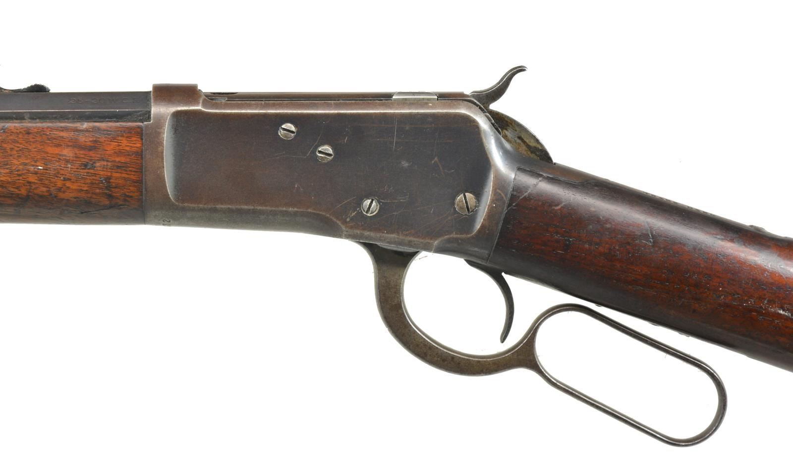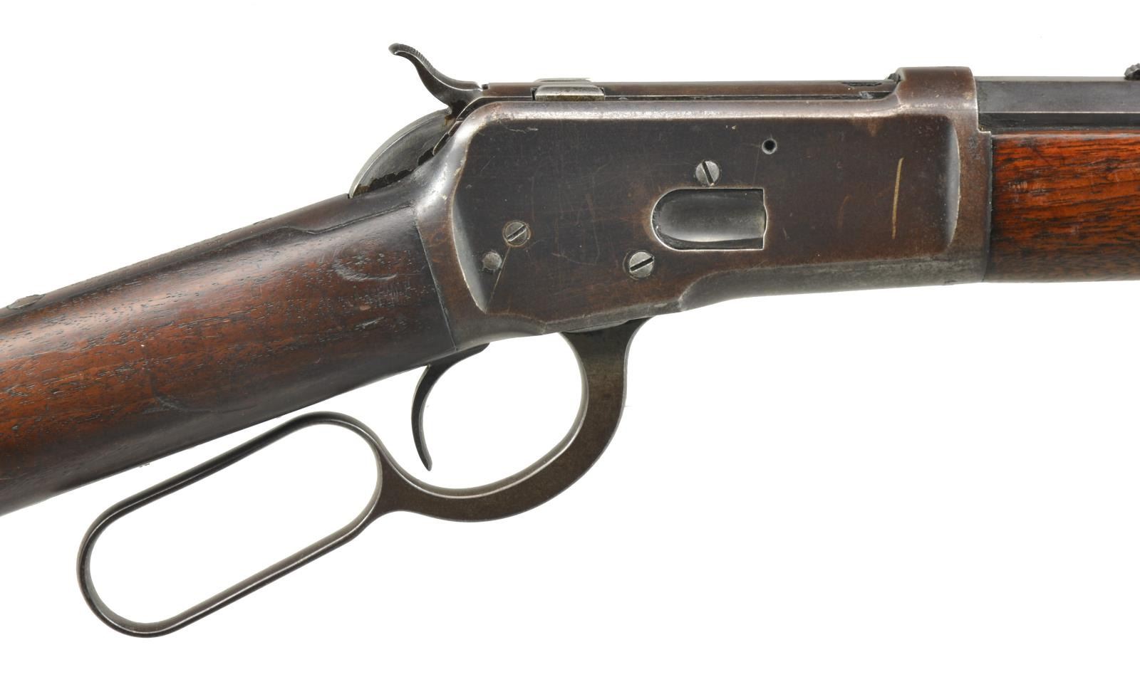Cal. 25-20. S# 436472. Bbl. 24 1/4" oct. Dovetail silver bead front sight. Dovetail adj. rear sight. CONDITION: bbl. retains good original blue w/ some areas of minor surface oxidation & worn bright on some sharp edges. Mag. tube retains very good original blue toning w/ some brown patina. Receiver has original blue w/ some minor surface oxidation worn & blending w/ some brown patina across bottom plus some minor nicks & scratches. Forend is solid w/ original varnish. Numerous nicks & dings blending w/ hand worn patina. Straight grip stock has original finish w/ hand worn patina in grip area. Crescent steel buttplate. Bore has good rifling w/ some shallow minor pitting. (20-1703/BT). CURIO. $700-1,200.