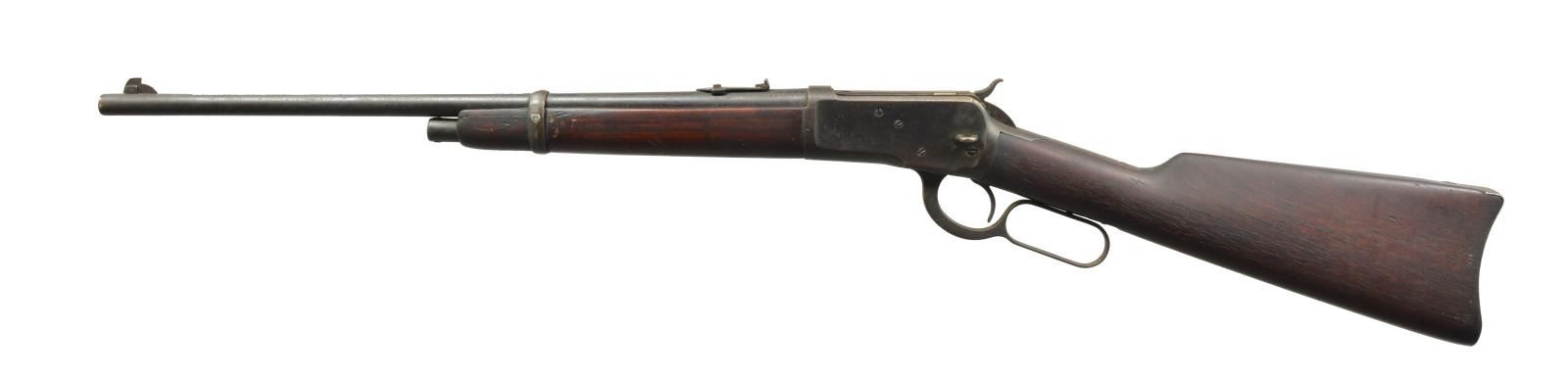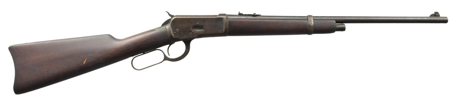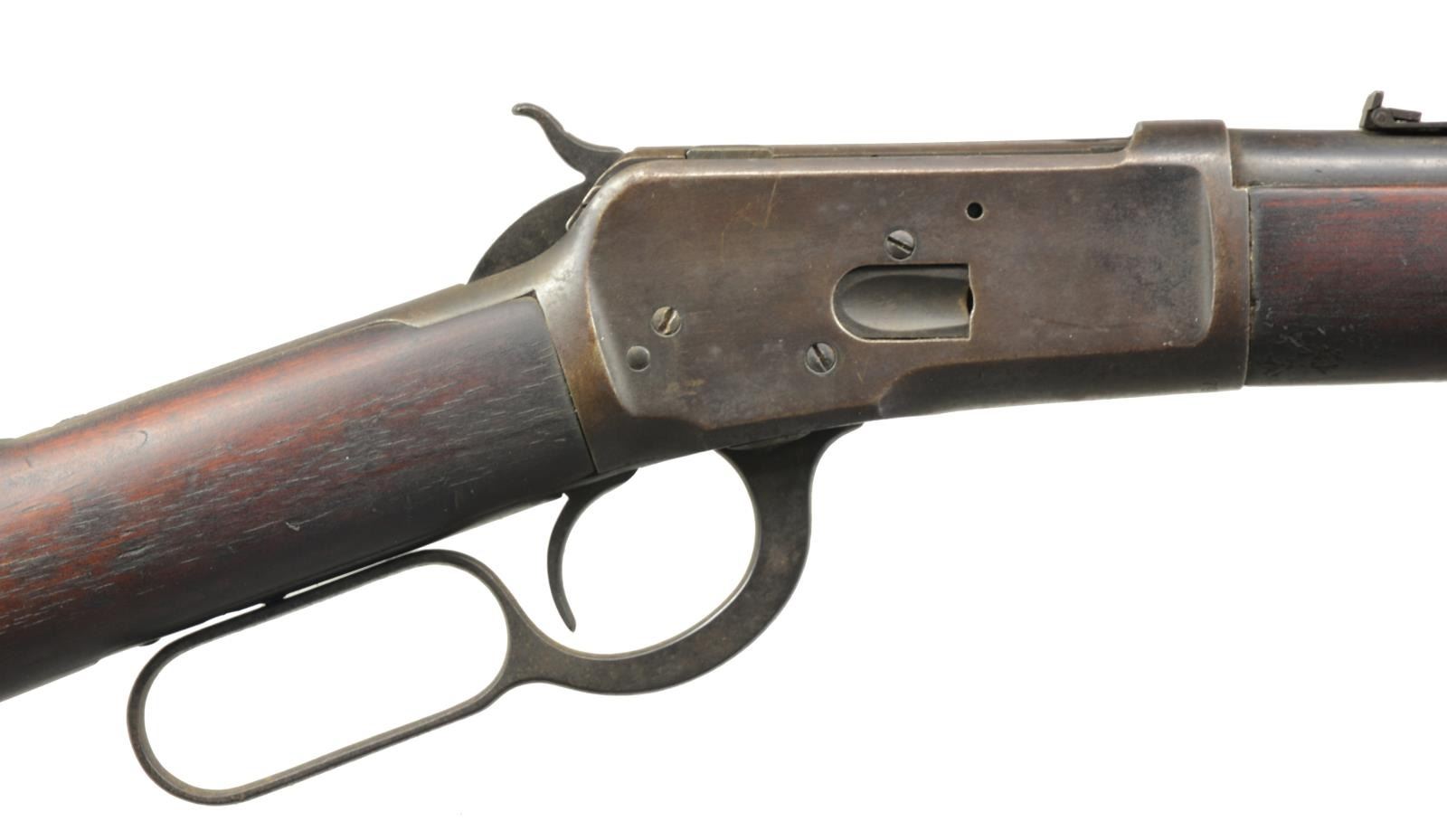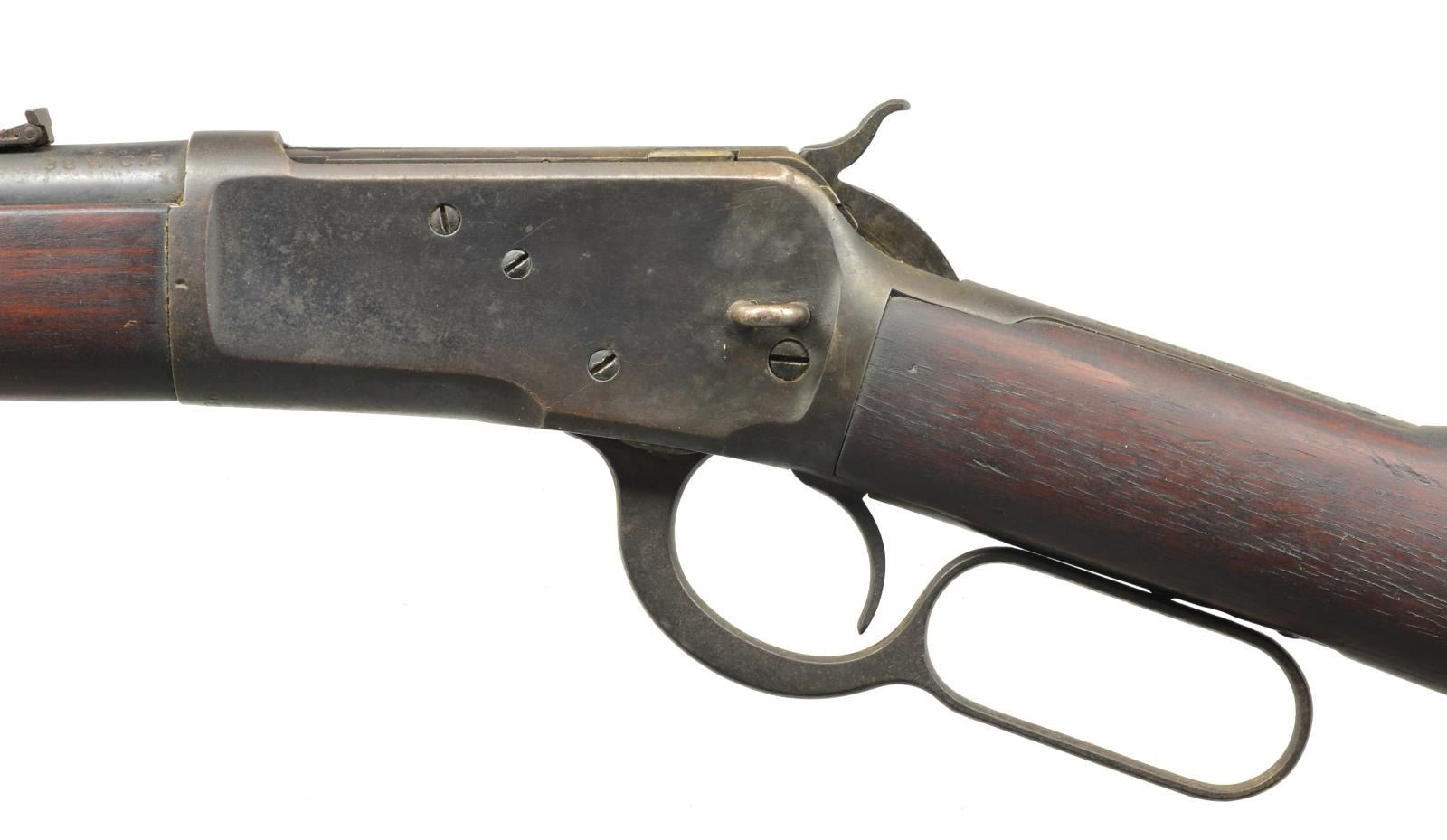 Cal. 38 WCF (38-40). S# 790036. Bbl. 20" of carbine style w/ replacement pinned blade front sight & express rear sight having broken leaf. Mag. has been shortened to half length. Left side of action has staple for saddle ring. Carbine forearm & straight grip stock w/ steel carbine buttplate. 1916 Mfg. CONDITION: metal retains 70% dull fading blue showing surface corrosion & light pitting. Refinished wood has dark worn appearance w/ dents & marks. Bore retains lightly worn rifling showing some light pitting. (20-2726/DS). CURIO. $600-900.