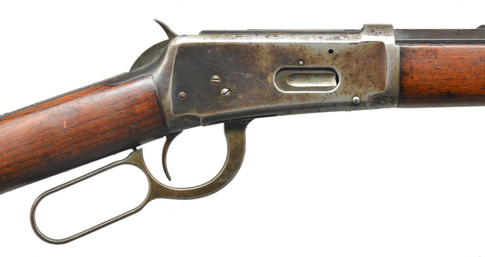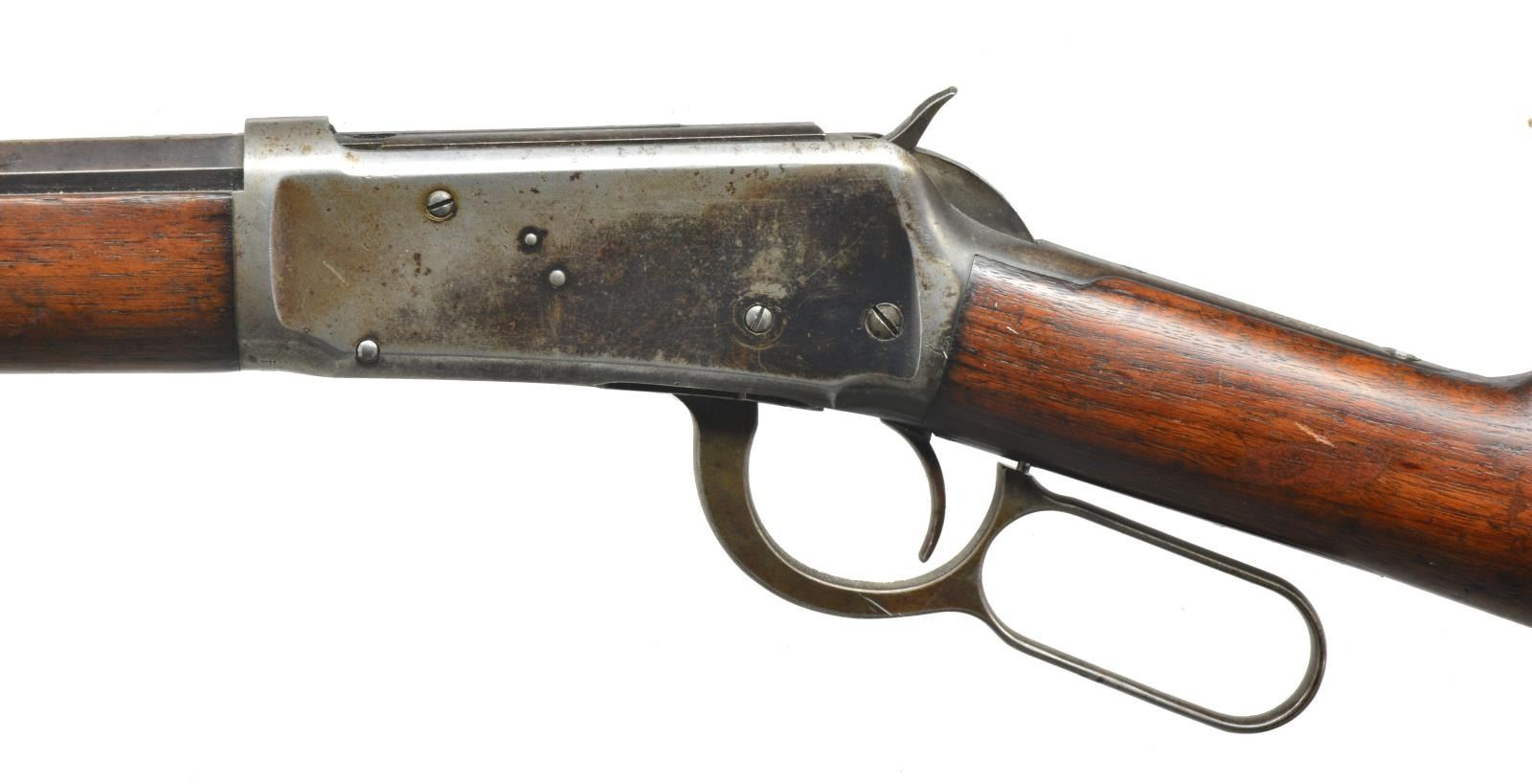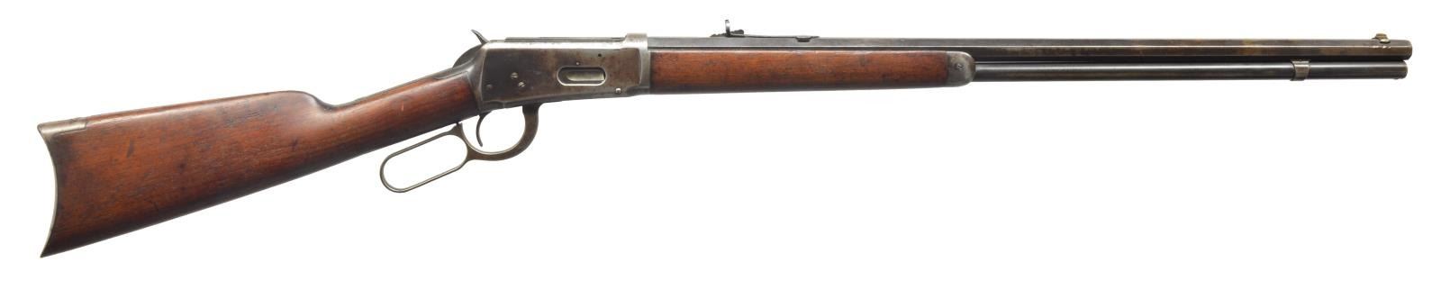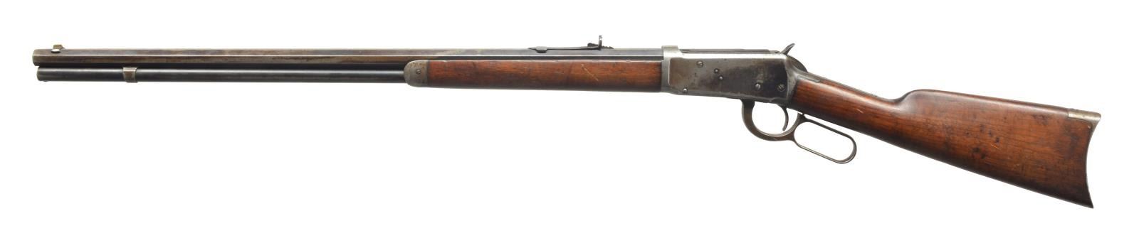 Cal. 32-40. S# 291704. Bbl. 24" oct. w/ sporting sight. Full length mag. Walnut forearm & straight grip stock w/ crescent steel buttplate. 1905 Mfg. CONDITION: bbl. & mag. tube retain 60% dull faded blue. Action retains 50% dull blue fading to gray showing spots of corrosion. Wood has dark worn finish showing numerous scratches, dents & handling marks. Dark bore w/ heavily worn rifling. (20-3541/DS). CURIO. $900-1,200.