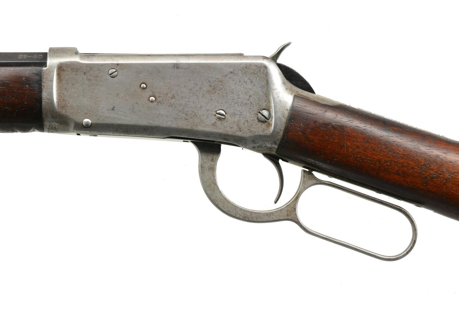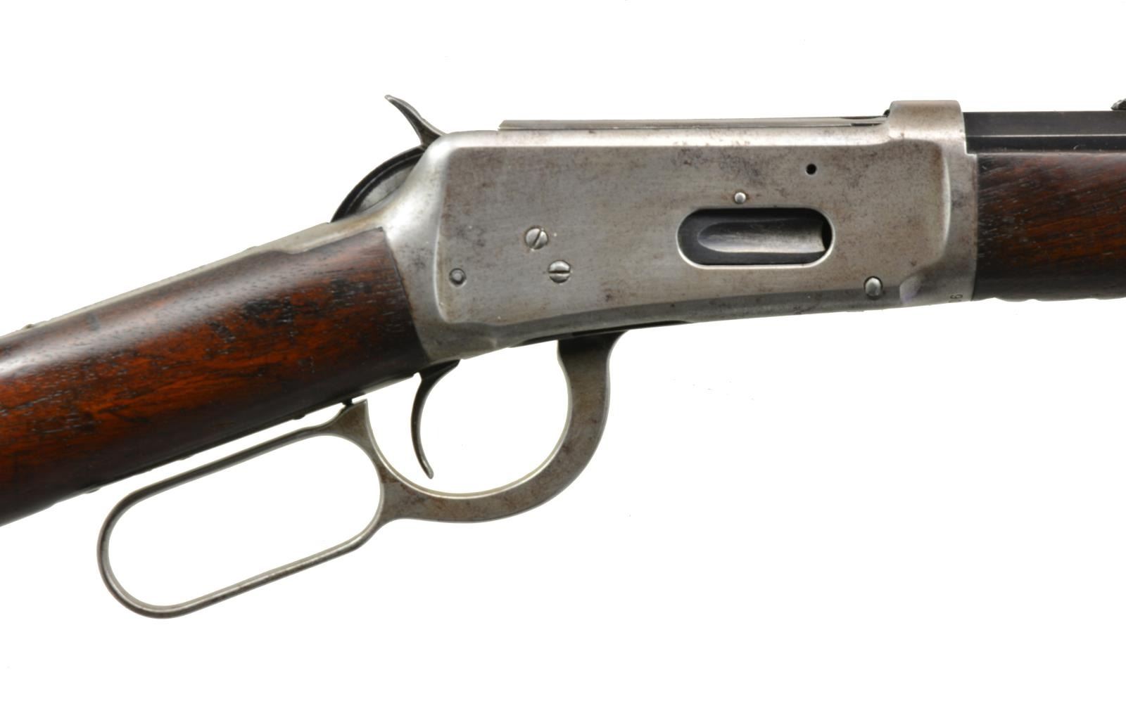 Cal. 32-40. S# 901770. Bbl. 26" oct. w/ sporting front sight & flat top sporting rear sight. Full length mag. Walnut forearm & straight grip stock w/ crescent steel buttplate. Bottom of forearm forward of action has 4 deeply cut notches. Mfg. 1920. CONDITION: bbl. & mag. tube retain 75% lightly faded blue showing areas of wear & scattered spots of very light pitting. Action has faded to gray showing scattered light pitting. Stocks have worn aged appearance w/ dents, scratches & handling marks. Sound mechanics. Bore has slightly darkened appearance over lightly worn rifling. (20-1790/DS). CURIO. $700-1,000.
