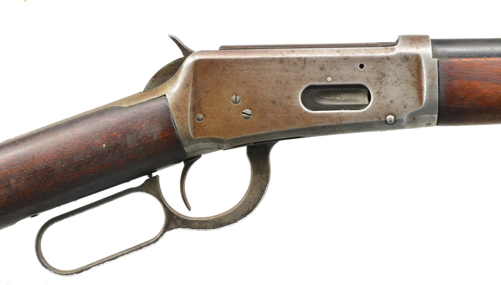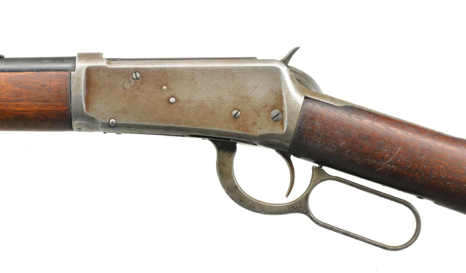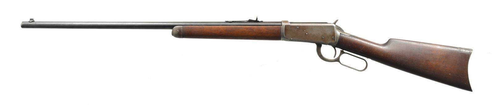 Cal. 32 WS. S# 463784. Bbl. 26" rnd. w/ Lyman replacement front sight having a broken bead & Marbles replacement elevator adj. rear sight. Button mag. Walnut forearm & straight grip stock w/ crescent steel buttplate. 1908 Mfg. CONDITION: bbl. retains 50% dull fading blue showing scattered spots of light pitting. Action has faded to gray brown showing light pitting. Forearm is heavily sanded & rounded at metal showing scratches & marks. Refinished stock shows scattered marks w/ sm. chips at action. Bore has worn rifling w/ scattered pitting. (20-2724/DS). CURIO. $600-900.