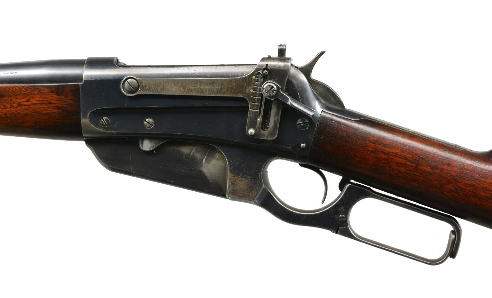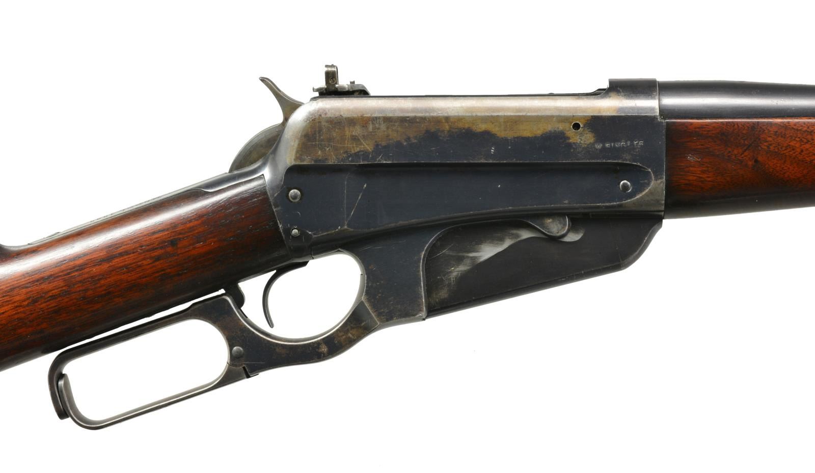 Cal. 30 US (30-40 Krag). S# 50063. Bbl. 28" tapered rnd. w/ pinned blade front sight, elevator adj. sporting rear sight & Lyman No. 21 "Climbin Lyman" receiver sight. Right side of receiver is stamped "W SINGLES". Ebony tipped Schnabel forearm & straight grip walnut stock w/ crescent steel buttplate. 1905 Mfg. CONDITION: bbl. & action retain over 80% lightly faded blue w/ area of flaking on upper right side of receiver. Stocks have lightly worn finish showing scattered scratches & marks. Sound mechanics. Bore is bright w/ sound rifling. (20-1901/DS). CURIO. $1,750-2,500.