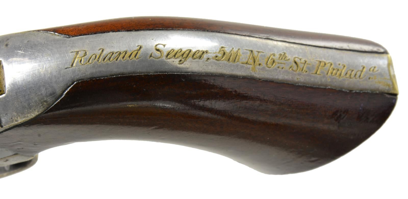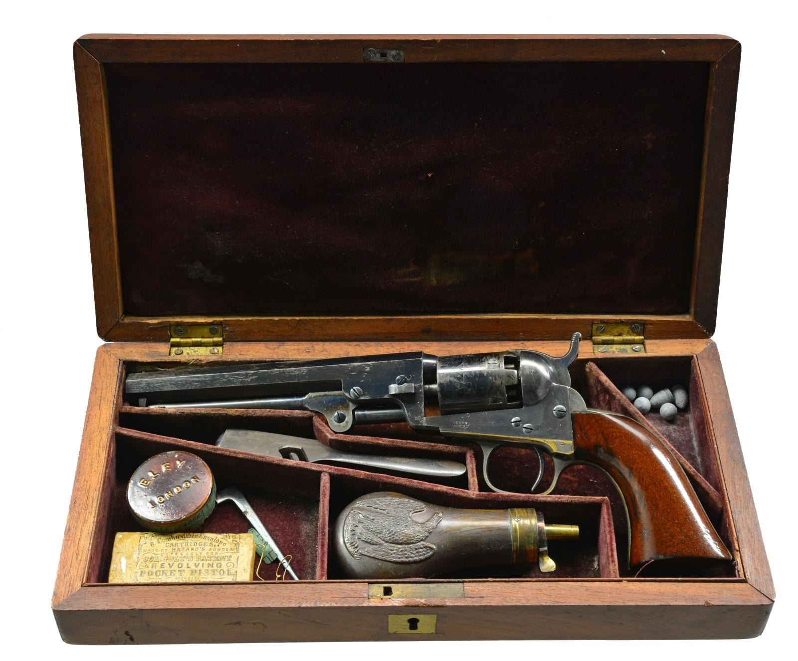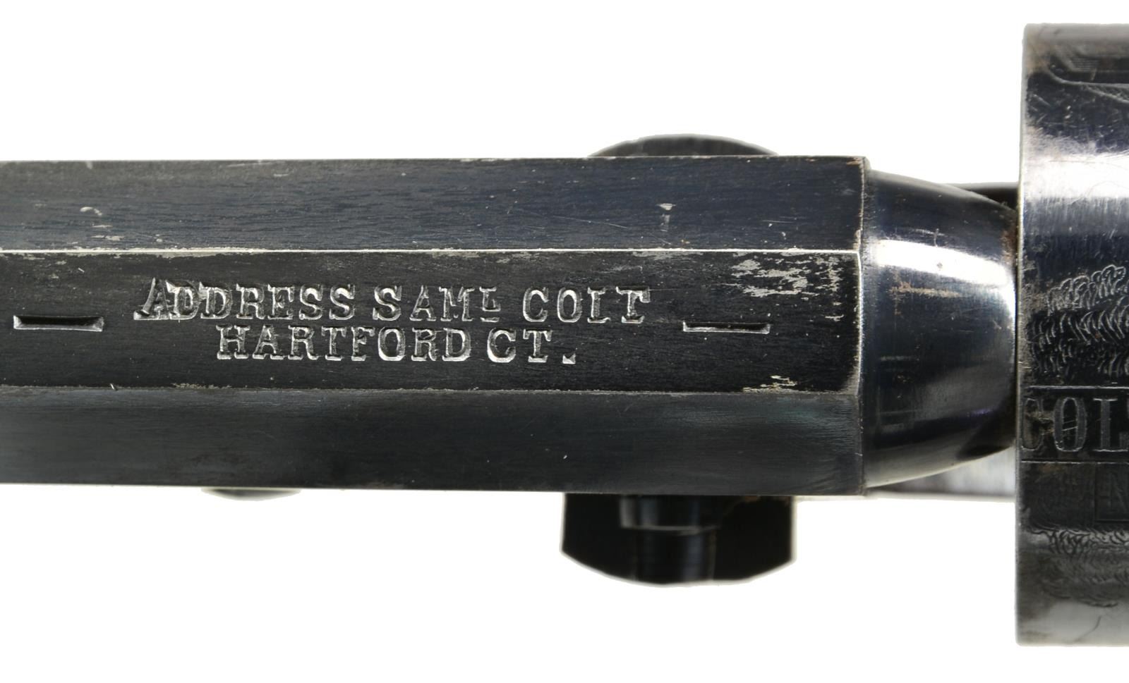 TO LIEUTENANT ROLAND H. SEEGER OF THE 15TH PENNSYLVANIA CAVALRY. Cal. 31. S# 203962. Oct. bbl. measures approx. 6". Marked on the top “ADDRESS SAML COLT HARTFORD CT.”. 6 Shot roll engraved cyl. marked “COLT’S PATENT NO. 203962”. Blue & case colored finish w/ silver plated brass trigger guard & grip straps. Backstrap is engraved, “Roland Seeger, 511 N. 6th St. Philada.”. All parts including the wedge have matching serial numbers. Original 1 piece walnut grips. Lt. Roland H. Seeger served in Company I of the 15th Pennsylvania Cavalry from Nov. 1861 to Apr. 1863. He was born a Quaker in Philadelphia in 1838 and the family trade was carriage making. At the outbreak of hostilities, Seeger joined an independent cavalry company named the Anderson Troop. Many officers & men from the Anderson Troop were selected to become the core of the newly formed 15th Pennsylvania Cavalry. The 15th initially saw service at Antietam prior to formal training & selection of officers. They were later engaged near Nashville, TN during the Stones River Campaign & served primarily in the states of Tennessee & Kentucky prior to Lt. Seeger’s discharge in early 1863. UNATTACHED ACCESSORIES: correct original Colt case w/ fitted maroon velour interior. The case contains a 2 cavity signed Colt bullet mold, a Colt American eagle embossed powder flask, a tin of caps by Ely London, a nipple wrench, 7 rnd. & 3 conical bullets plus an original package of pistol cartridges w/ a label that reads in part, “6 Combustible Envelope CARTRIDGES… COL. COLT’S PATENT REVOLVING POCKET PISTOL…”. A lg. binder containing information on Lieutenant Roland Seeger & the 15th Pennsylvania Cavalry. CONDITION: bbl. retains 80+% original blue w/ a couple of minute dings around the wedge. Cyl. scene is quite sharp w/ 70% original blue showing some wear around the nipples. Frame & loading lever show vibrant case colors. Grips have nearly complete finish. Silver plating on backstrap is 85% intact. Engraving is sharp & easily read. There is minor wear around the base of the grips. Near excellent bore. Case shows light wear overall but has a crack that runs the length of the top near the hinge. Accessories show light to moderate wear. PROVENANCE: From the Renowned Collection of Allen & Robin Wandling. (01-17987/BF). ANTIQUE. $7,000-9,000.