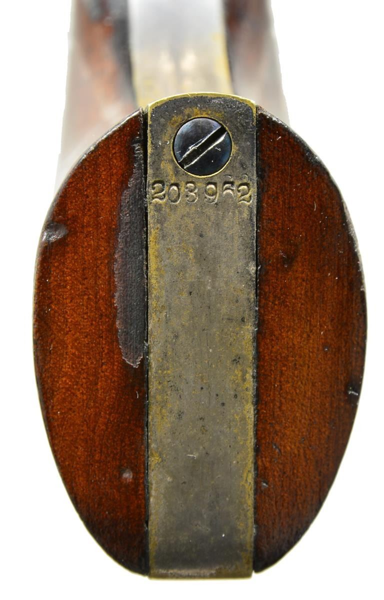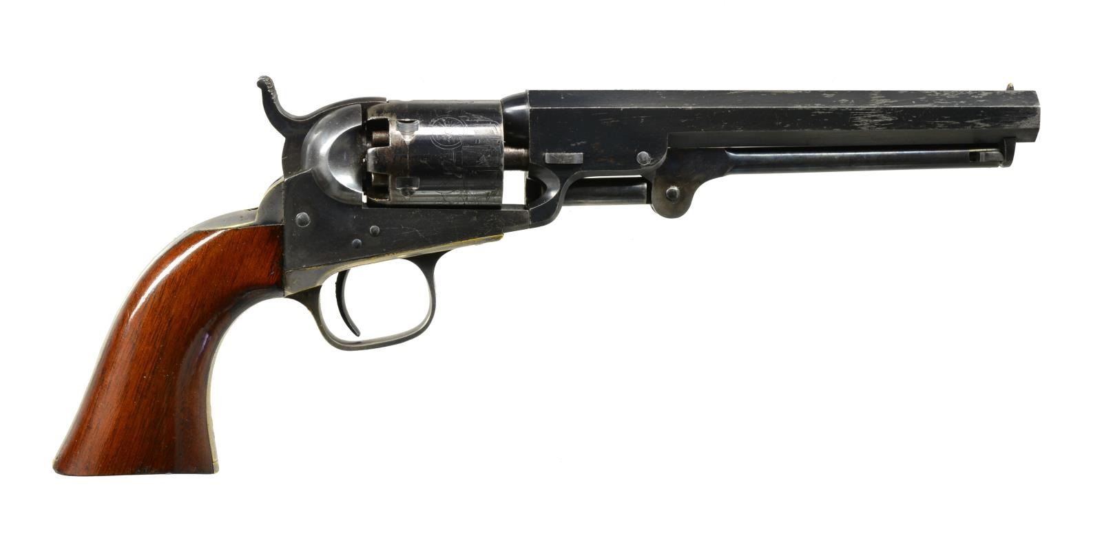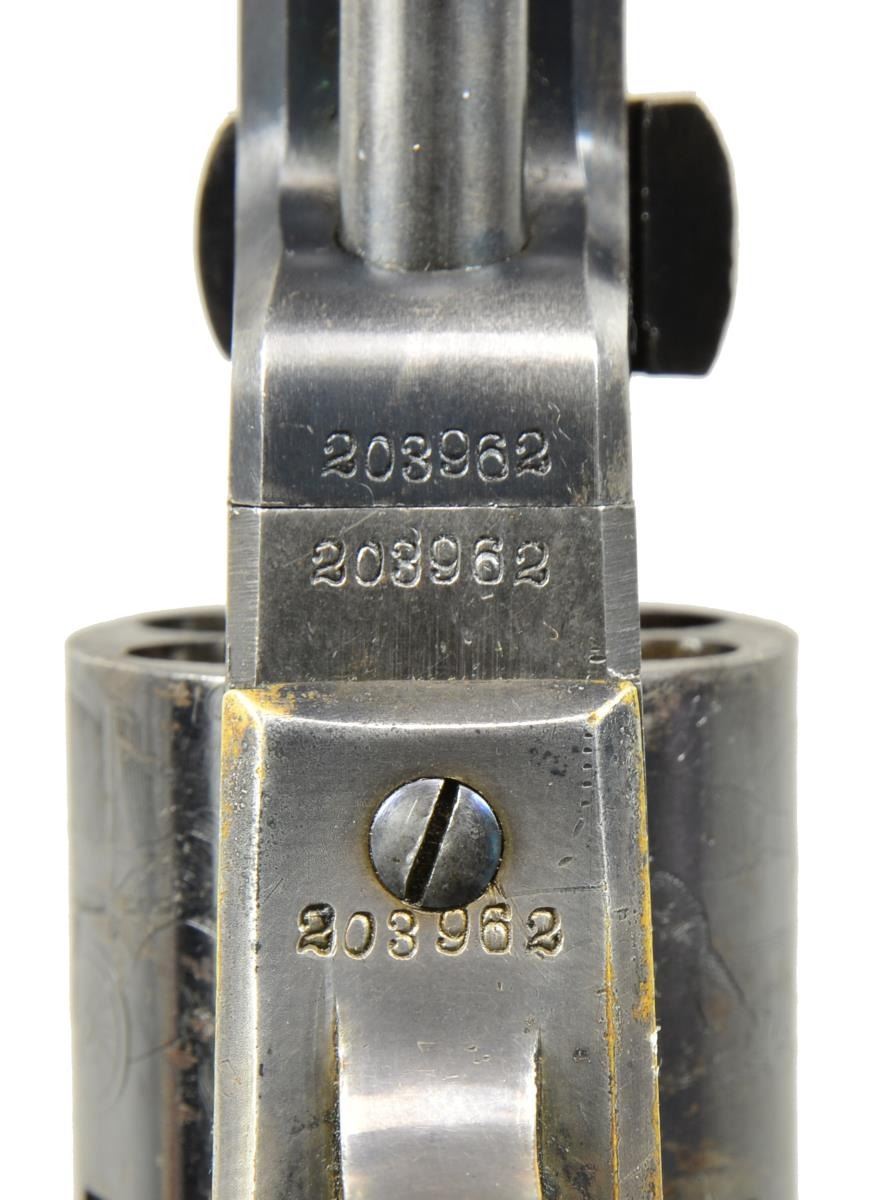 TO LIEUTENANT ROLAND H. SEEGER OF THE 15TH PENNSYLVANIA CAVALRY. Cal. 31. S# 203962. Oct. bbl. measures approx. 6". Marked on the top “ADDRESS SAML COLT HARTFORD CT.”. 6 Shot roll engraved cyl. marked “COLT’S PATENT NO. 203962”. Blue & case colored finish w/ silver plated brass trigger guard & grip straps. Backstrap is engraved, “Roland Seeger, 511 N. 6th St. Philada.”. All parts including the wedge have matching serial numbers. Original 1 piece walnut grips. Lt. Roland H. Seeger served in Company I of the 15th Pennsylvania Cavalry from Nov. 1861 to Apr. 1863. He was born a Quaker in Philadelphia in 1838 and the family trade was carriage making. At the outbreak of hostilities, Seeger joined an independent cavalry company named the Anderson Troop. Many officers & men from the Anderson Troop were selected to become the core of the newly formed 15th Pennsylvania Cavalry. The 15th initially saw service at Antietam prior to formal training & selection of officers. They were later engaged near Nashville, TN during the Stones River Campaign & served primarily in the states of Tennessee & Kentucky prior to Lt. Seeger’s discharge in early 1863. UNATTACHED ACCESSORIES: correct original Colt case w/ fitted maroon velour interior. The case contains a 2 cavity signed Colt bullet mold, a Colt American eagle embossed powder flask, a tin of caps by Ely London, a nipple wrench, 7 rnd. & 3 conical bullets plus an original package of pistol cartridges w/ a label that reads in part, “6 Combustible Envelope CARTRIDGES… COL. COLT’S PATENT REVOLVING POCKET PISTOL…”. A lg. binder containing information on Lieutenant Roland Seeger & the 15th Pennsylvania Cavalry. CONDITION: bbl. retains 80+% original blue w/ a couple of minute dings around the wedge. Cyl. scene is quite sharp w/ 70% original blue showing some wear around the nipples. Frame & loading lever show vibrant case colors. Grips have nearly complete finish. Silver plating on backstrap is 85% intact. Engraving is sharp & easily read. There is minor wear around the base of the grips. Near excellent bore. Case shows light wear overall but has a crack that runs the length of the top near the hinge. Accessories show light to moderate wear. PROVENANCE: From the Renowned Collection of Allen & Robin Wandling. (01-17987/BF). ANTIQUE. $7,000-9,000.