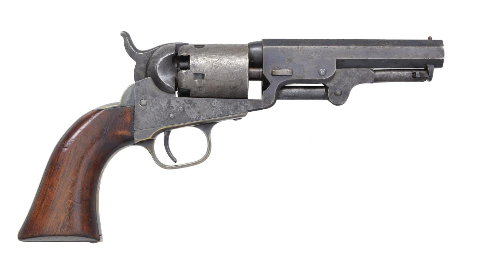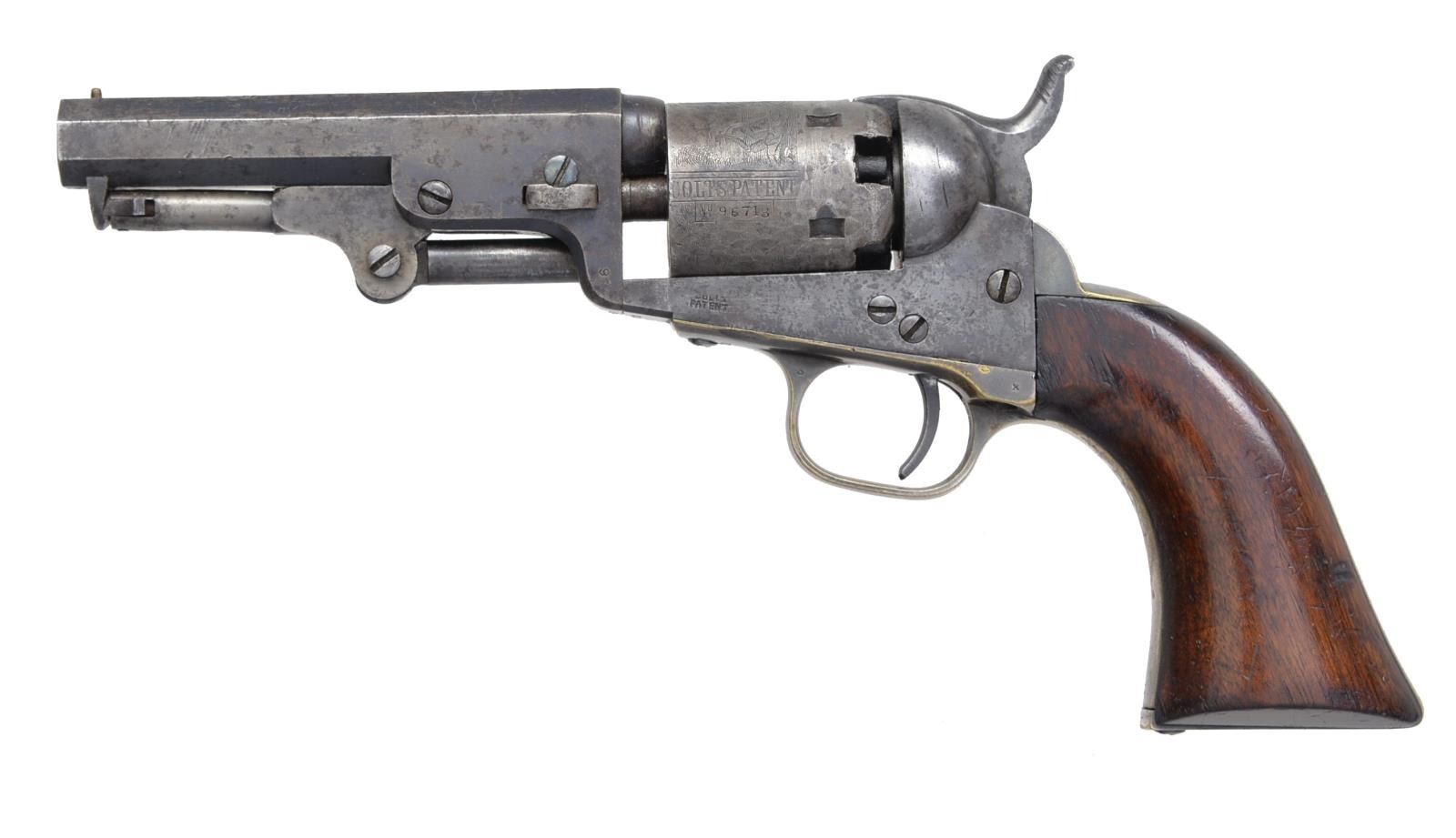 Cal. 31. S# 96718. Bbl. 4" oct. w/ brass bead sight & 2 line New York City address. 5 Shot rnd. roll engraved cyl. Silver finished brass back strap & sm. trigger guard. 1 Piece walnut grip. Bbl., frame, grip straps, cyl., loading lever & wedge have matching numbers. 1854 Mfg. CONDITION: bbl. retains 30% dull faded blue showing scattered light pitting & sm. dents. Cyl. has faded to gray retaining 60% scene showing light dents. Receiver has faded to gray. Grip straps retain 75% nickel finish having acquired a dark tarnish. Age darkened grips show light wear w/ scattered handling marks. Good mechanics. Bore retains sound rifling showing some light pitting. PROVENANCE: Collection of Alan Bradley Shepherd. (01-18658/DS). ANTIQUE. $500-800.