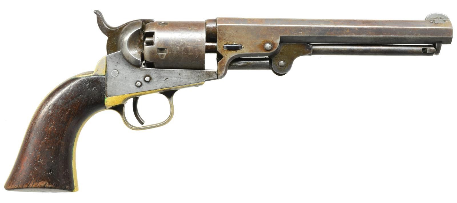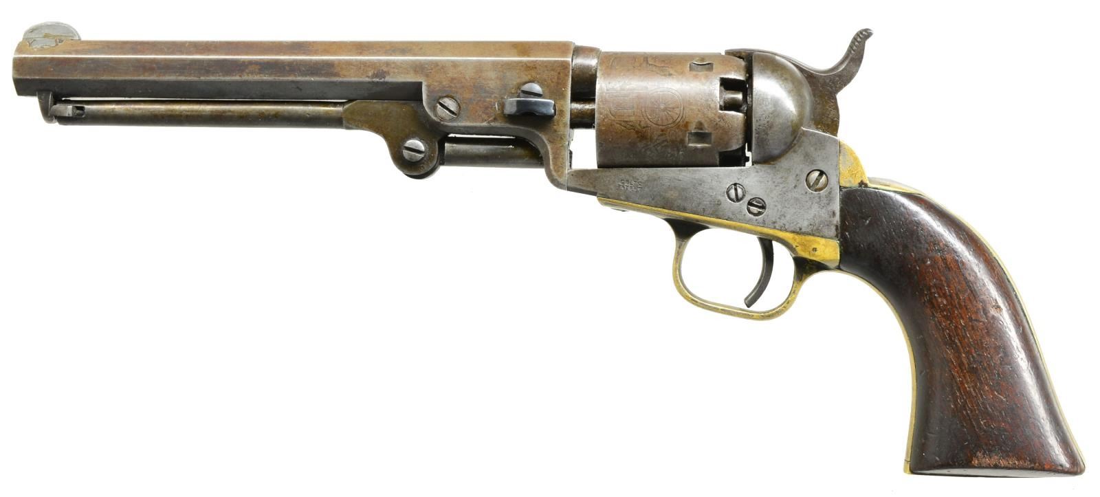 Cal. 31. S# 68369. Bbl. 6" oct. w/ 2 line New York city address. Added dovetail mounted front sight. 5 Shot rnd. roll engraved cyl. Silver finished brass back strap & sm. trigger guard. 1 Piece walnut grip. Bbl., frame, grip straps, cyl. & loading lever have matching numbers. Replacement wedge. 1853 Mfg. CONDITION: metal finish has faded to light brown patina showing sm. handling marks w/ spots of corrosion. Cyl. retains 90% scene. Grip straps retain a sm. amount of silver finish in protected areas. Grips have dark worn appearance showing scratches, dents & handling marks. Cyl. does not always rotate when action is cycled. Loading lever has a very slight bend. Unusually good bore retaining strong rifling. PROVENANCE: Collection of Alan Bradley Shepherd. (01-18657/DS). ANTIQUE. $400-600.