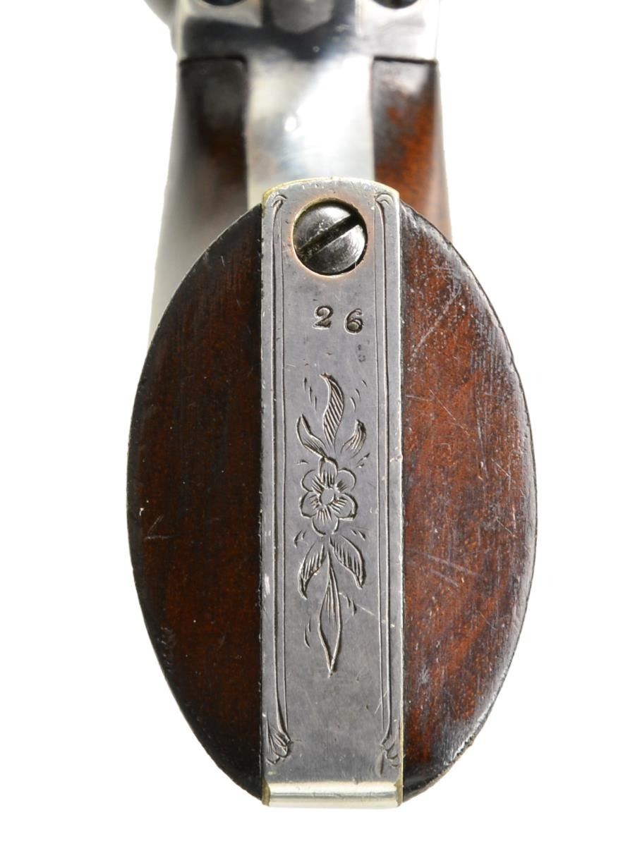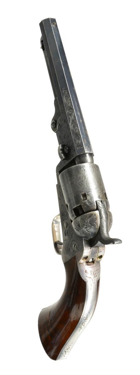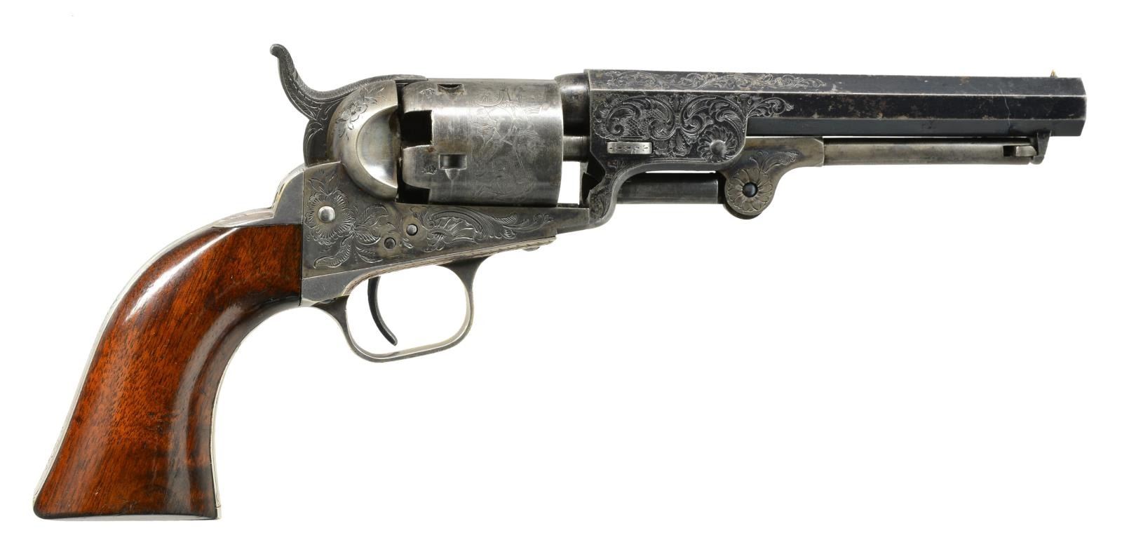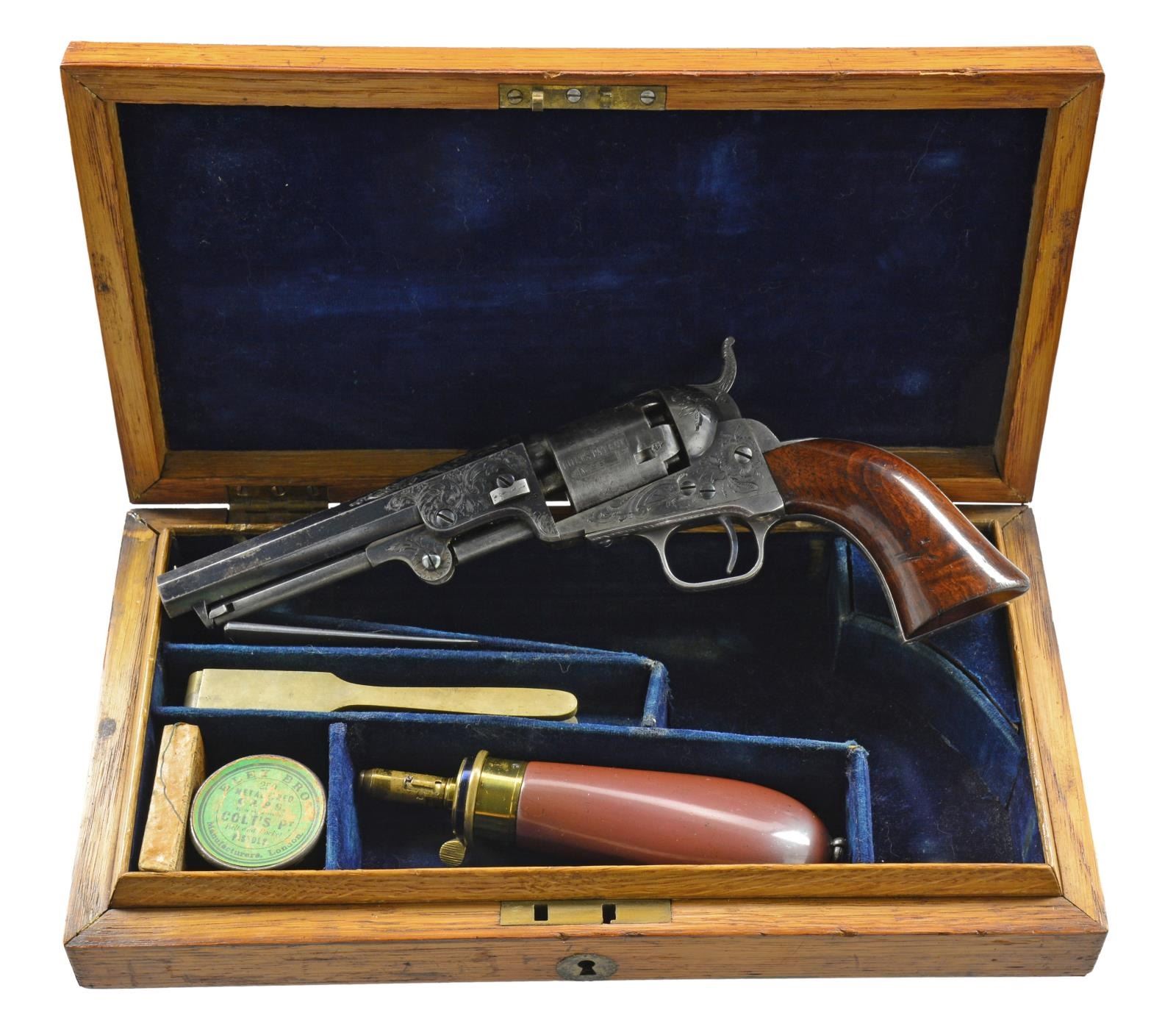 EXPOSITION, COLT LONDON POCKET MODEL PERCUSSION REVOLVER. Cal. 31. S# 26. Bbl. 5". This is a very rare and beautifully engraved Colt Model 1849 most likely made for the Dublin Exposition of 1853. The engraving style is unique with floral and rococo designs. The barrel address is hand engraved in unique small lettering not seen on any other revolver. London proofs were added after engraving as the normal proof on right side of barrel housing is found in unengraved area below wedge slot which is not noted on any other specimens. Deluxe grips are nicely burled with fine color. The casing also has unique carved mother of pearl flower shaped compartment knob not seen on any other specimen. Larry Wilson in his Colt Engraving text shows this gun and states there are three types of London engraving and cites this example as being the rarest if not unique. Gun appears original, complete and authentic as manufactured though serial number on cylinder does not match balance of gun though still two digits “95”. There are other Colt exhibition guns known with unserialized cylinders, this gun possibly was rushed for the exposition and this was the cylinder available. Most likely this is the only Model 1849 with this style of engraving as made for the Dublin Exposition in 1853 and this 2 digit gun was first year produced in London. UNATTACHED ACCESSORIES: rare early London oak casing; has no provision for cleaning rod, and no mortise cut for bullet mold sprue cutter. Case contains near new Dixon bag flask with virtually all of its original varnish, a 2-cavity "COLTS PATENT" brass bullet mold, L-shaped combination gun tool, original pack of caps with Eley Brothers paper label and original 5-cartridge pack of Colt cartridges. Also included in this lot is a copy of “Fine Colts, The Dr. Joseph A. Murphy Collection”. CONDITION: extremely fine overall, all matching with exception of cylinder as noted. Barrel retains about 95% bright blue finish with crisp markings. Cylinder has traces of thin blue with crisp, complete rolled “Stagecoach Holdup” scene with balance silver/blue patina. Frame and hammer retain most of their original muted case color with balance silver/gray. Trigger guard and backstrap retain virtually all their silver plate. Grips retain virtually all their original factory varnish with light edge wear and a few sm. dents. Accompanying case is very good overall with vacant scalloped brass plaque, blue velvet interior is very good with light fading, there are several repairs to velvet lining wear worn through apparently in revolver compartment, sides to lidded compartment are bowed out slightly with old glued repair. Mold and gun tool are both very good and smooth overall, gun tool retains about half its finish. Cap tin is empty but discernable label, cartridge pack is very good and complete. The pre-Colt contract Dixon flask is excellent retaining virtually all varnish & bright fire blue to spring. PROVENANCE: Raymond Kendall Collection; pictured on pages 230, 239 & 240 of Wilson’s “Colt Engraving Book Volume I” (Though Wilson misidentifies serial number); Pictured on page 87 of the 1999 “Fine Colts, The Dr. Joseph A. Murphy Collection” as frontis showing this example as epitome of English engraving of London Colts. (01-17677/JS). ANTIQUE. $20,000-25,000.