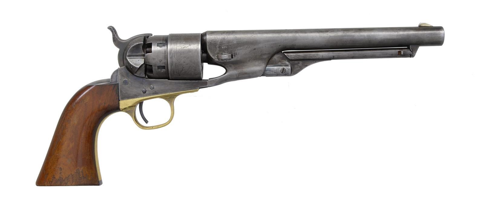 Cal. 44. S# 149453. Bbl. 8" rnd. w/ German silver blade front sight & New York address. 6 Shot rebated cyl. w/ Naval scene roll engraving. Blue & case colored finish has provision for shoulder stock attachment. Brass trigger guard. 1 Piece walnut grips. Bbl., frame, grip straps, cyl. & wedge have matching numbers. Bbl., frame & grip straps have "S" (Saunders) inspection marks. Cyl. has "A" (Ainsworth). Inspector marks. 1863 Mfg. CONDITION: metal has a mottled gray appearance from cold blue application. Brass trigger guard is brightly cleaned. Wedge screw, hammer screw & other screws are replacement. Grips have worn & peeling finish showing handling marks. Sound mechanics. Bore retains lightly worn rifling showing spots of pitting. PROVENANCE: Collection of Alan Bradley Shepherd. (01-18645/DS). ANTIQUE. $800-1,200.