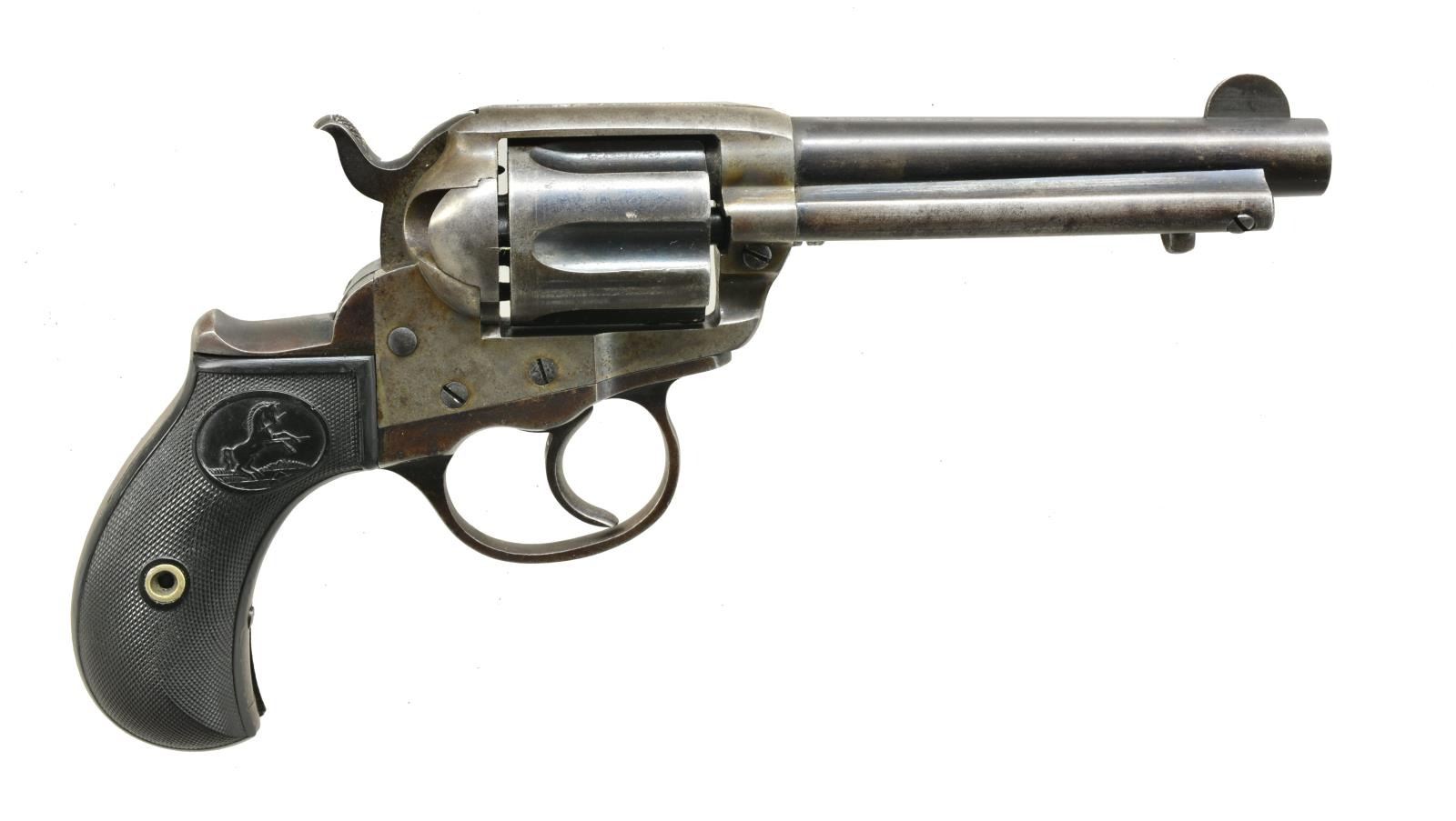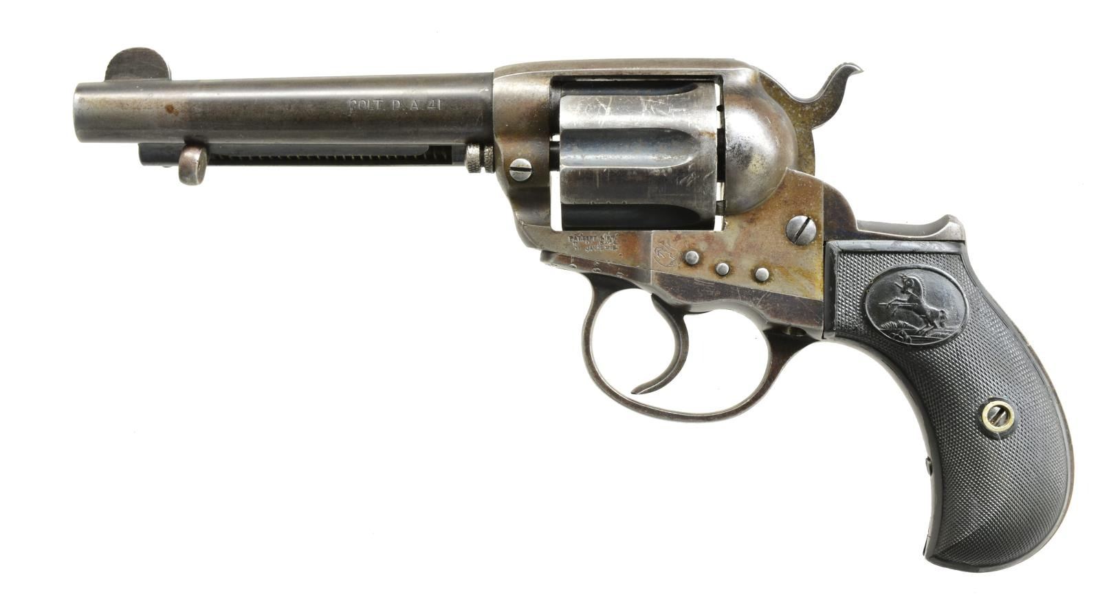 Cal. 41 Colt. S# 130222. Bbl. 4 1/2" w/ semicircular front sight. 6 Shot fluted cyl. Blue finish w/ case colored frame. 2 Piece replacement checkered hard rubber Rampant Colt bird's head grips. 1901 Mfg. CONDITION: bbl., cyl. & frame retain 40% dull fading blue. Action retains traces of case colors in protected areas. Grips have slightly proud fit. Sound action. Bore retains sound rifling. PROVENANCE: Collection of Alan Bradley Shepherd. (20-4075/DS). CURIO. $500-800.