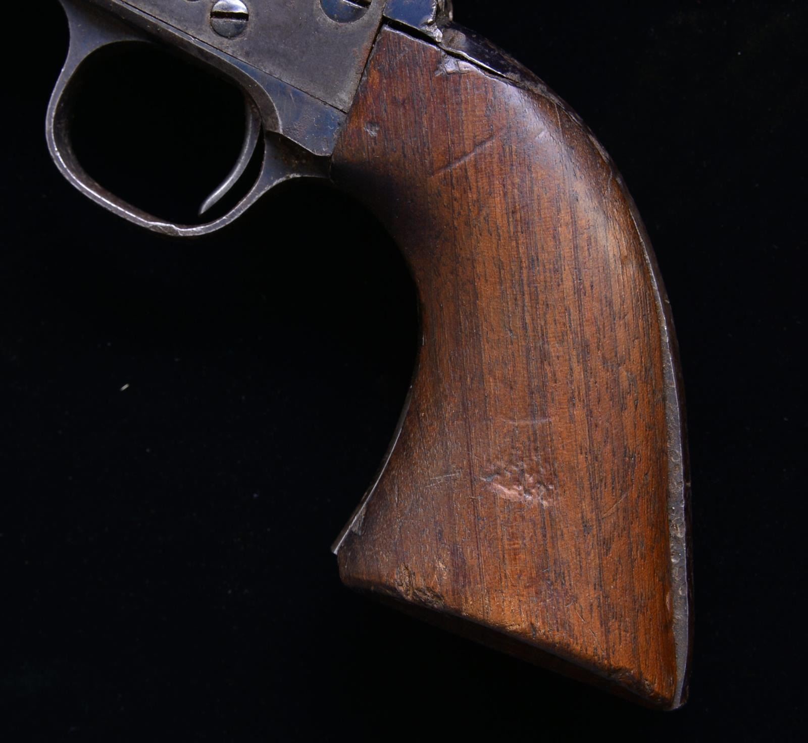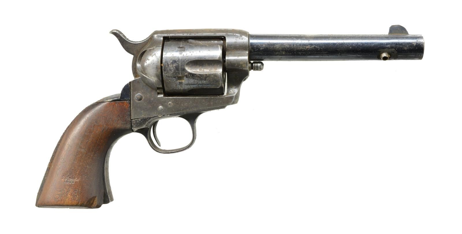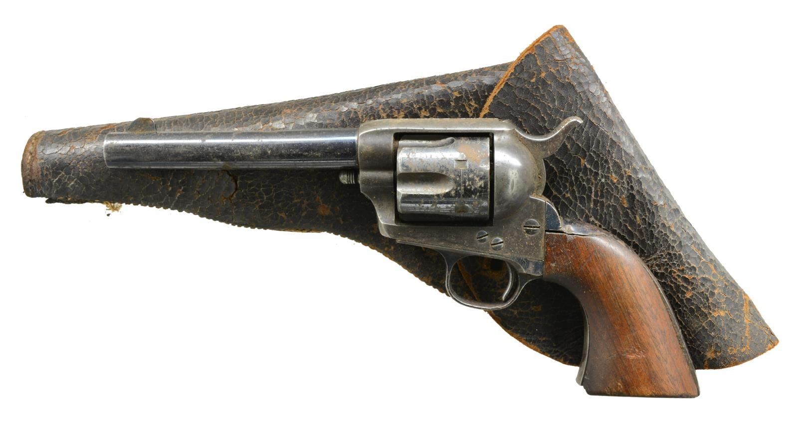 Cal. 45 Colt. S# 134295. Bbl. shortened to 5 1/2" w/ blade front sight. Artillery Model revolver arsenal shortened from 7 1/2" Cavalry model. Black powder frame numbered "134295" w/ "RAC" inspectors mark. Trigger guard numbered "134167". Bbl. numbered "9742" Unnumbered cyl. Back of backstrap is broken off w/ no remaining number. Ejector & ejector housing are missing. 1 Piece walnut grip w/ "RAC" inspector's mark at butt. Right side has "1903" date over "RAC" cartouche. UNATTACHED ACCESSORIES: leather flap holster showing heavy wear. Seams stitching are pulled loose. CONDITION: bbl. retains 80% lightly faded blue showing spots of surface corrosion & numerous dents. 1 Dent on top of bbl. & 1 near bottom of bbl. are very deep & visible inside bore that retains largely intact rifling. Front sight is bent. Frame retains some visible case colors blending w/ rust & surface corrosion. Cyl. retains 40% blue showing rust & having 2 dented, out of round, chamber walls. Trigger guard retains 40% blue w/ areas of fading, sm. dents & surface corrosion missing 1 screw. Back strap shows heavy dents & is broken w/ butt portion missing., only 1 attachment screw remains showing screwdriver distortion. Grips show wear & handling marks missing chips & having cracks at butt. Cyl. does not rotate when fired, action will not hold in cocked position. (01-18191/DS). ANTIQUE. $800-1,200.
