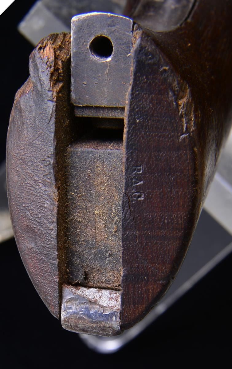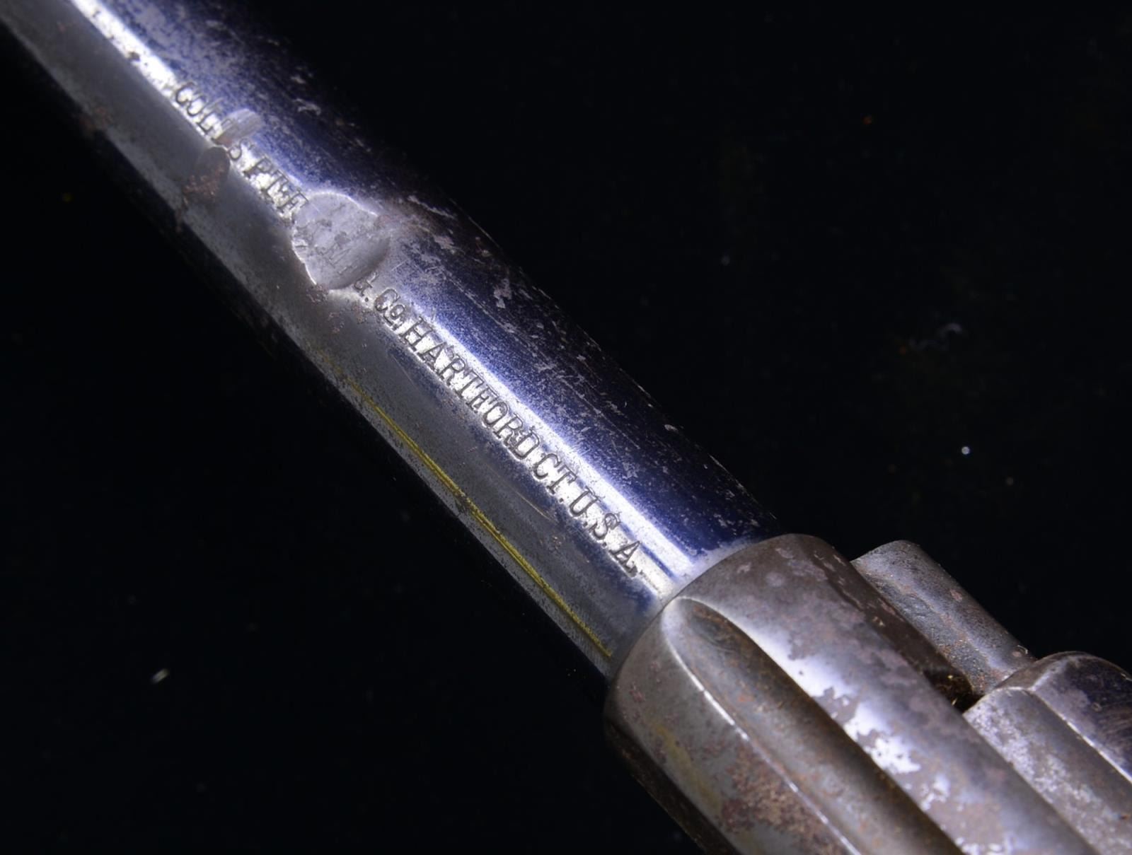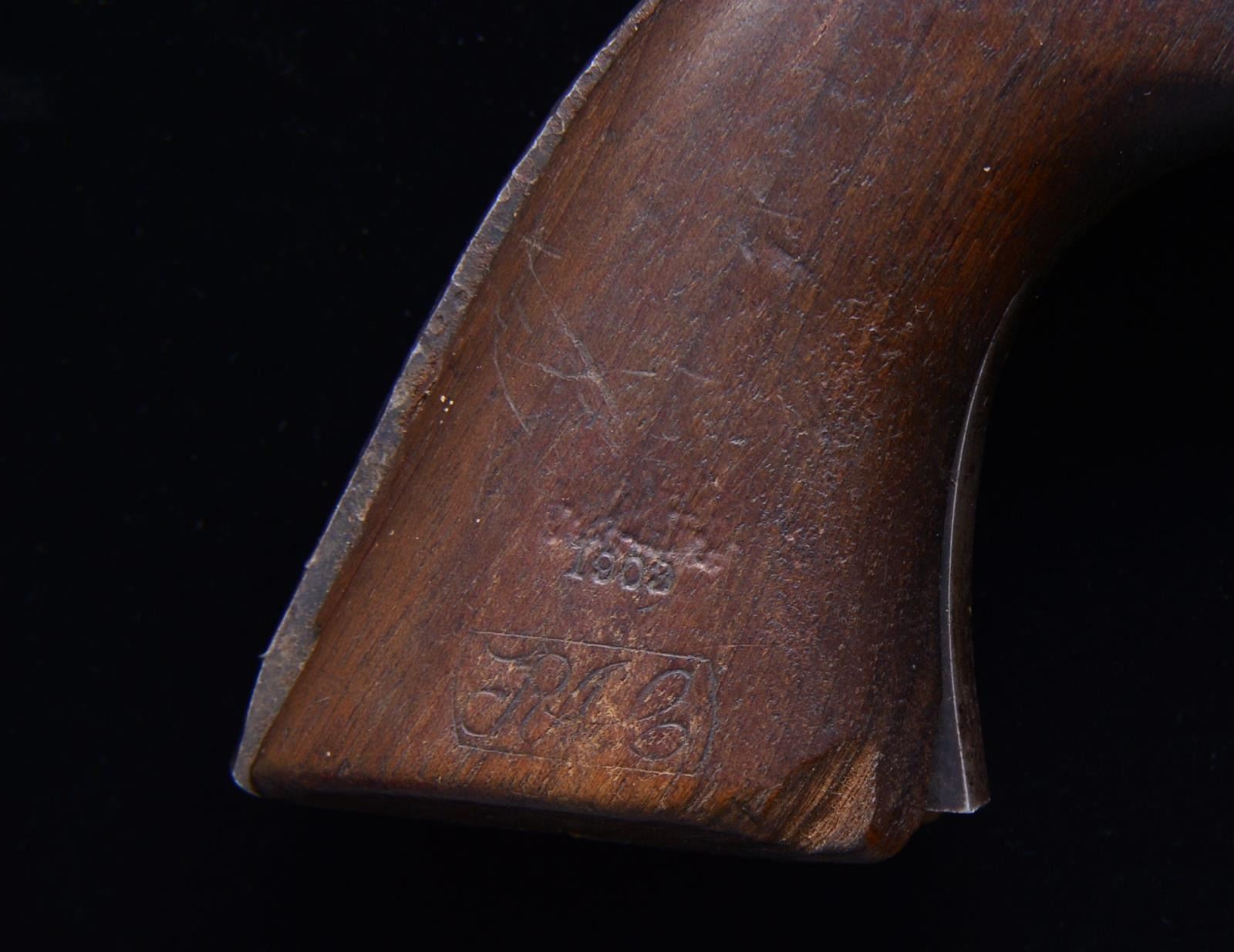 Cal. 45 Colt. S# 134295. Bbl. shortened to 5 1/2" w/ blade front sight. Artillery Model revolver arsenal shortened from 7 1/2" Cavalry model. Black powder frame numbered "134295" w/ "RAC" inspectors mark. Trigger guard numbered "134167". Bbl. numbered "9742" Unnumbered cyl. Back of backstrap is broken off w/ no remaining number. Ejector & ejector housing are missing. 1 Piece walnut grip w/ "RAC" inspector's mark at butt. Right side has "1903" date over "RAC" cartouche. UNATTACHED ACCESSORIES: leather flap holster showing heavy wear. Seams stitching are pulled loose. CONDITION: bbl. retains 80% lightly faded blue showing spots of surface corrosion & numerous dents. 1 Dent on top of bbl. & 1 near bottom of bbl. are very deep & visible inside bore that retains largely intact rifling. Front sight is bent. Frame retains some visible case colors blending w/ rust & surface corrosion. Cyl. retains 40% blue showing rust & having 2 dented, out of round, chamber walls. Trigger guard retains 40% blue w/ areas of fading, sm. dents & surface corrosion missing 1 screw. Back strap shows heavy dents & is broken w/ butt portion missing., only 1 attachment screw remains showing screwdriver distortion. Grips show wear & handling marks missing chips & having cracks at butt. Cyl. does not rotate when fired, action will not hold in cocked position. (01-18191/DS). ANTIQUE. $800-1,200.