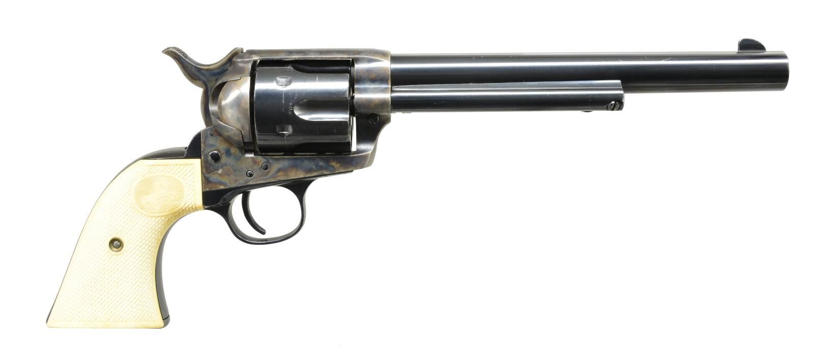 Cal. 38 WCF. S# 263156. Bbl. 7 1/2". 6 Shot fluted cyl. Blued & case colored finish. 2 Piece synthetic ivory checkered Rampant Colt grips. 1905 Mfg. CONDITION: bbl., cyl. & grip straps retain 90% reblued finish w/ spots of remaining pitting on grip straps. Cyl. has a drag line. Frame & hammer retain 95% recase colored finish. Action shows hammer & trigger wear. Bore retains strong rifling. PROVENANCE: Collection of Alan Bradley Shepherd. (20-4027/DS). CURIO. $1,200-1,800.