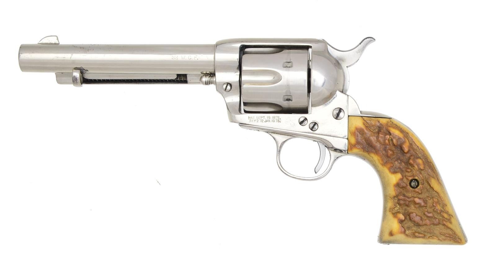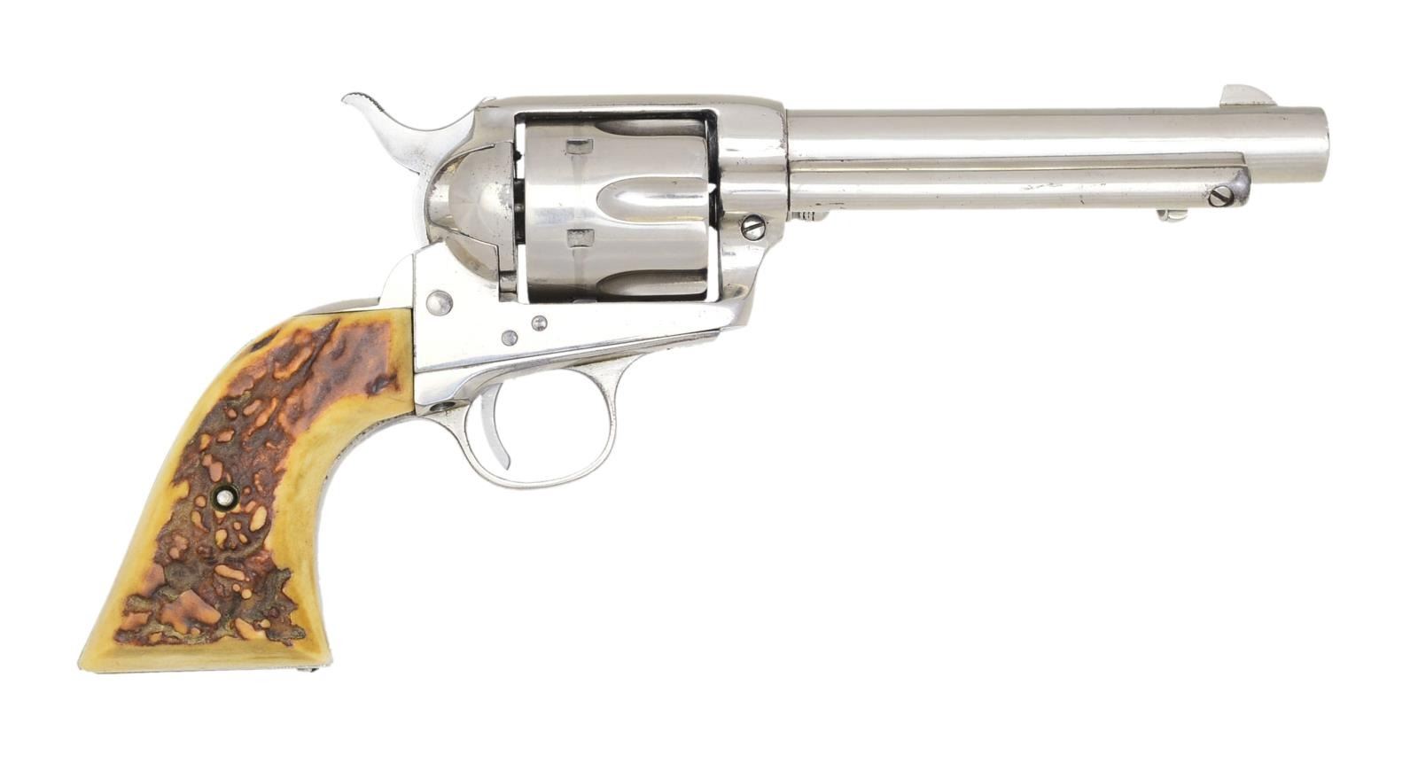 Cal. 32 WCF. S# 206022. Bbl. 5 1/2" w/ lowered blade front sight. 6 Shot fluted cyl. Renickeled finish w/ polished hammer & trigger. Custom aftermarket 2 piece stag grips. 1901 Mfg. CONDITION: over 95% renickeled finish. Grips show light wear. Action shows wear. Dark pitted bore w/ worn rifling. PROVENANCE: Collection of Alan Bradley Shepherd. (20-4032/DS). CURIO. $1,200-1,800.