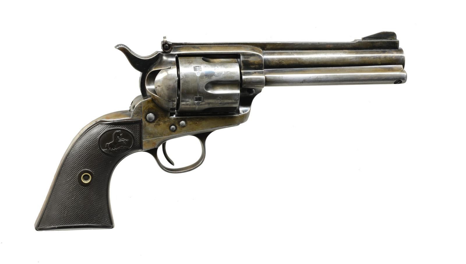 Cal. 22 LR. S# 296441. Bbl. 4 3/4" relined to 22 cal. Right side of bbl. is restamped "22" in front of original "COLT" marking. Ramp front sight on added solid rib that extends over receiver to adj. square notch rear sight. Cyl. is sleeve to 22 LR. Hammer is converted w/ a rimfire style firing pin. 2 Piece checkered hard rubber grips. CONDITION: metal has mottled gray coloration from cold blue application showing scattered spots of pitting & handling marks. Grips show light wear. Bore shows strong rifling. Hammer will not hold safely in cocked position. (20-4081/DS). CURIO. $1,000-1,500