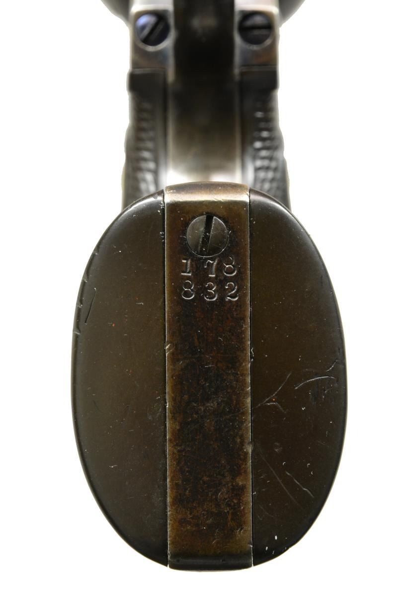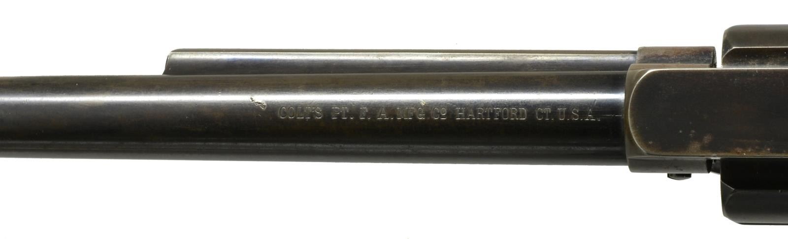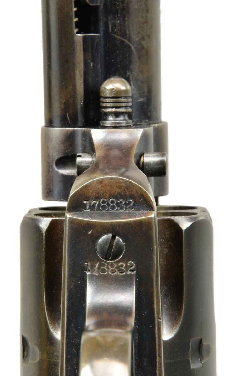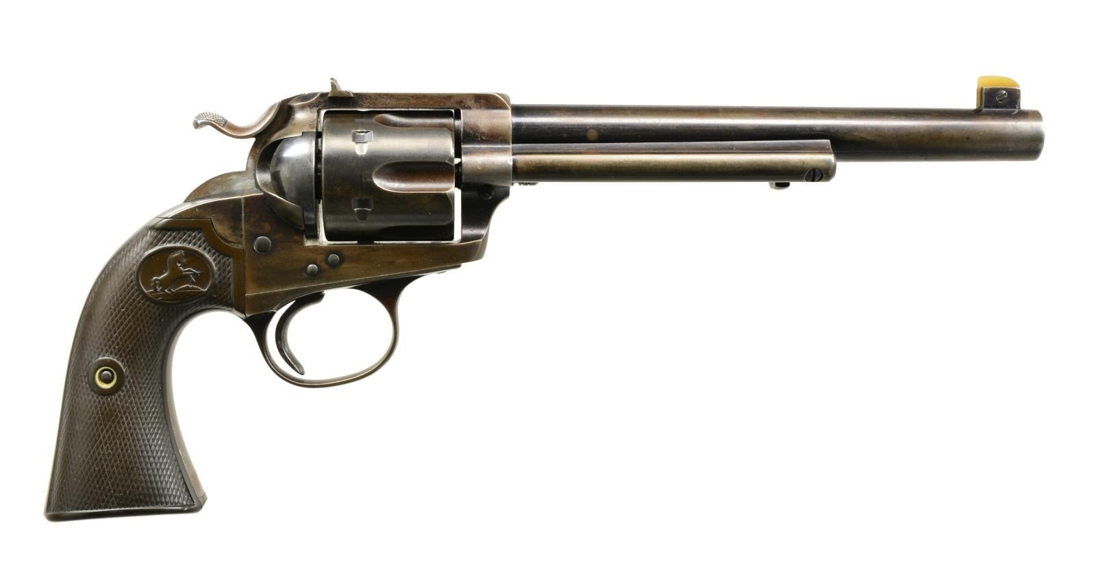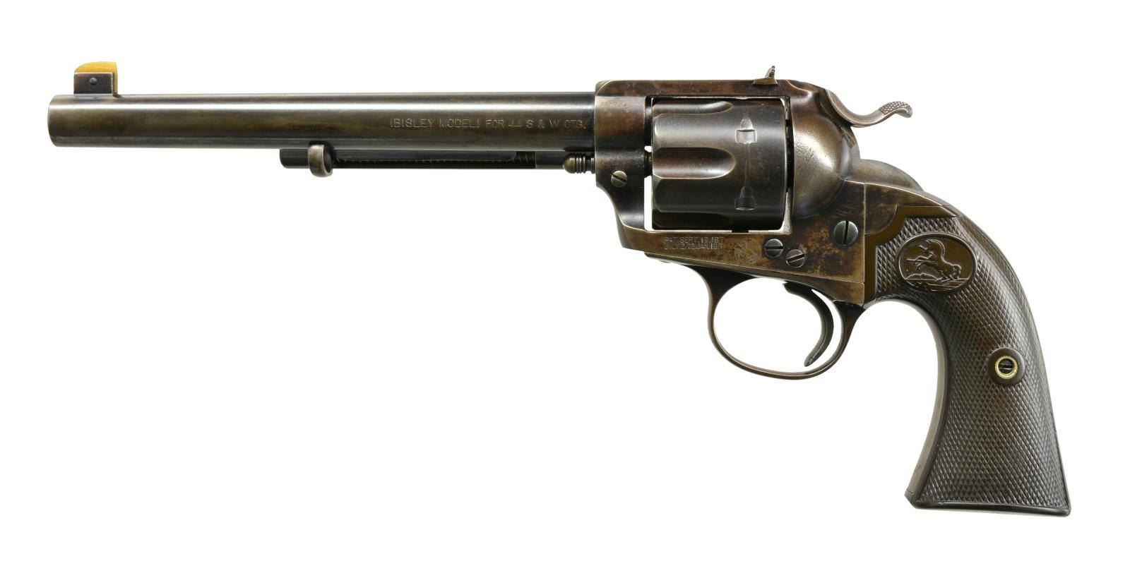 Cal. 44 S&W. S# 178832. Bbl. 7 1/2" marked "(BISLEY MODEL)" on left side. Pinned blade replacement front sight that appears to be bone. U notch rear sight. 6 Shot fluted cyl. Blue finish w/ case colored hammer. 2 Piece checkered hard rubber Rampant Colt grips. UNATTACHED ACCESSORIES: Colt Mfg. Co. letter stating the following information " Serial number: 178832 / Caliber: .44 S&W / Barrel Length: 7 1/2" / Finish: Blue / Type of Stocks: Rubber / Shipped to: Montgomery Ward and Company / Address: Chicago, Illinois / November 17, 1898 / Number of Same Type Guns in Shipment: 2". CONDITION: 40% dull blue fading to brown showing spots of light corrosion. Hammer retains traces of case colors in protected areas. Grips have worn checkering w/ handling marks at butt. Sound mechanics. Bore has dark frosted appearance w/ worn rifling showing spots of pitting. (01-17862). ANTIQUE. $7,000-11,000.