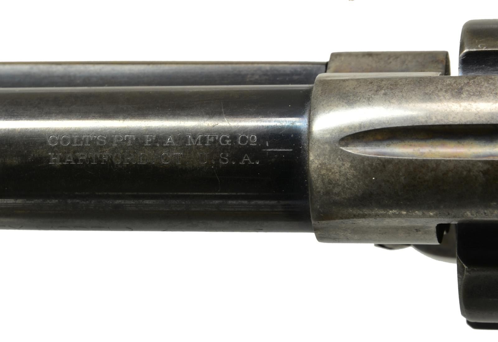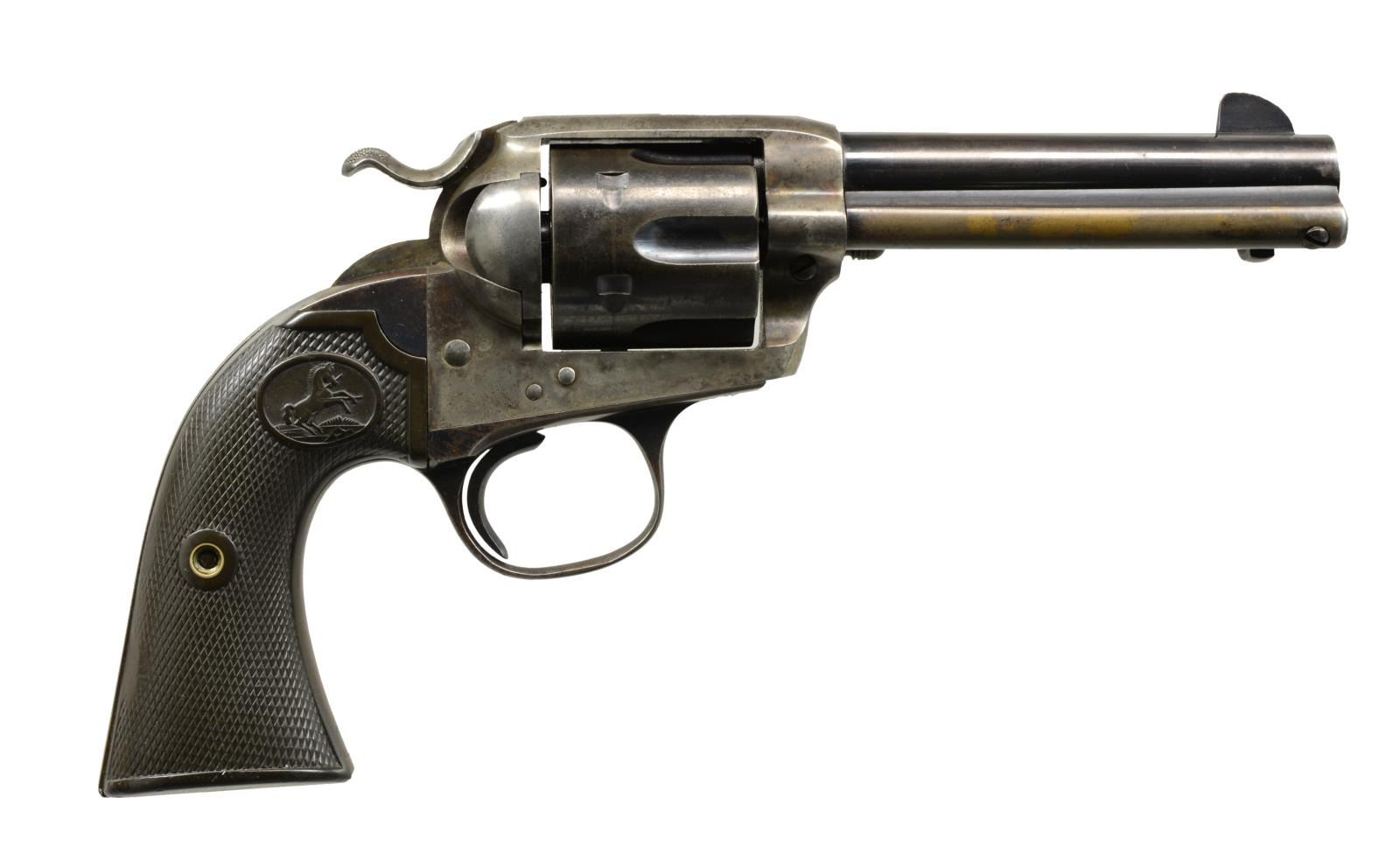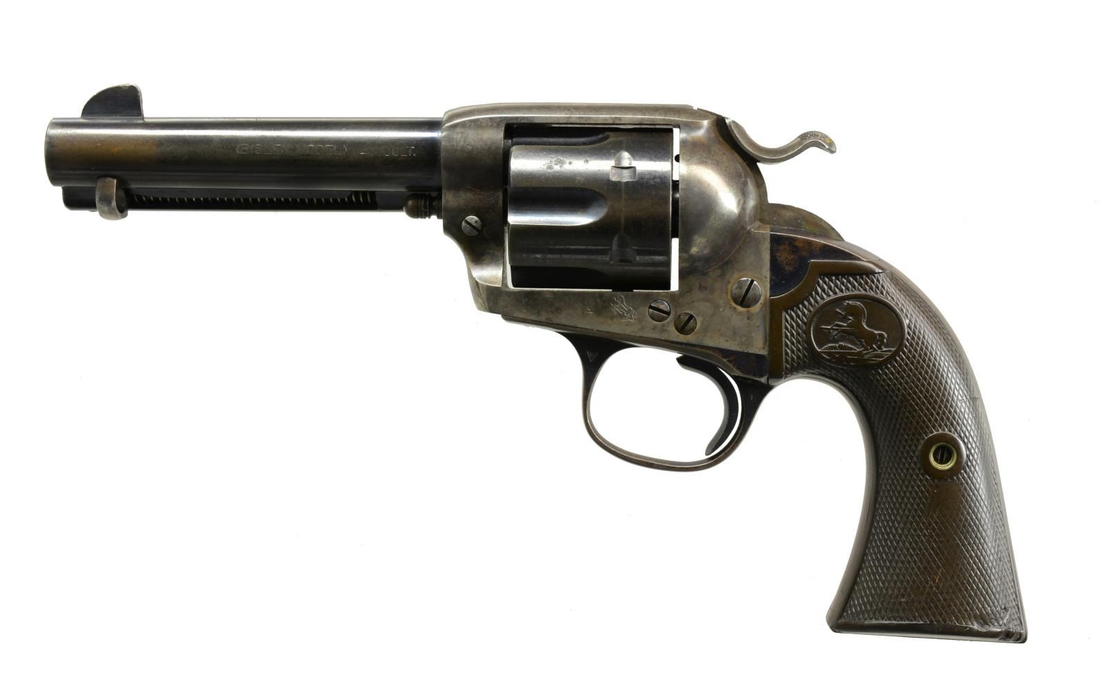 Cal. 41 Colt. S# 326365. Bbl. 4 3/4" w/ blade front sight. Left side marked "(BISLEY MODEL)". 6 Shot fluted cyl. Blue finish w/ case colored frame & hammer. 2 Piece checkered hard rubber Rampant Colt grips. 1913 Mfg. UNATTACHED ACCESSORIES: Colt Factory Letter. CONDITION: 40% dull blue fading to brown showing spots of corrosion. Frame & hammer are fading to a mottled gray w/ 25% lightly fading case colors. Grips have worn checkering w/ handling marks & sm. chips at butt. Bore retains sound rifling showing scattered pitting. (20-1756). CURIO. $3,000-4,000.