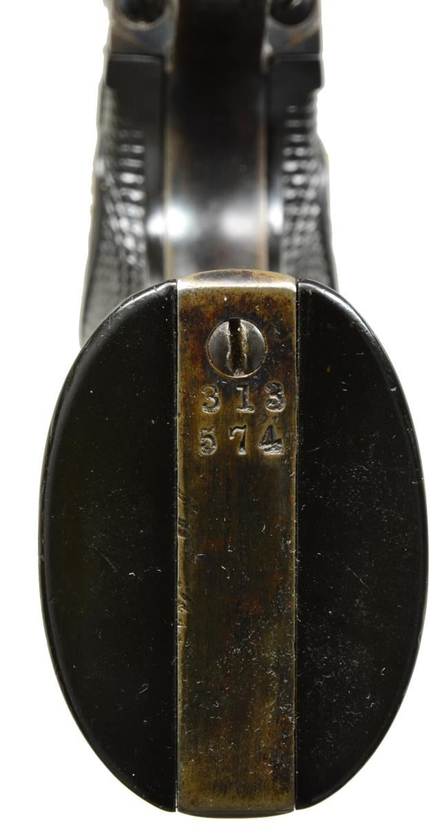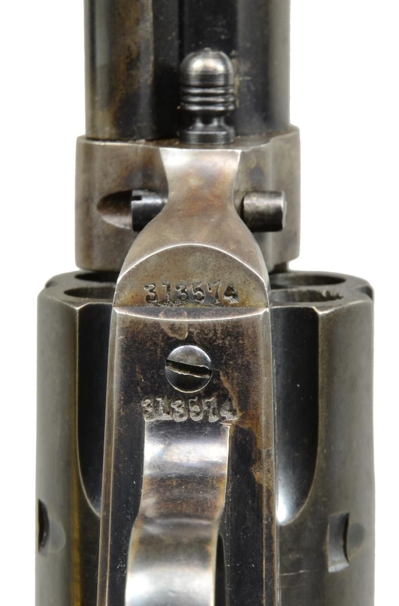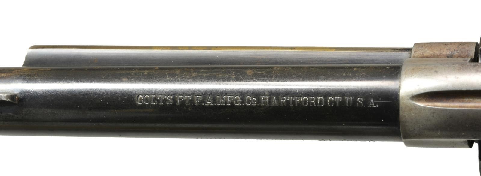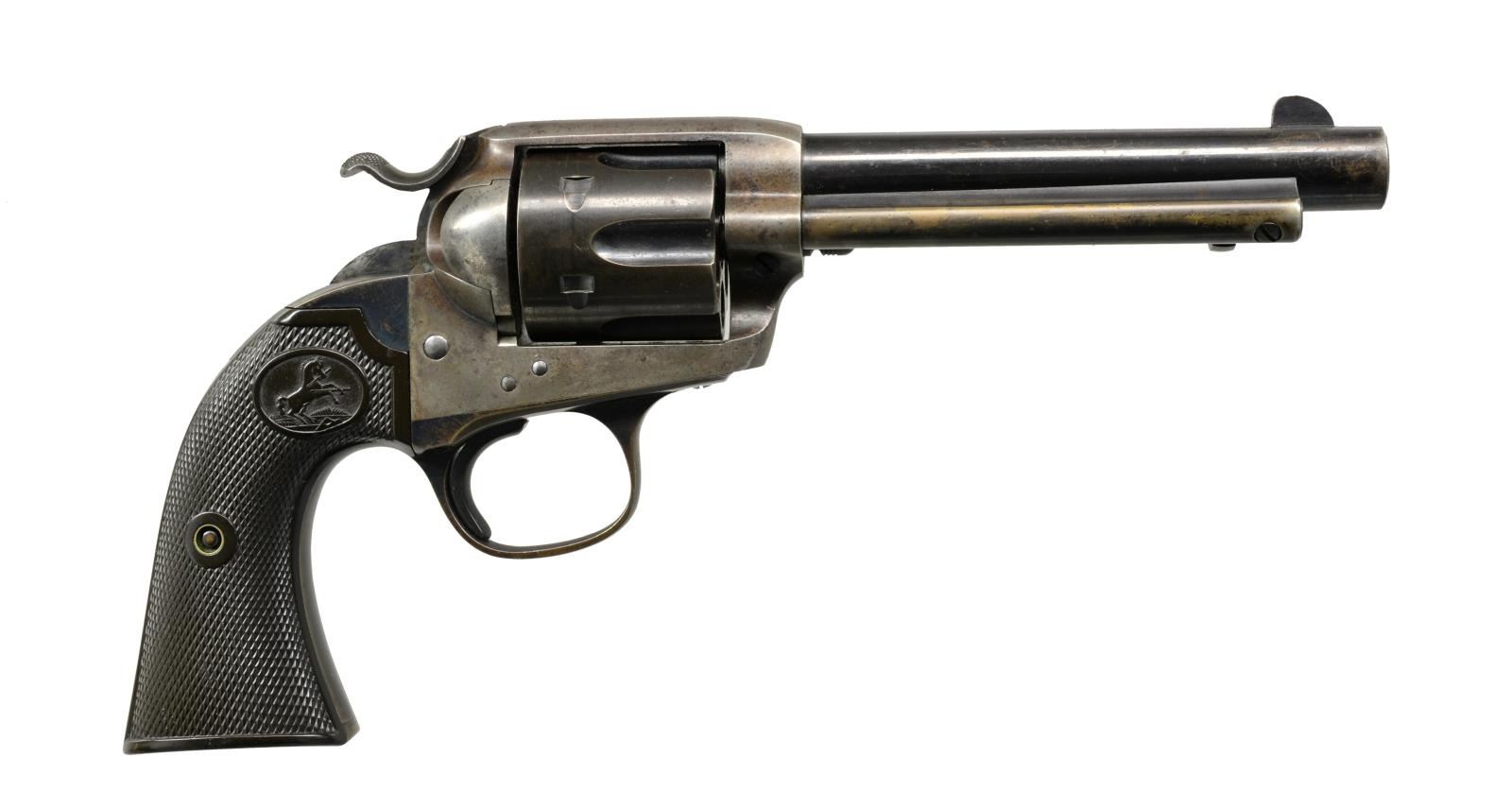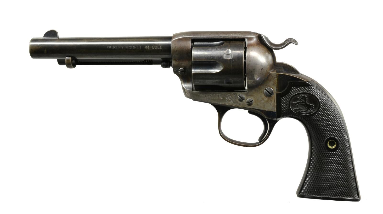 Cal. 41 Colt. S# 313574. Bbl. 5 1/2" w/ blade front sight. Left side marked "(BISLEY MODEL)". 6 Shot fluted cyl. Blue finish w/ case colored frame & hammer. Left side of trigger guard has Colt "VP" factory refurbishing proof. 2 Piece checkered hard rubber Rampant Colt grips. 1910 Mfg. CONDITION: 70% lightly faded blue. Frame & hammer fading to gray/brown w/ spots of surface corrosion retaining a sm. amount of fading case colors. Grips show light wear. Good mechanics. Bore is bright w/ very good rifling. (20-1757). CURIO. $2,500-3,500.