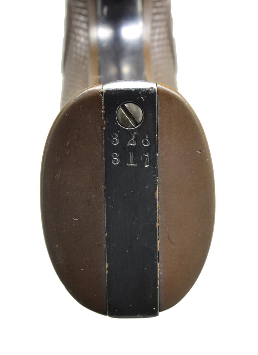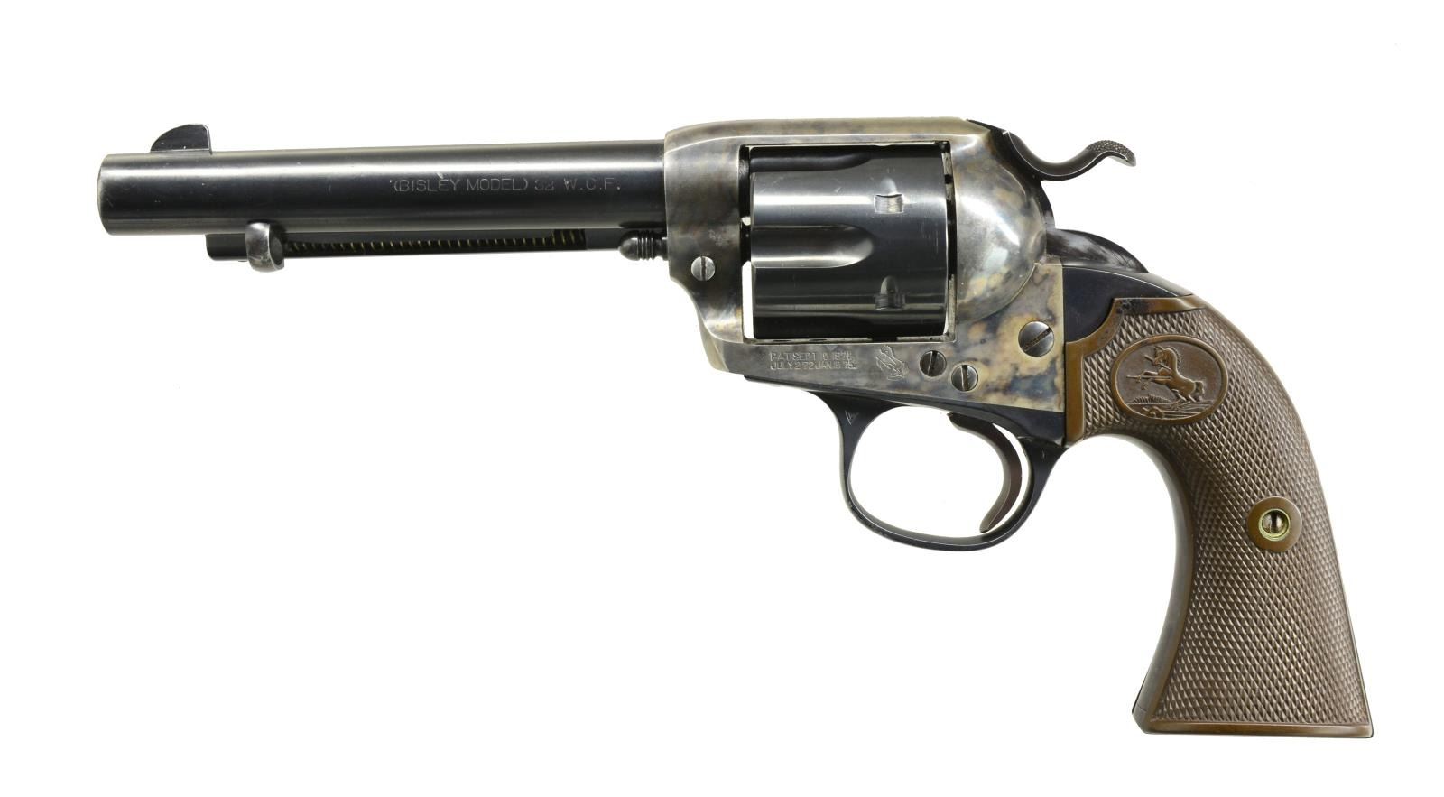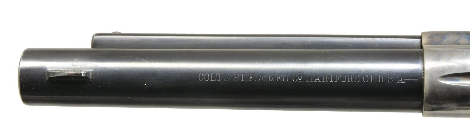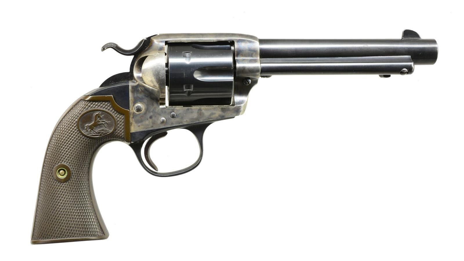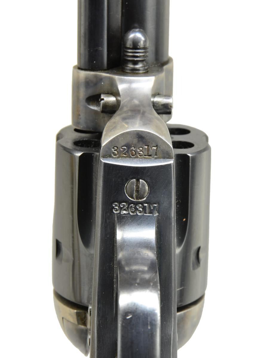 Cal. 32 WCF. S# 326317. Bbl. 5 1/2" w/ blade front sight. 6 Shot fluted cyl. Blue finish w/ case colored frame. 2 Piece checkered Rampant Colt hard rubber grips. 1913 Mfg. CONDITION: bbl., cyl.. & grip straps retain over 85% blue showing muzzle wear & light scratches. Frame retains 90% lightly faded case colors. Grips show light wear having attained a brown appearance w/ age. Sound action. Bore retains intact rifling showing some very light pitting. PROVENANCE: Collection of Alan Bradley Shepherd. (20-4022/DS). CURIO. $1,800-2,500.