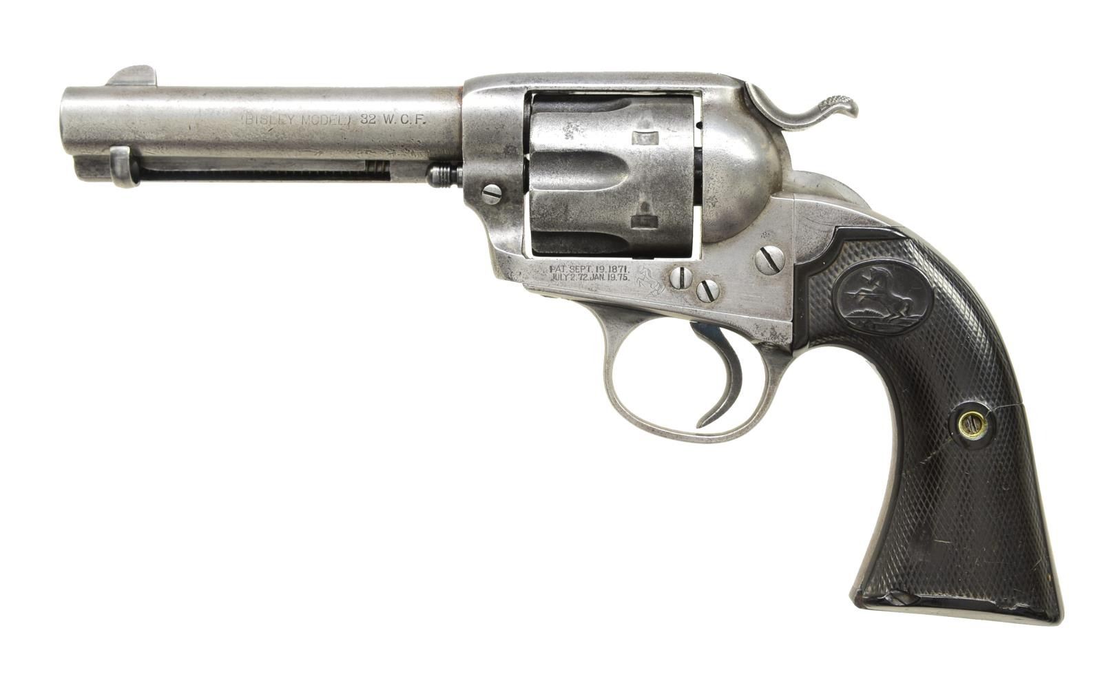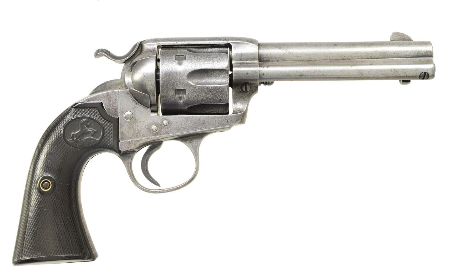 Cal. 32 WCF (32-20). S# 209723. Bbl. 4 3/4" w/ blade sight. 6 Shot fluted cyl. 2 Piece checkered hard rubber Rampant Colt grips. 1901 Mfg. CONDITION: metal finish has cleaned gray appearance showing scattered light pitting. Grips have worn checkering w/ chips near butt, both panels are cracked through attachment screw area. Action exhibits some wear. Dark bore w/ scattered pitting. PROVENANCE: The Estate of Richard Willman. (20-2347/DS). CURIO. $1,000-1,500.