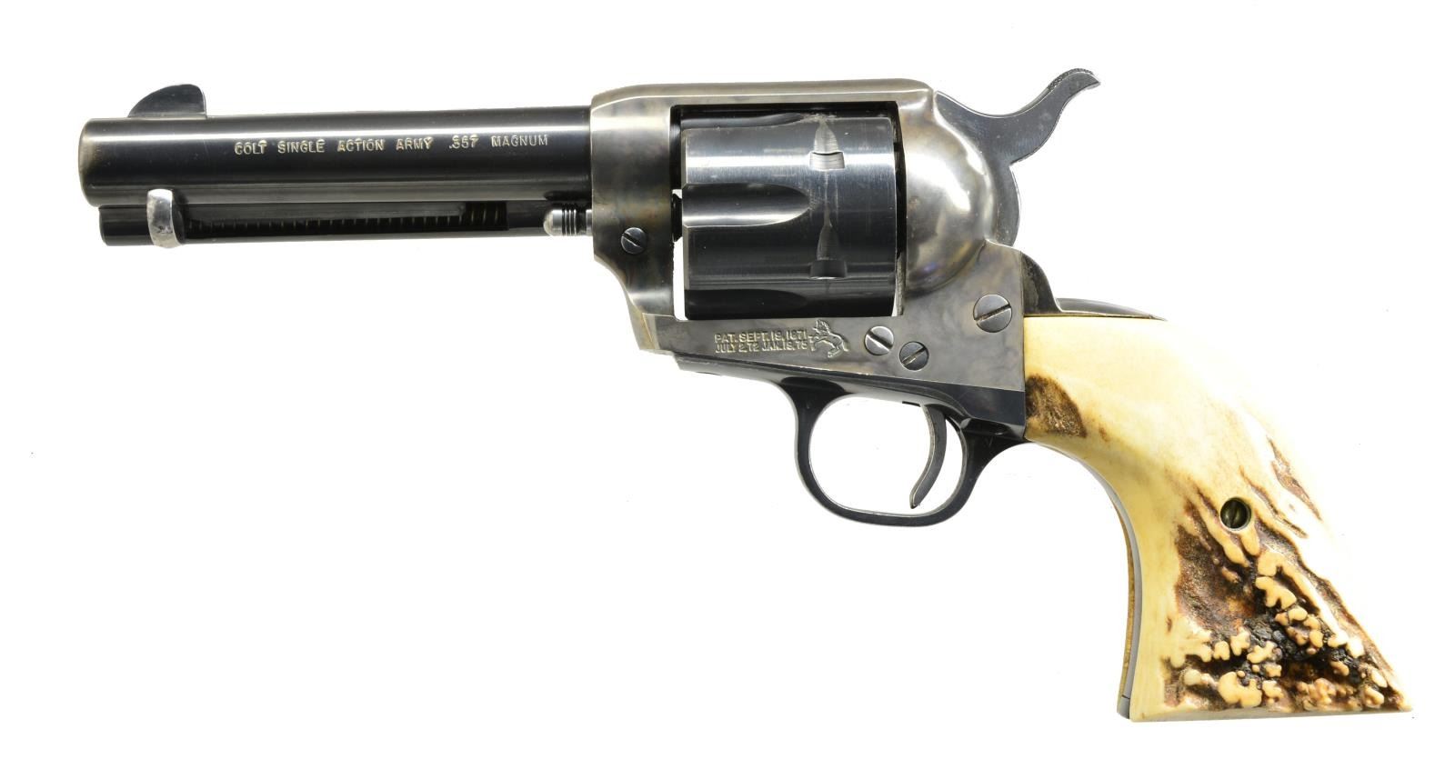 Cal. 357 Mag. S# 54445SA. Bbl. 4 3/4". 6 Shot fluted cyl. Blue finish w/ case colored frame. Custom aftermarket 2 piece stag grips. 1970 Mfg. CONDITION: bbl. & cyl. retain 85% blue showing muzzle wear, cyl. drag line & spots of corrosion. Frame retains 70% light faded case colors showing scattered spots of corrosion. Good grips. Sound mechanics. Bright bore w/ strong rifling. PROVENANCE: Collection of Alan Bradley Shepherd. (20-4035/DS). MODERN (Not CURIO until Jan.1, 2021). $1,200-1,800.