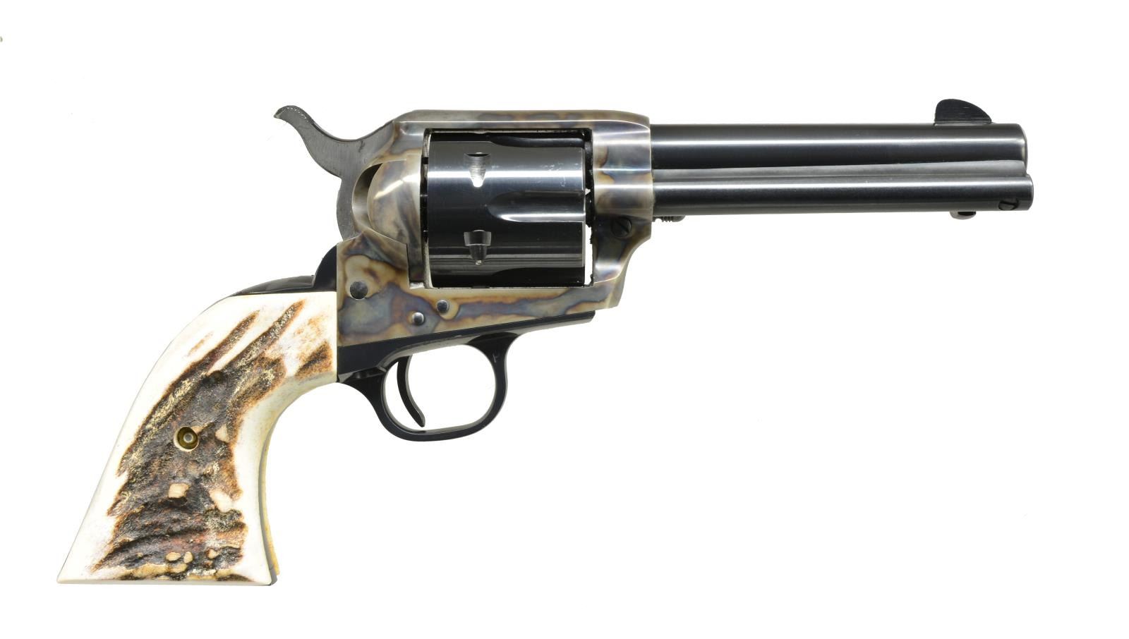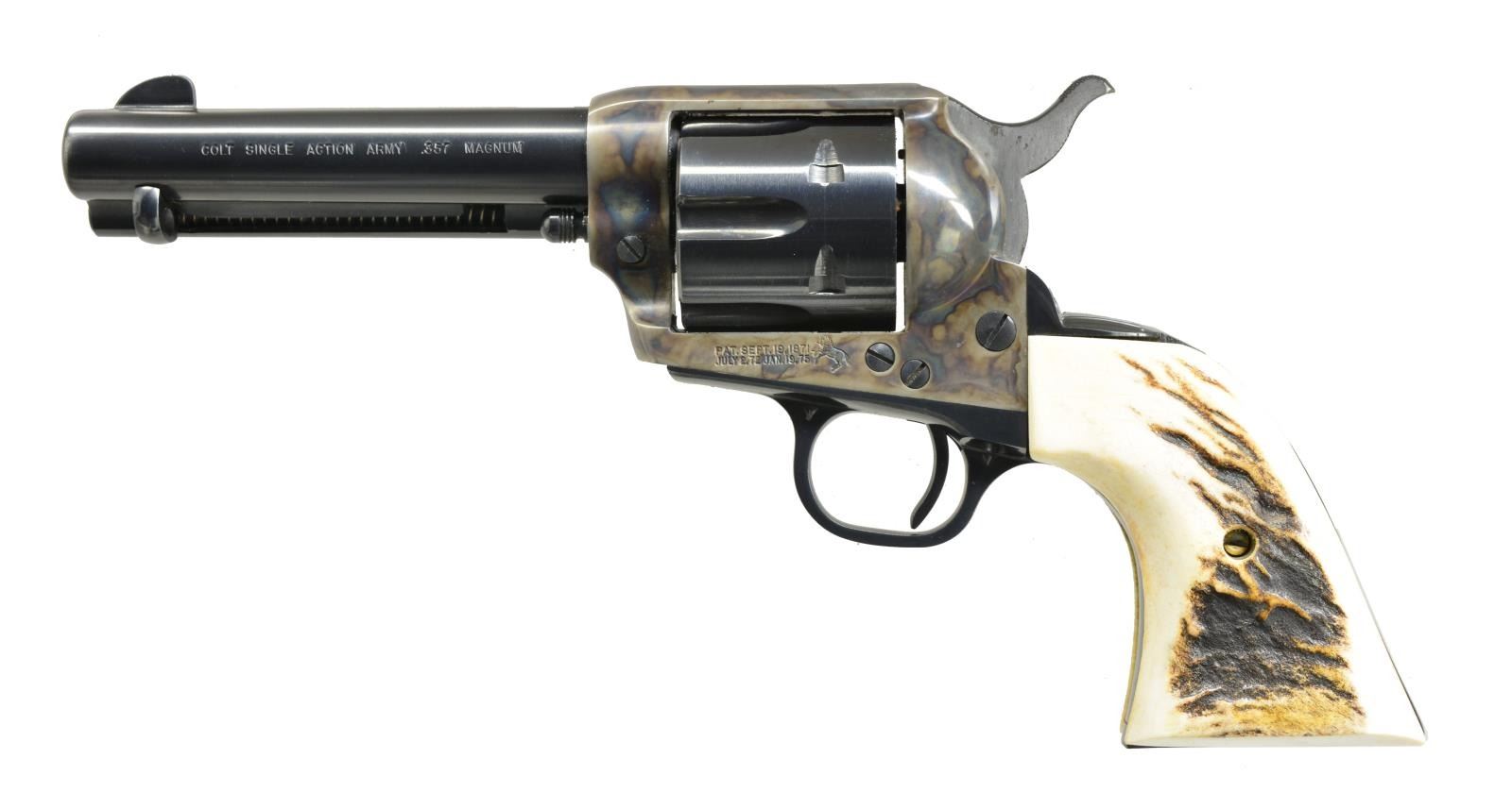 Cal. 357 Mag. S# 54374SA. Bbl. 4 3/4". 6 Shot fluted cyl. Blue finish w/ case colored frame. Custom aftermarket 2 piece stag grips. 1970 Mfg. CONDITION: over 95% blue & case colored finish showing slight muzzle wear & cyl. drag line. Very good grips. Crisp mechanics. Bright near excellent bore. PROVENANCE: Collection of Alan Bradley Shepherd. (20-4037/DS). MODERN (Not CURIO until Jan.1, 2021). $1,500-2,000.