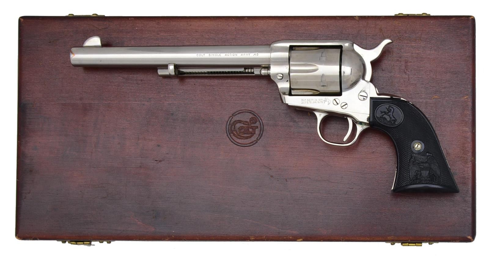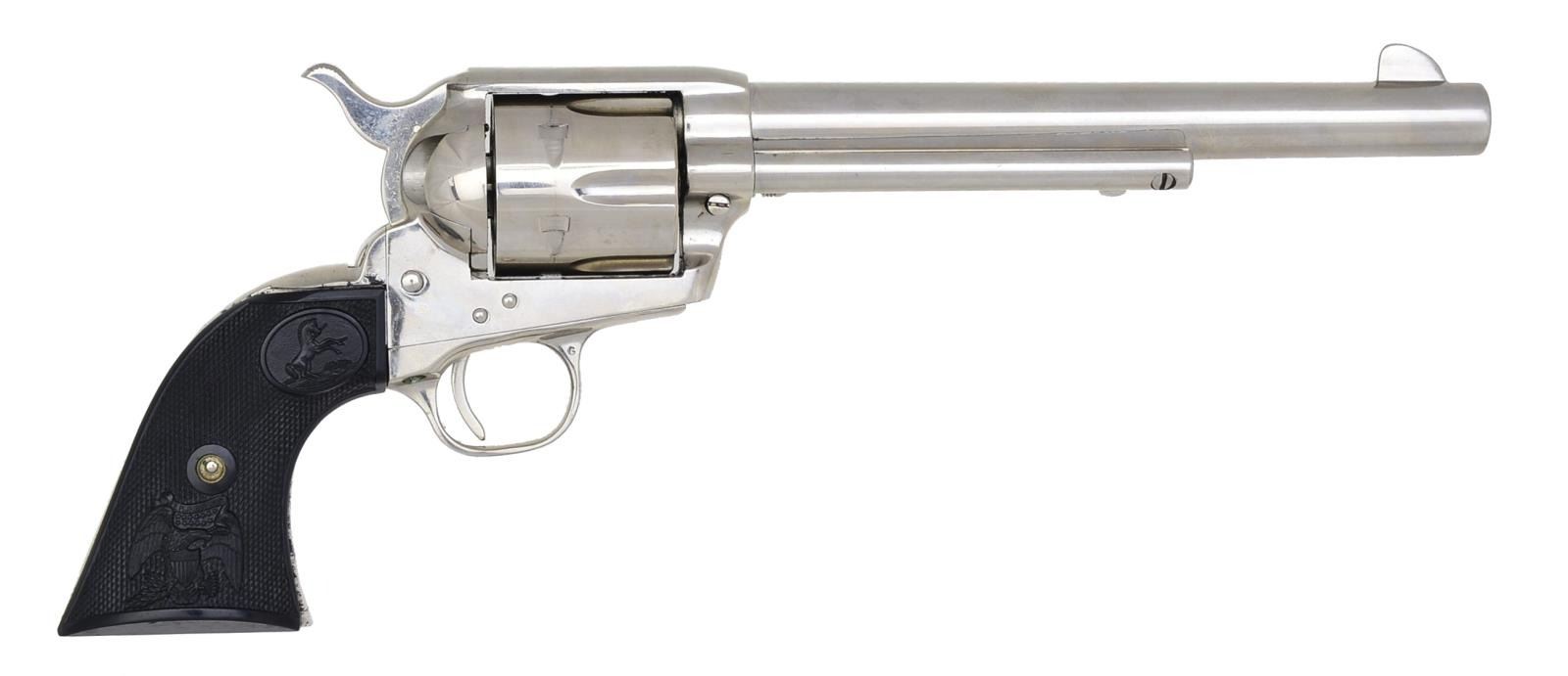 Cal. 45 Colt. S# 59205SA. Bbl. 7 1/2" w/ 6 shot fluted cyl. Full nickel finish. Replacement 2 piece checkered Eagle grips. 1970 Mfg. UNATTACHED ACCESSORIES: Colt marked wood display box w/ red velour fitted interior. CONDITION: over 80% nickel finish showing muzzle wear w/ scattered scratches having areas of blistered finish & rust on grip straps. Bore retains strong rifling w/ dark spots near muzzle. PROVENANCE: Collection of Alan Bradley Shepherd. (20-4044/DS). MODERN. $1,500-2,000.