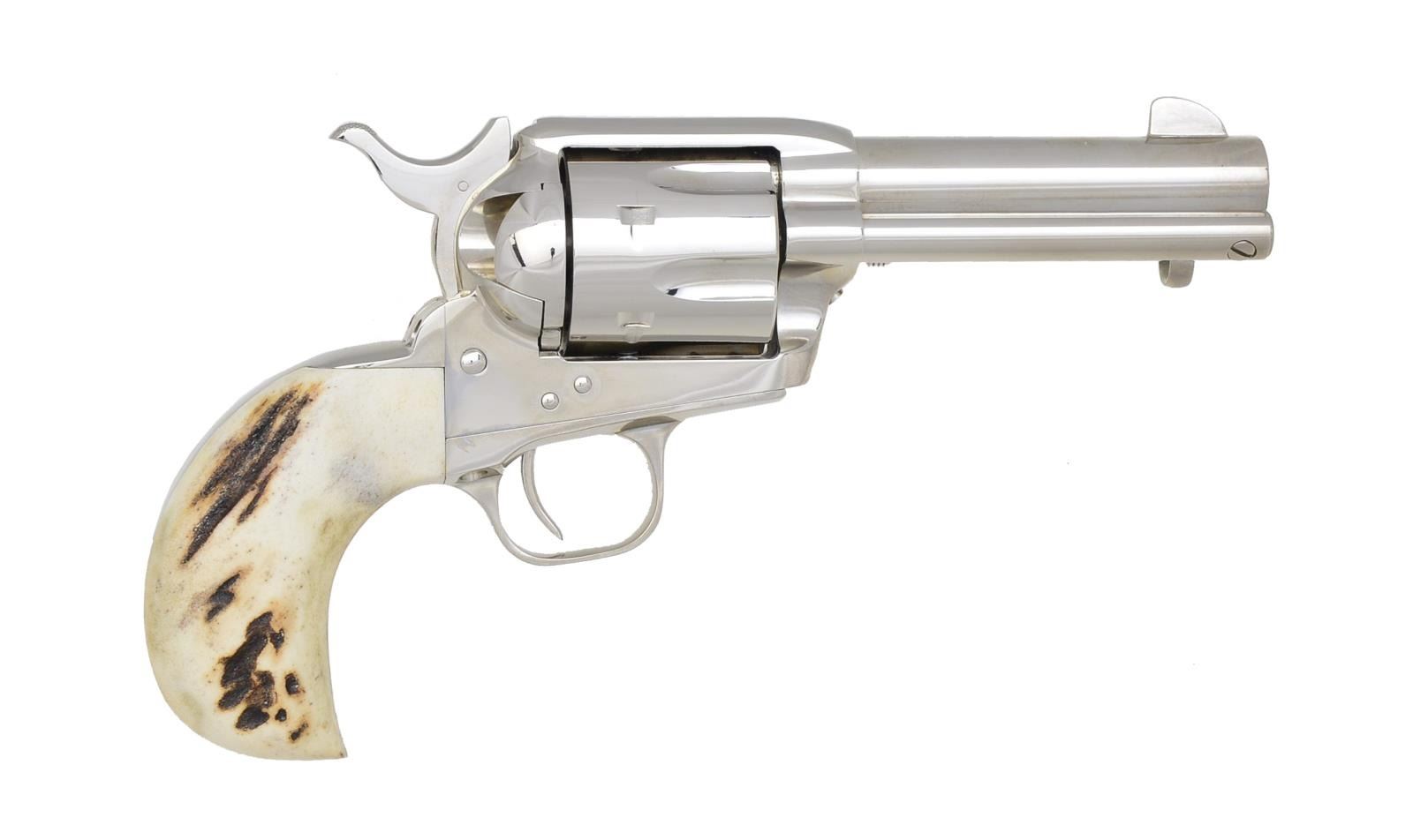Cal. 45 Colt. S# S41467A. Bbl. 4" w/ ejector & blade front sight. 6 Shot fluted cyl. Full nickel finish. 1 Piece stag bird's head grip. UNATTACHED ACCESSORIES: original 2 piece blue box w/ white sleeve having matching label. Box contains instruction manual, purchaser's card, service work card, hang tag, MA warning card & trigger lock. Colt Archive Properties letter from Historian Beverly Jean Haynes listing the following information "Serial Number: S41467A / Caliber: .45 Long Colt / Barrel Length: 4" - with ejector / Finish: Nickel / Type of Stocks: One-piece stag without medallions / Special Features: Furnished with a birdshead backstrap configuration, a two-line barrel address, the "45 COLT" rollmark, and a blackpowder style frame" / Shipped to James Reis / Address: 3515 Hwy. 54 Osage Beach, Missouri / Date of Shipment: March 2, 2007 / Number of Same Type Guns in Shipment: 1 / Remarks: The records further indicate that subject revolver was displayed at the 2006 NRA Show in Milwaukee, Wisconsin and at the 2007 Antique Arms Show in Las Vegas, Nevada". CONDITION: near new retaining over 99% finish showing a slight cyl. drag line. Bright near excellent bore. (20-2401/DS). MODERN. $1,400-1,900.