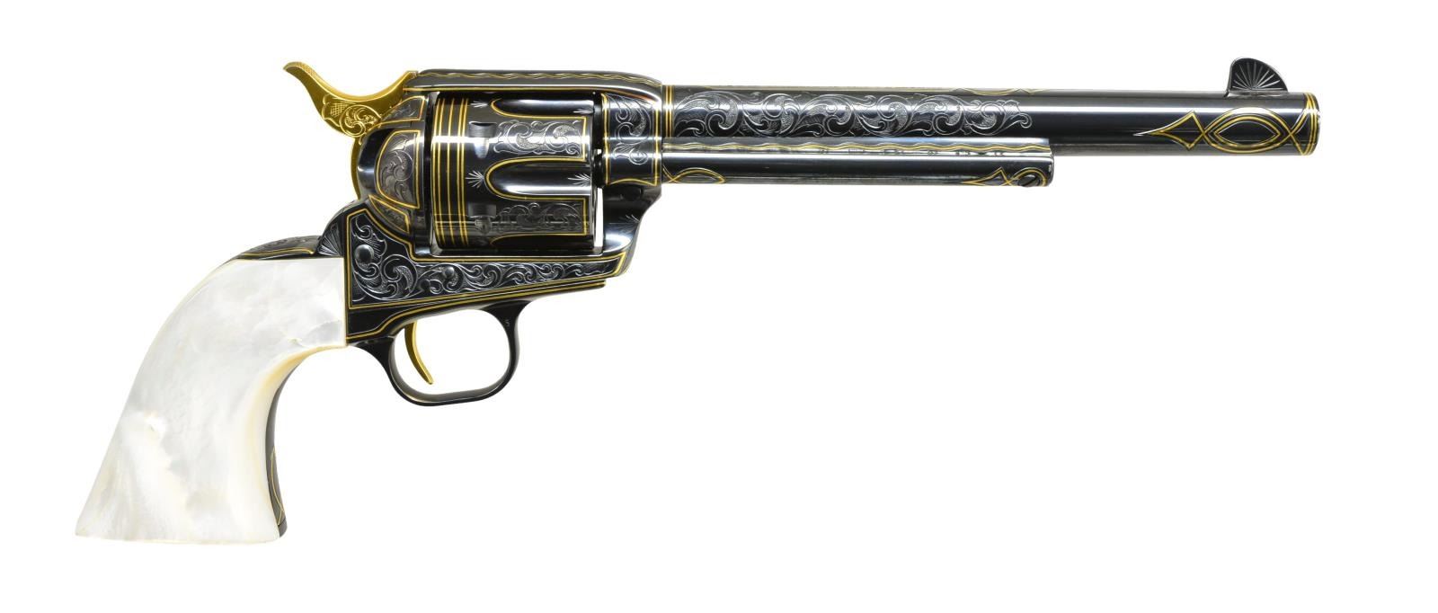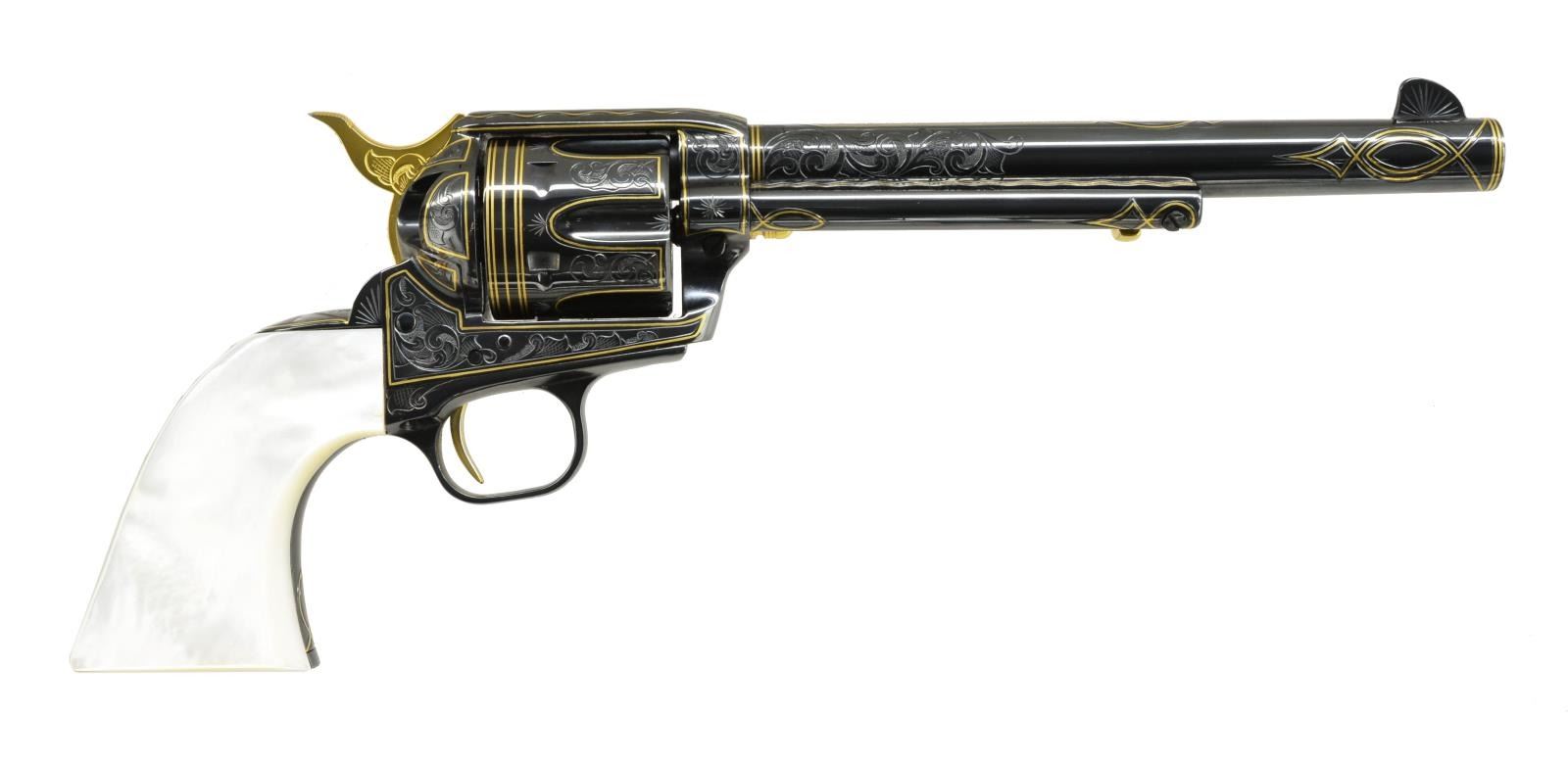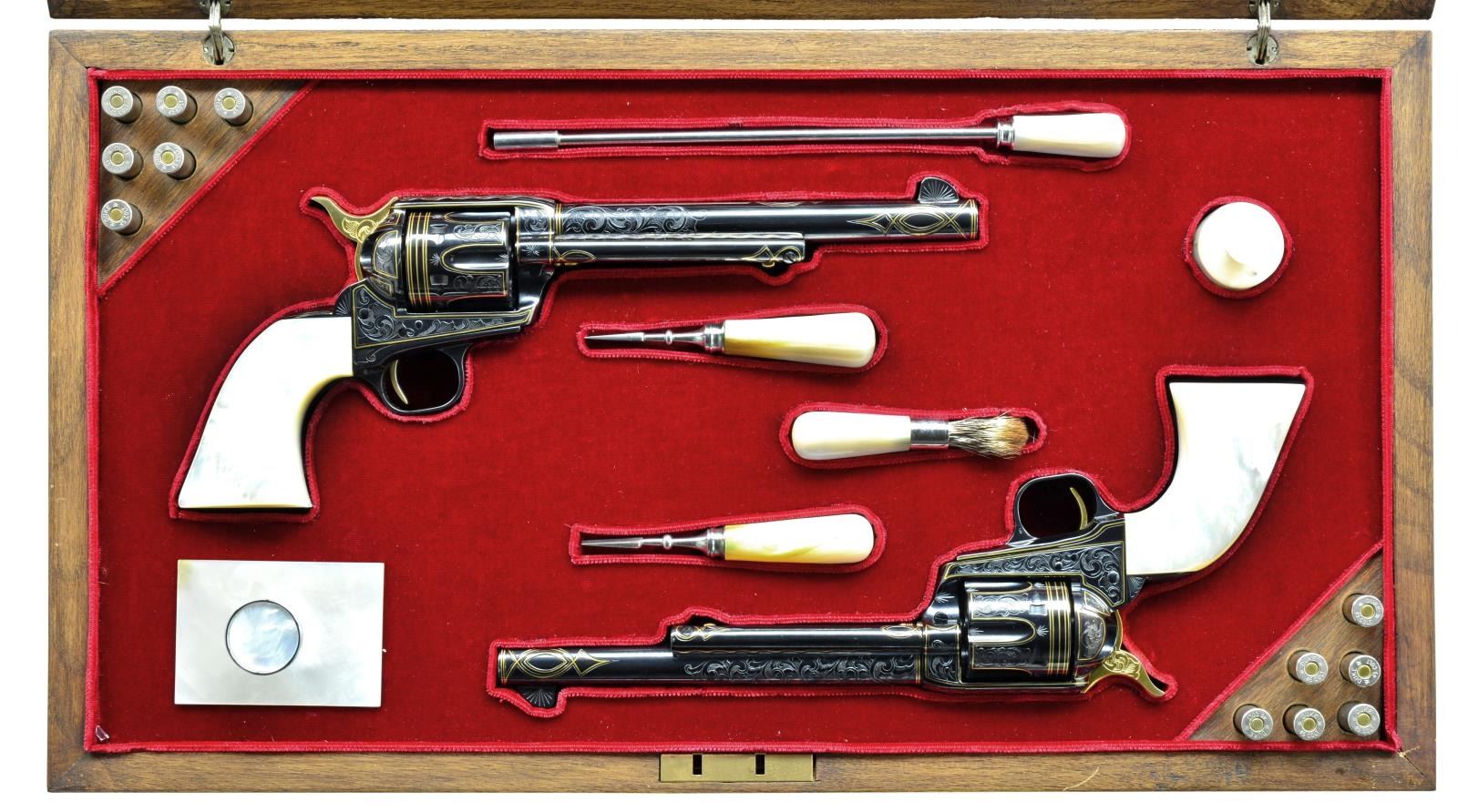 ALL: cal. 45 Colt. Bbls. 7 1/2" w/ blade sight. 6 Shot fluted cyls. Frames, cyls., bbls., grip straps & hammers have foliate scroll engraving w/ punch dot & cross hatched backgrounds. Gold wire inlaid accents are found on frame, cyl., bbl., grip straps & ejector housings. Engraver's signature "FLANNERY 82" is found inside of ejector housings. Jeffrey Flannery resides in Kentucky. Hammers, triggers, cyl. pins & ejector heads have gold finish. 1 Piece pearls grips. UNATTACHED ACCESSORIES: glass fronted wood presentation case w/ red fitted interior. Case contains pearl handle cleaning rod, brush & 2 turn screws, oil bottle, & accessory box. 2 Corners of case have cartridge blocks holding 6 rds. each of 45 Colt. CONDITION: both retains over 95% custom blue finish w/ very good grips. Near excellent bores. 1) S# SA13626. (20-4065/DS). 2) S# SA12950. PROVENANCE: Collection of Alan Bradley Shepherd. (20-4066/DS). ALL MODERN. $7,000-10,000.