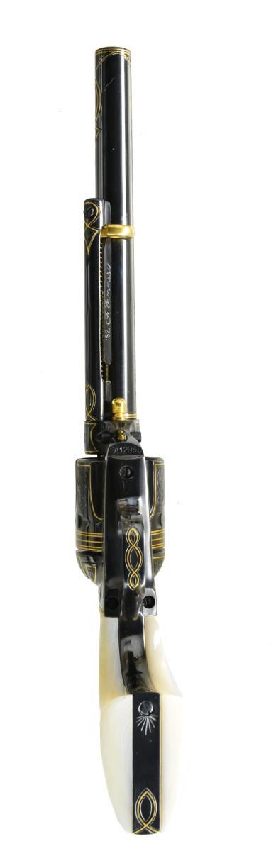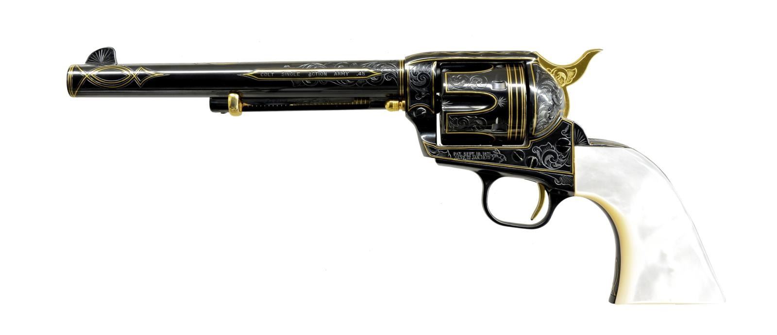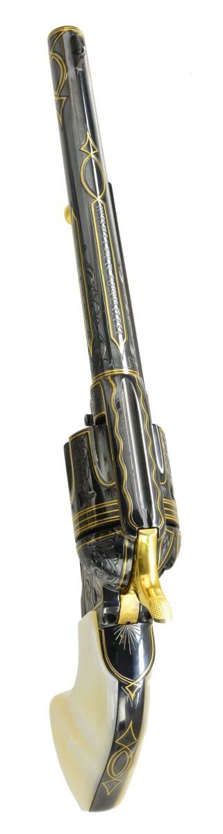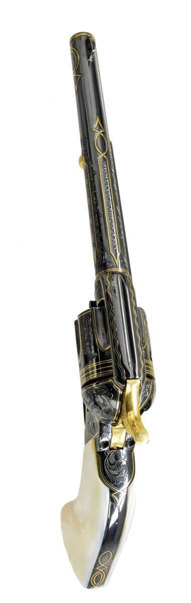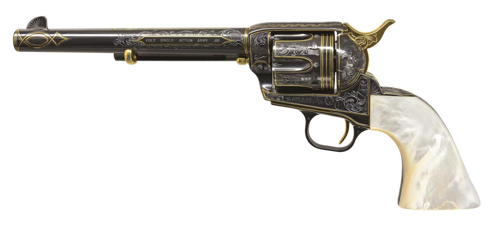 ALL: cal. 45 Colt. Bbls. 7 1/2" w/ blade sight. 6 Shot fluted cyls. Frames, cyls., bbls., grip straps & hammers have foliate scroll engraving w/ punch dot & cross hatched backgrounds. Gold wire inlaid accents are found on frame, cyl., bbl., grip straps & ejector housings. Engraver's signature "FLANNERY 82" is found inside of ejector housings. Jeffrey Flannery resides in Kentucky. Hammers, triggers, cyl. pins & ejector heads have gold finish. 1 Piece pearls grips. UNATTACHED ACCESSORIES: glass fronted wood presentation case w/ red fitted interior. Case contains pearl handle cleaning rod, brush & 2 turn screws, oil bottle, & accessory box. 2 Corners of case have cartridge blocks holding 6 rds. each of 45 Colt. CONDITION: both retains over 95% custom blue finish w/ very good grips. Near excellent bores. 1) S# SA13626. (20-4065/DS). 2) S# SA12950. PROVENANCE: Collection of Alan Bradley Shepherd. (20-4066/DS). ALL MODERN. $7,000-10,000.