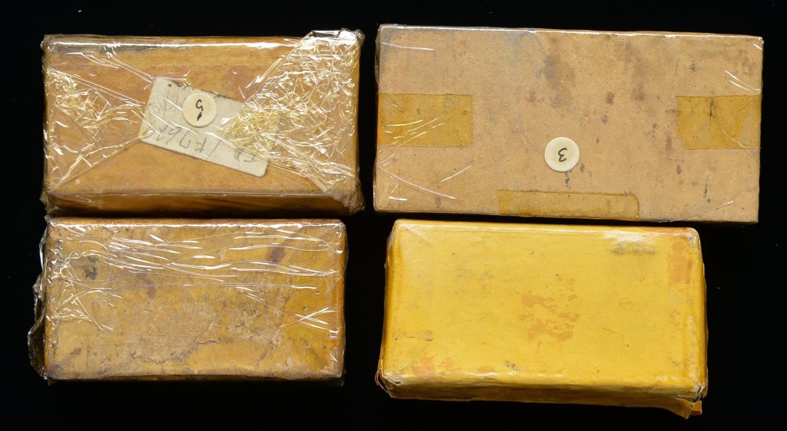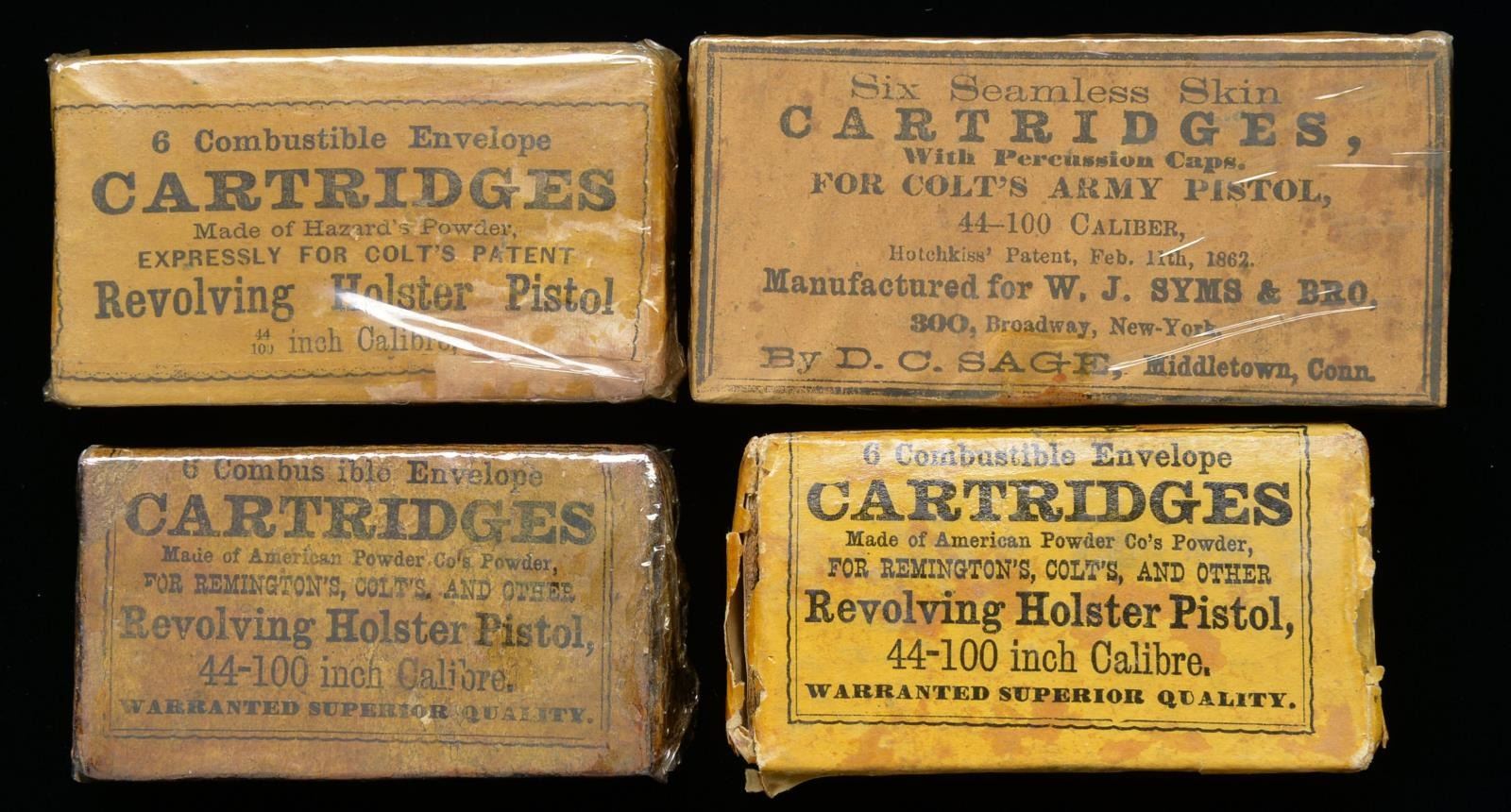 CARTRIDGES. 1) American Powder Company “For Remington’s, Colts, and other / Revolving Holster Pistol / 44-100 inch Calibre”. CONDITION very good and complete, good label. 2) American Powder Company “For Remington’s, Colts, and other / Revolving Holster Pistol / 44-100 inch Calibre”. CONDITION: same as previous pack w/ lighter label, opened, retaining 4 broken cartridges. 3) “6 Seamless Skin / CARTRIDGES / With Percussion Caps / 44-100 Caliber / Hotchkiss Patent Feb 11th 1862 / Manufactured for W. J. SYMS & BRO / by D. C. Sage, Middletown, Conn” CONDITION: very good & complete 4) “.. Made of Hazards Powder / Expressly for Colts Patent / Revolving Holster Pistol / 44/100 calibre” CONDITION: very good overall & complete. (02-14594-4/JS). $1,500-2,000.