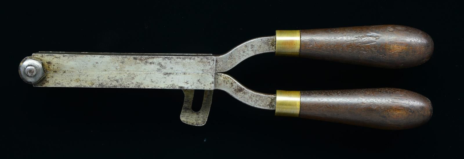 BULLET MOLD. Gang molds like this example are difficult to find in good condition because of heavy use during the Civil War, but this example likely ranks among the finest known specimens. A 12 3/4"squad-size gang bullet mold w/ six 44 caliber cavities w/ lubricating groove & rebated base. It has attached sprue cutter w/ turned walnut handles & brass ferrules. The right brass ferrule is stamped, “221”. Metal handles are each stamped w/ a “C” inspector mark on top & a “D” on the bottom of the left handle. Right front is marked “44H”. It is believed that this mold is for the 44 caliber Army revolver or possibly the 44 caliber Model 1855 revolving rifle as it has a pointed bullet rather than the flat-nose bullet required for the Henry or Winchester rifles. CONDITION: mold has obviously been used & only traces of fire blue remain. The mold still operates freely & has sharp defined details to the bullet cavities. Handles have a couple of scattered dents & dings. (02-14651/BF). $500-800.