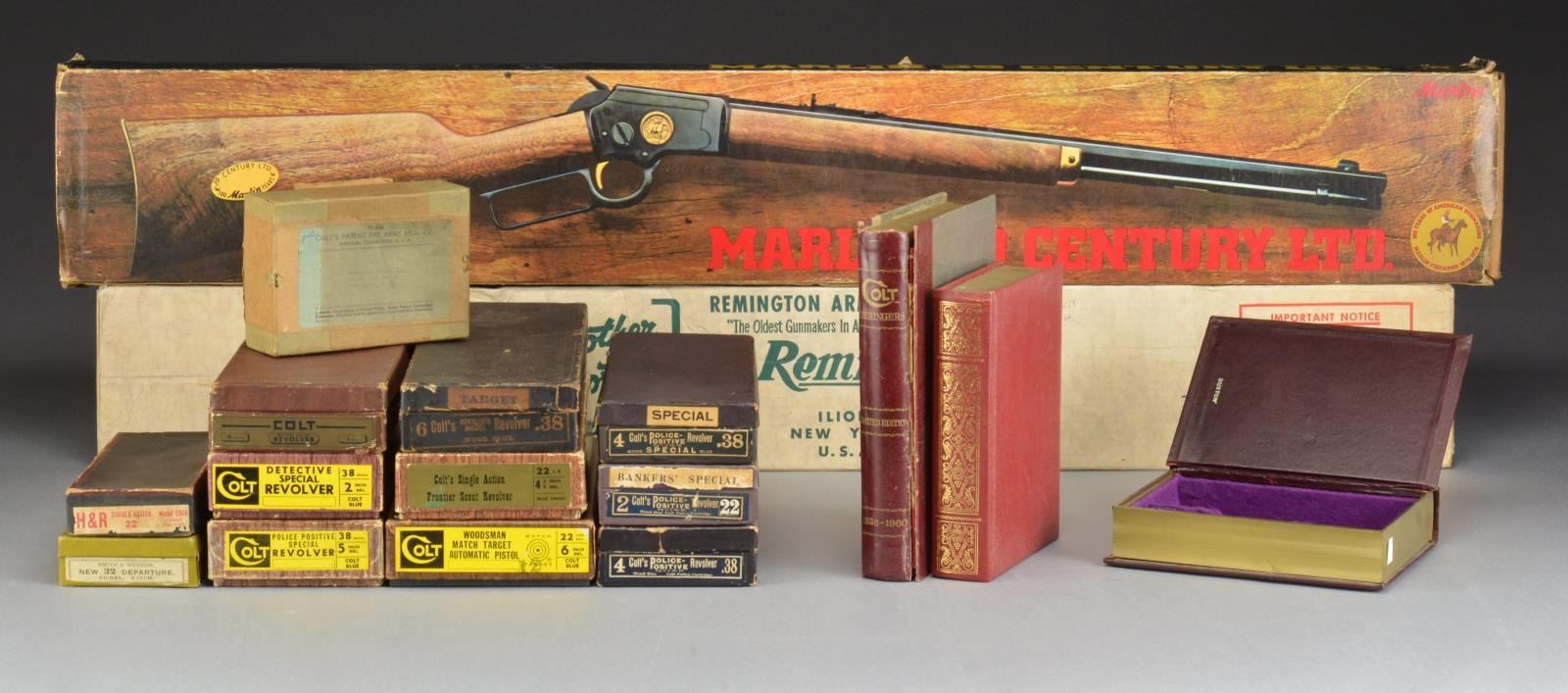 COLT BOXES. 1 Piece brown box w/ gold label for 38 Spl. Official Police 4" bbl. revolver. Containing shooting suggestion pamphlet. Box shows light tattering on edges. Inside of lid has pencil marking identifying original owner. / 1 Piece box w/ label for Banker's Special Police Positive 22 LR revolver containing shooting suggestion pamphlet, test target & brush. Box shows very lighting tattering at corners. / 1 Piece box w/ label for Police Positive, 38 cal., 4" bbl. Box shows light tattering. / 1 Piece box for Officer's Model Target cal. 38 w/ 6" bbl. Box has dark stained appearance w/ tattered edges. / 1 Piece box w/ label for Colt Police Positive Special cal. 38 w/ 4" bbl. Box has lightly tattered edges. / 2 Piece wood grain box for Frontier Scout revolver w/ 4 3/4" bbl. / 2 Piece wood grain box w/ label for Police Positive Special cal. 38 w/ 5" bbl. Box contains an unmarked leather Augley style holster & Handling the Handgun pamphlet. Light tattering w/ taped corners. / 2 Piece wood grain box w/ label for Detective Special cal. 38 w/ 2" bbl. Box contains Colt warranty & Handling the Handgun pamphlet. Box shows light tattering. / 2 Piece wood grain box w/ label for Woodsman Match Target w/ 6" bbl. Box shows very light tattering of edges. / 6" x 4" x 1 3/4" 2 piece box w/ Colt label. Appears to be service return box. Box shows some staining & tattering. / Book style case for 2 Colt Derringers. Front cover is detached at binding showing tattered edges. / Book style case for 2" bbl. revolver w/ cartridge block for 22 cal. ammo. Good condition. / Book style case for 2" bbl. revolver. Very good condition. OTHER BOXES. Smith & Wesson 1 piece yellow box w/ label for New Departure 3" bbl. Corners show some very light tattering. / 2 Piece black box w/ label for H&R Model 1906 cal. 22 RF. Lid edges & label show tattering w/ 1 tear. / Marlin Model 39 Century Limited rifle box w/ decorative sleeve. containing owner's manual & sportsmanship pamphlet. Box & sleeve show tattering & sm. tears. / Remington box for Nylon 66 Mohawk Brown rifle in good condition. PROVENANCE: The Estate of Richard Willman. (02-14140(17)/DS). $500-1,000.
