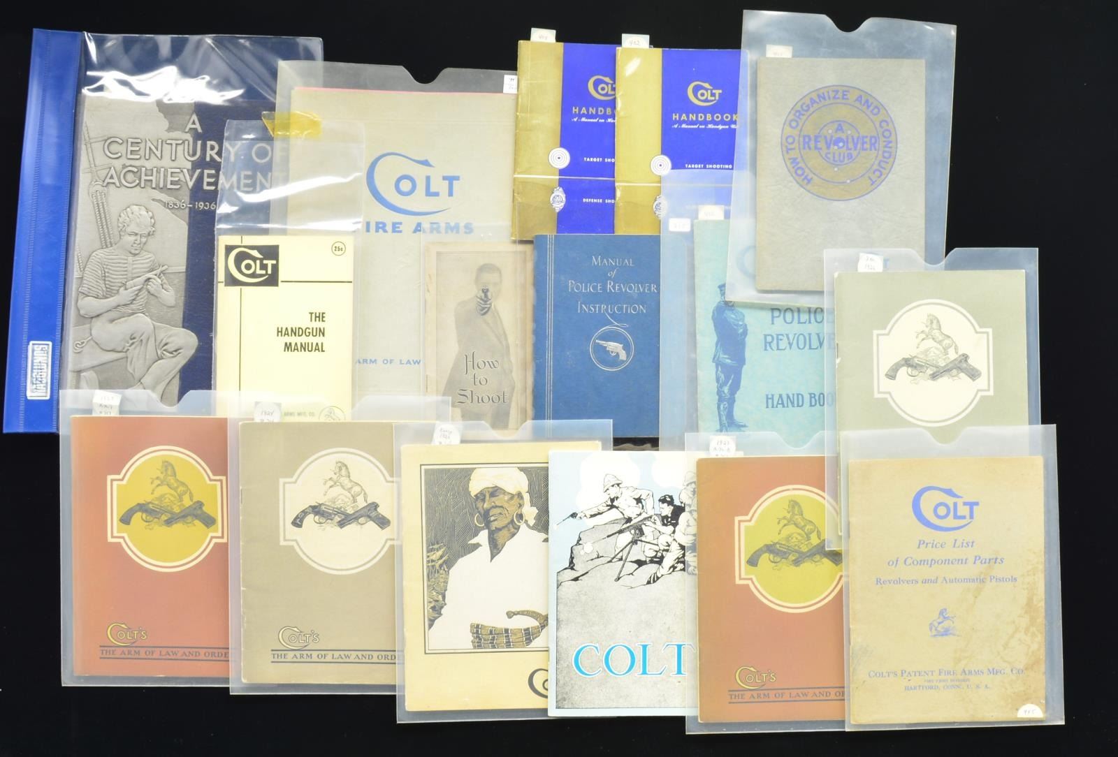 & MANUALS. 20 EARLY CATALOGS: 1907, 1924 & 1926, Catalogs marked "THE ARM OF LAW AND ORDER": 1924, 1926, 2-1927, 1928, 1930, 2 - 1931, 1934, & 1938. 7 COMPONENT PARTS CATALOGS: 1933, 1934, 1936, 1938, & 2 Undated. 9 HANDBOOKS/MANUALS: "The Evolution of the Colt" by R. L. Wilson, "How to Organize & Conduct a Revolver Club", Colt's Police Revolver handbook, Manual of police revolver instruction, 2 Colt Handgun use handbooks, Colt handgun manual, Colt How to Shoot booklet & "A Century of Achievement 1836-1936". CONDITION: most items are in good to very good condition. PROVENANCE: The Estate of Richard Willman. (02-14136/DS). $750-1,500.