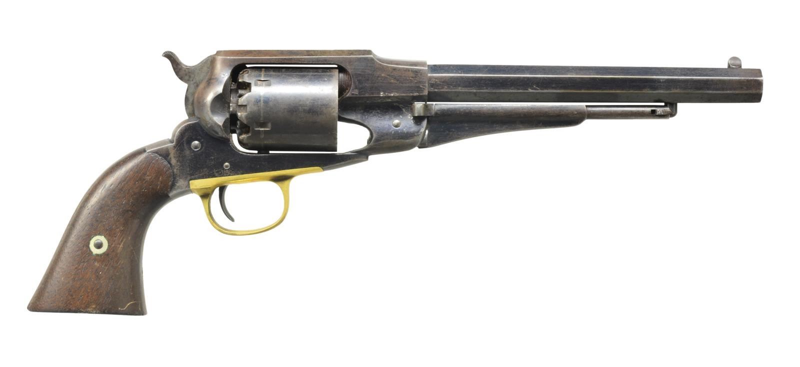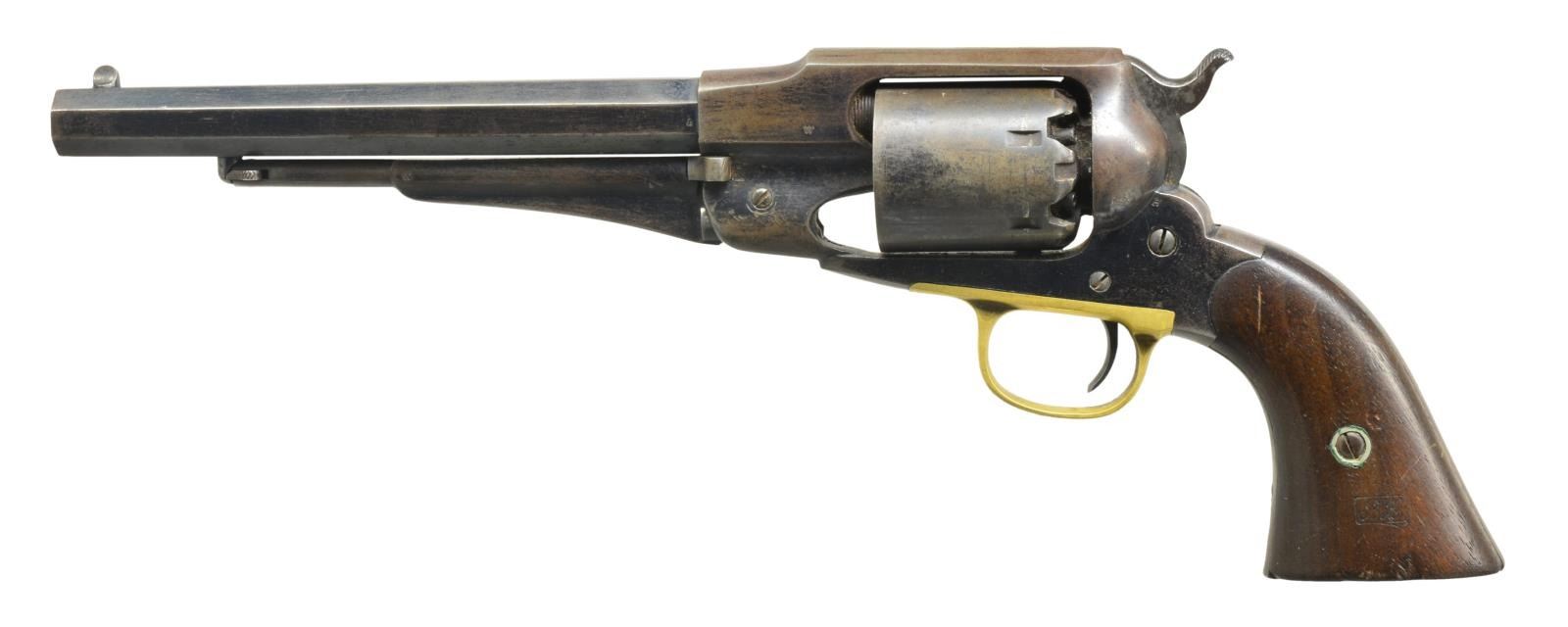 Cal. 44. S# 67082. Bbl. 8" oct. w/ blade front sight. 6 Shot rnd. cyl. Blue finish w/ brass trigger guard. 2 Piece walnut grips. Right panel has "RH" cartouche. Bbl. & cyl. has "L" inspectors marks. frame has "W" & "H" inspectors marks. CONDITION: 40% dull blue fading to brown patina showing sm. dents. Grips show wear & marks w/ sm. chips at butt. Sound action. Bore retains sound rifling showing few sm. spots of light pitting. (01-18303/DS). ANTIQUE. $1,200-1,800.