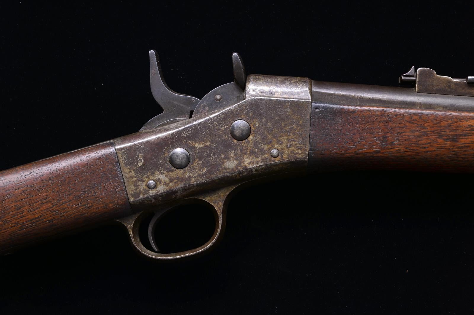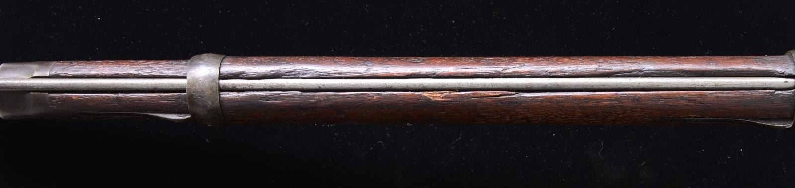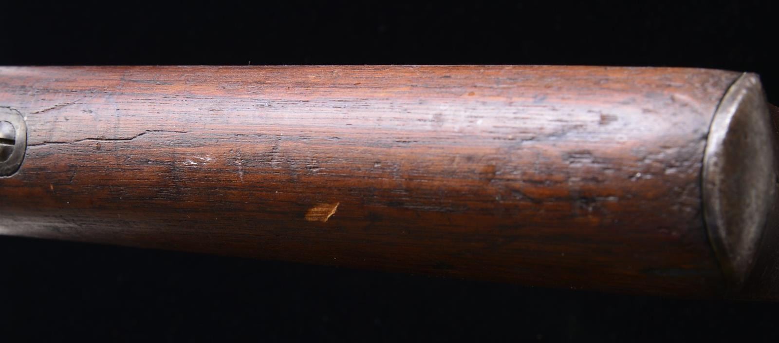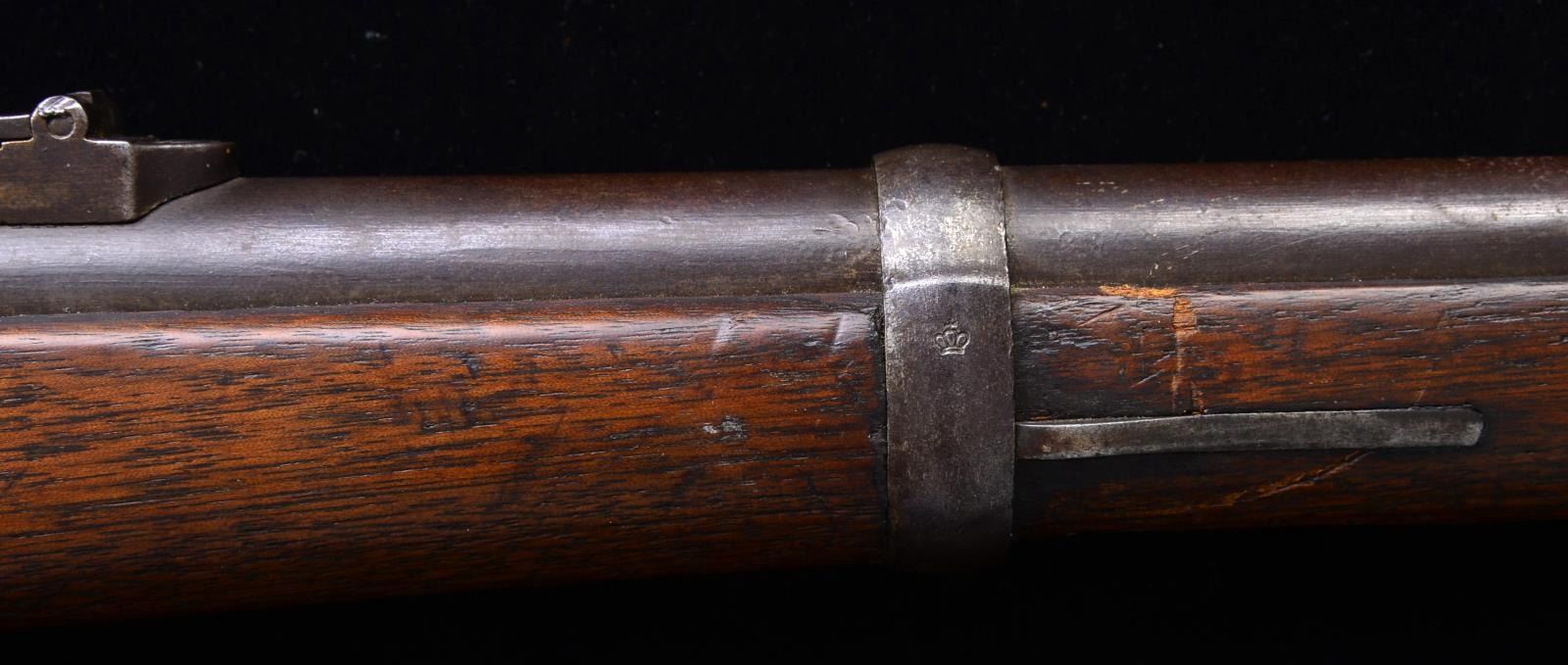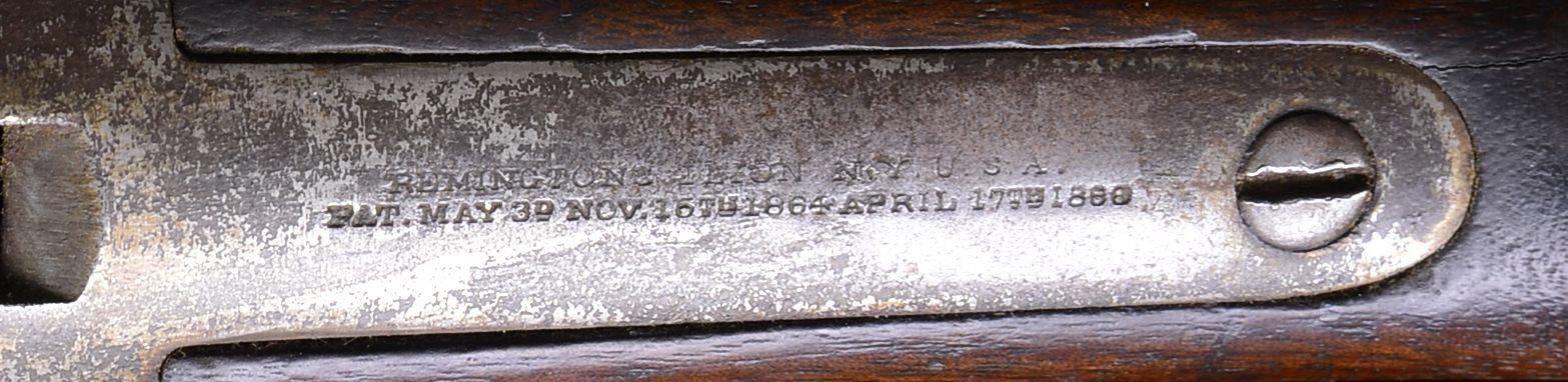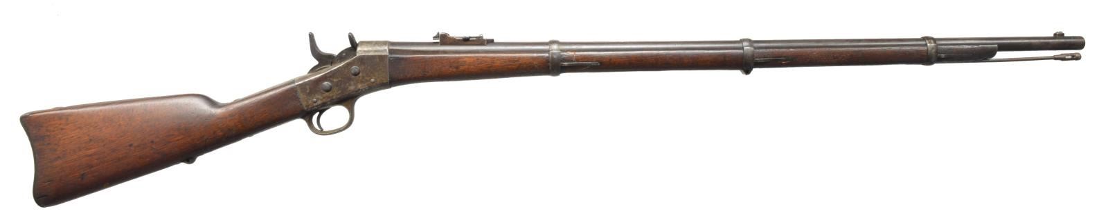 MILITARY RIFLE. Cal. 43 Spanish (?). NSN. Bbl. 35” w/ flip up tangent rear sight & silver bead front sight. Typical action w/ Remington markings on top tang. Last patent date is 1888. American walnut stock is fitted w/ steel buttplate & has sling eye on bottom. Matching long forend w/ steel tip & cleaning rod is held by 3 bands. Center band stamped w/ a crown. CONDITION: good overall. Bbl. retaining a considerable amount of its original blue. Action w/ all case hardening turning silver w/ considerable rusting & pitting. Stocks have most of their original oil finish. Fair bore w/ strong rifling, pitted throughout. Mechanically good. (01-18790/MGM). ANTIQUE. $400-600.