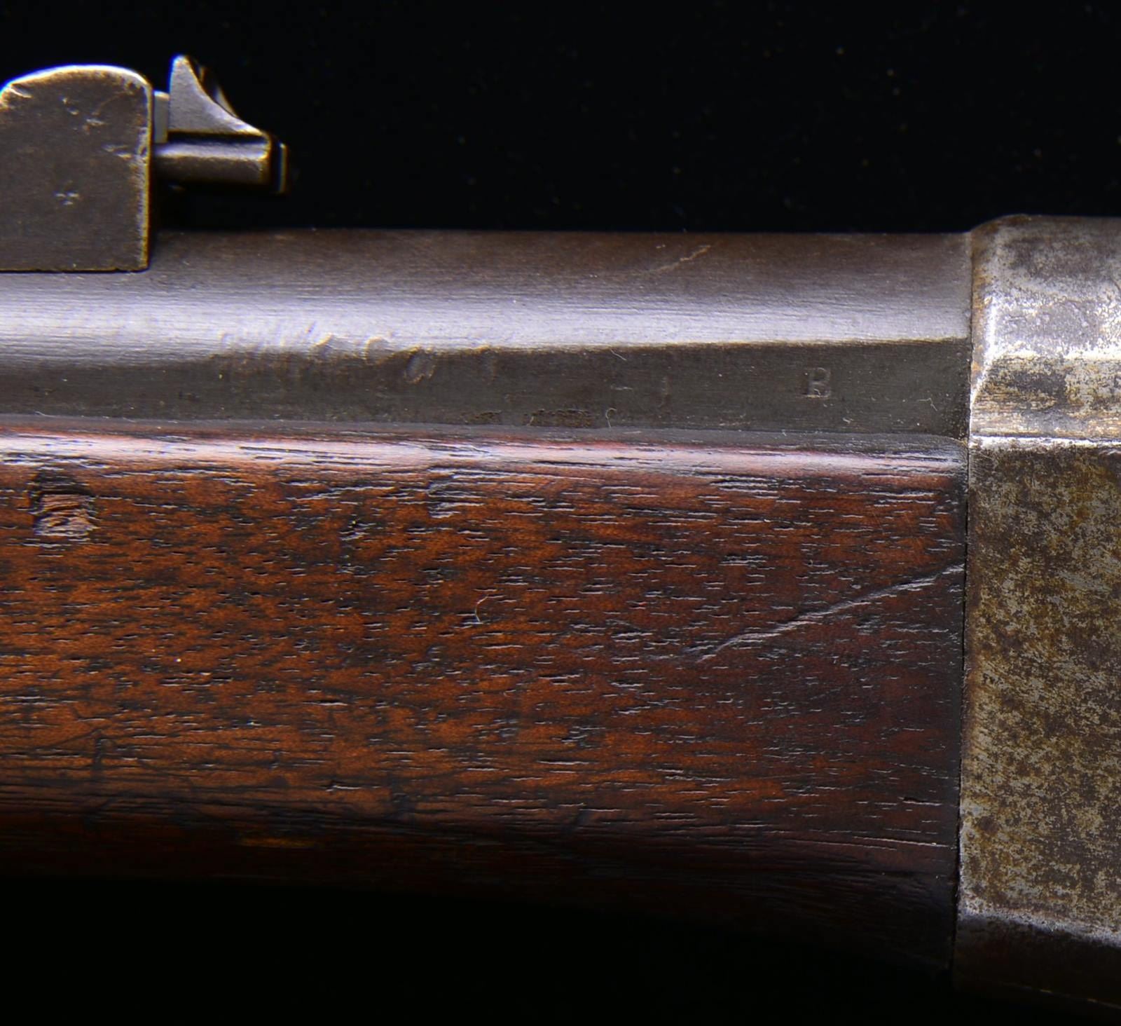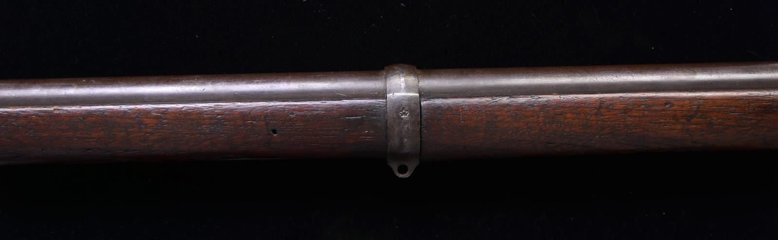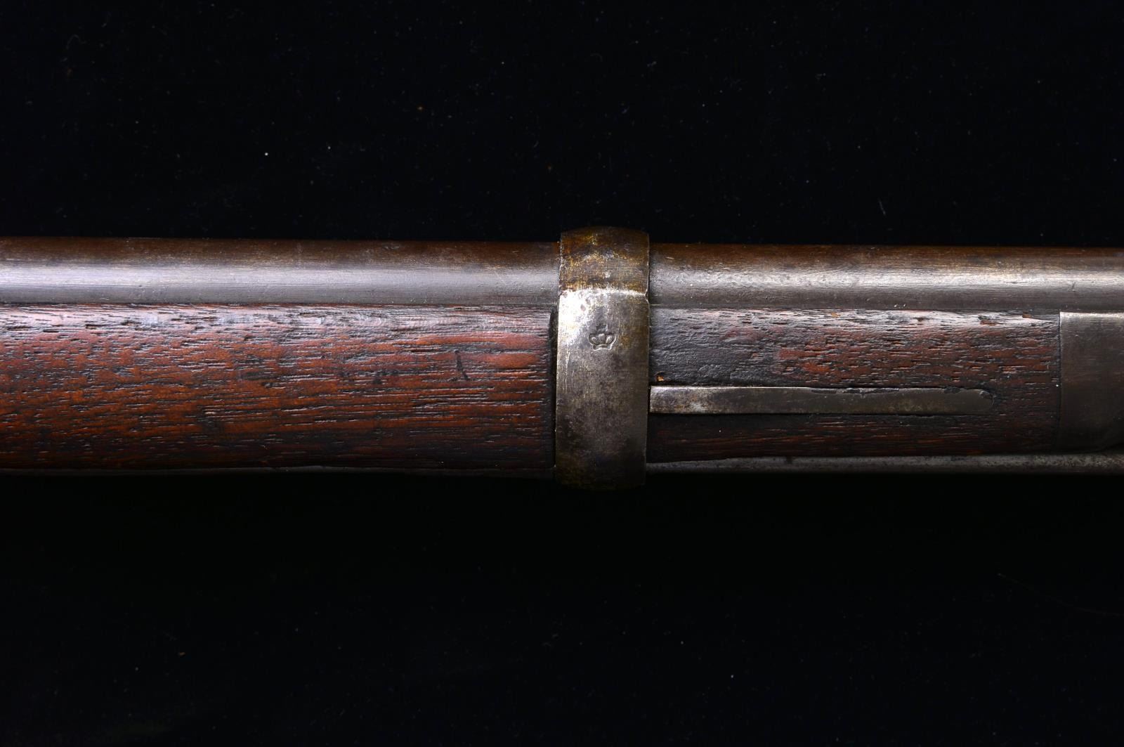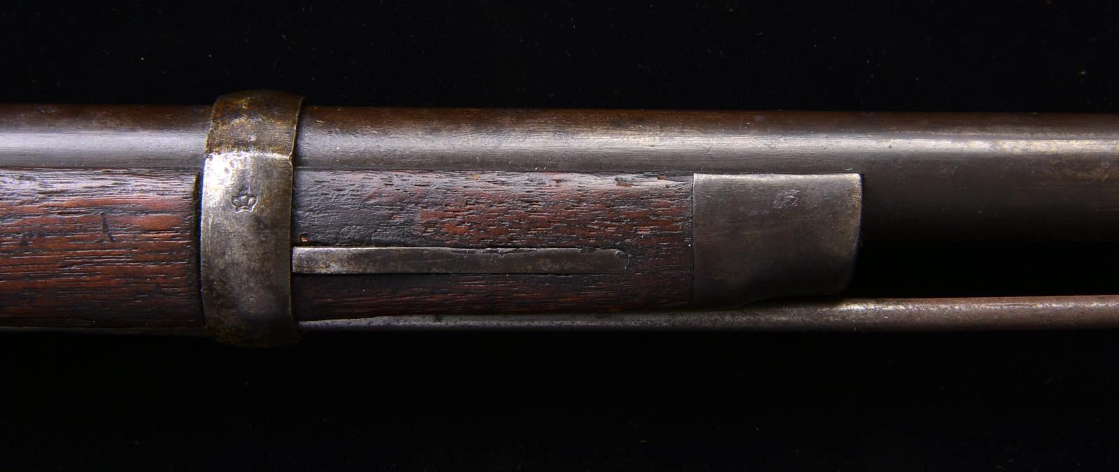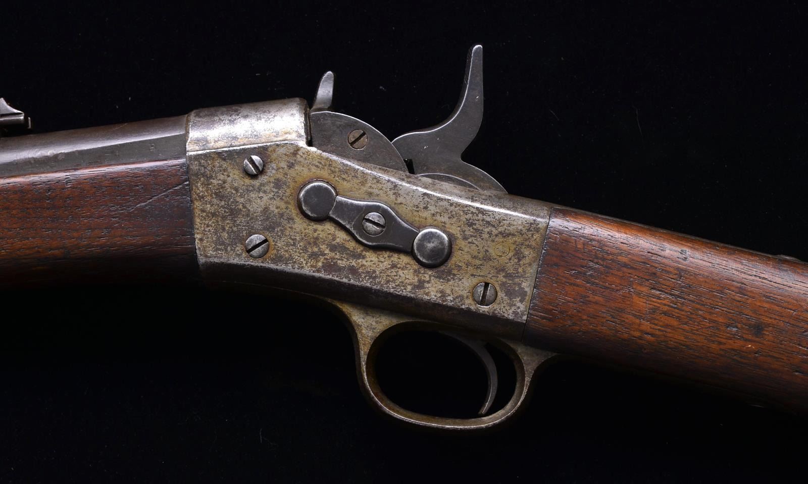 MILITARY RIFLE. Cal. 43 Spanish (?). NSN. Bbl. 35” w/ flip up tangent rear sight & silver bead front sight. Typical action w/ Remington markings on top tang. Last patent date is 1888. American walnut stock is fitted w/ steel buttplate & has sling eye on bottom. Matching long forend w/ steel tip & cleaning rod is held by 3 bands. Center band stamped w/ a crown. CONDITION: good overall. Bbl. retaining a considerable amount of its original blue. Action w/ all case hardening turning silver w/ considerable rusting & pitting. Stocks have most of their original oil finish. Fair bore w/ strong rifling, pitted throughout. Mechanically good. (01-18790/MGM). ANTIQUE. $400-600.