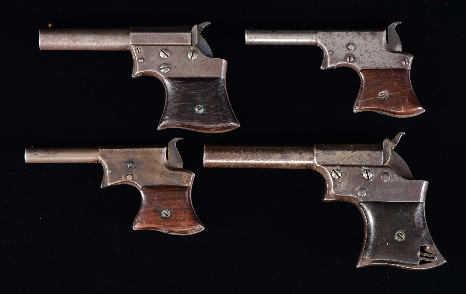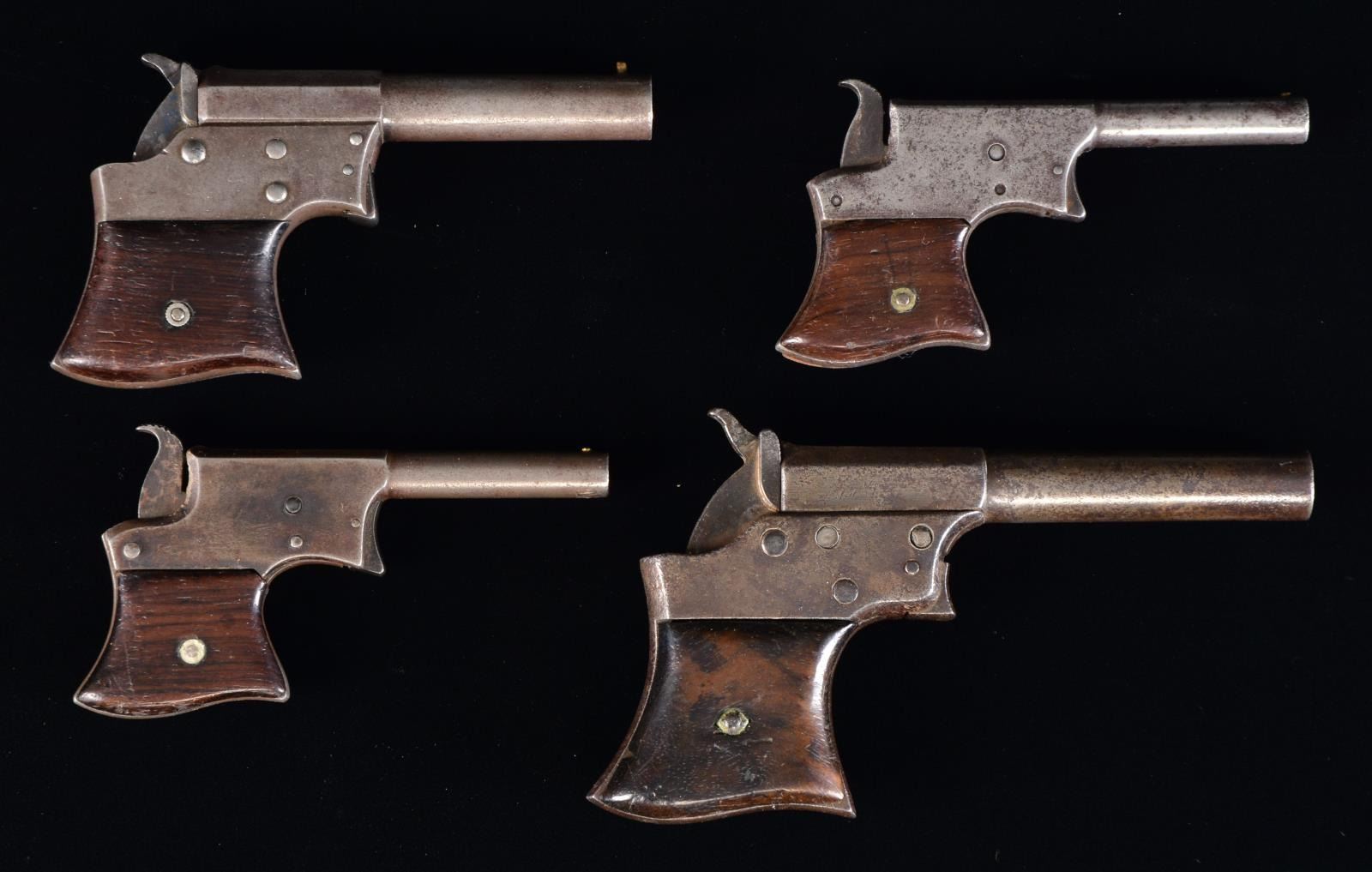 1) NO. 1 SIZE. Cal. 22 RF. S# 11823. Bbl. 3 1/4" w/ brass front bead. Hammer doubles as breech block. 2 Piece rosewood grips. CONDITION: metal finish has faded to gray showing general light pitting. Grips show moderate wear & handling marks. Left panel is cracked through attachment screw. Dark pitted bore. Action has very weak spring tension. (01-17575/DS). 2) Cal. 32 RF. NSN. Bbl. 3 1/2" rnd. w/ oct. shank. Brass bead front sight. Split breech action. 2 Piece rosewood grips. CONDITION: bbl. & action finish have faded to gray showing light pitting Breech block retains some heat blue finish. Grips show wear & handling marks. Dark pitted bore. (01-17578/DS). 3) Cal. 41 RF. S# 345. Bbl. 4 1/8" oct. to rnd. missing front bead. Split breech style action. 2 Piece rosewood grips. CONDITION: metal has a dark mottled patina appearance w/ general pitting. Grips show heavy wear w/ sm. chip missing from rear of right panel & lg. chip missing at heel of left panel. (01-17579/DS). 4) NO. 1 SIZE. Cal. 22 RF. S# 0667. Bbl. 3 1/4". w/ bead front sight. Hammer doubles as breech block. 2 Piece rosewood grips. CONDITION: frame retains sm. amount of blue fading to gray showing spots of pitting. Grips show heavy wear w/ dents & handling marks. Dark pitted bore. (01-17583/DS). ALL ANTIQUE. $700-1,000.