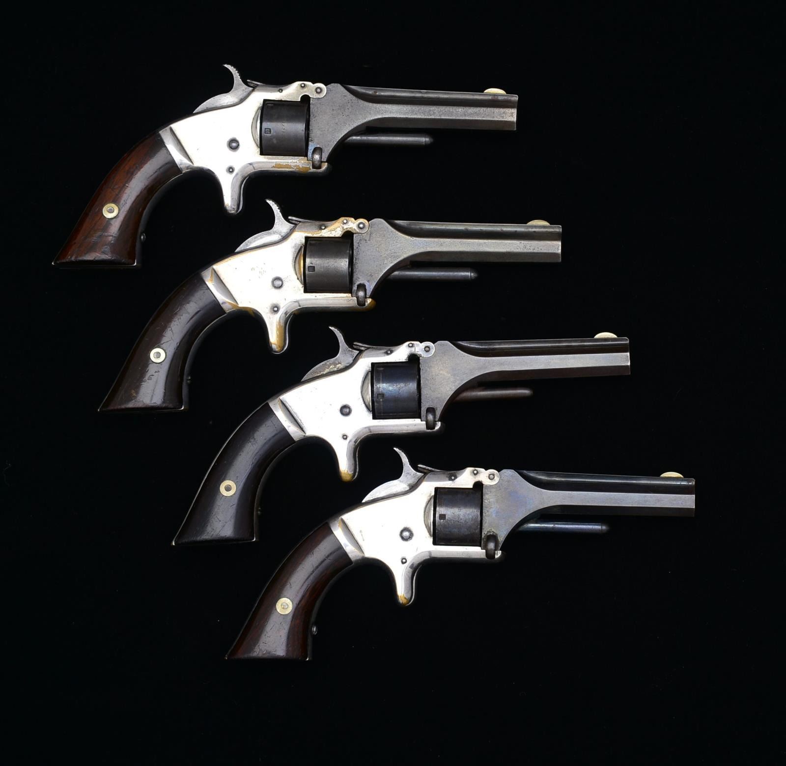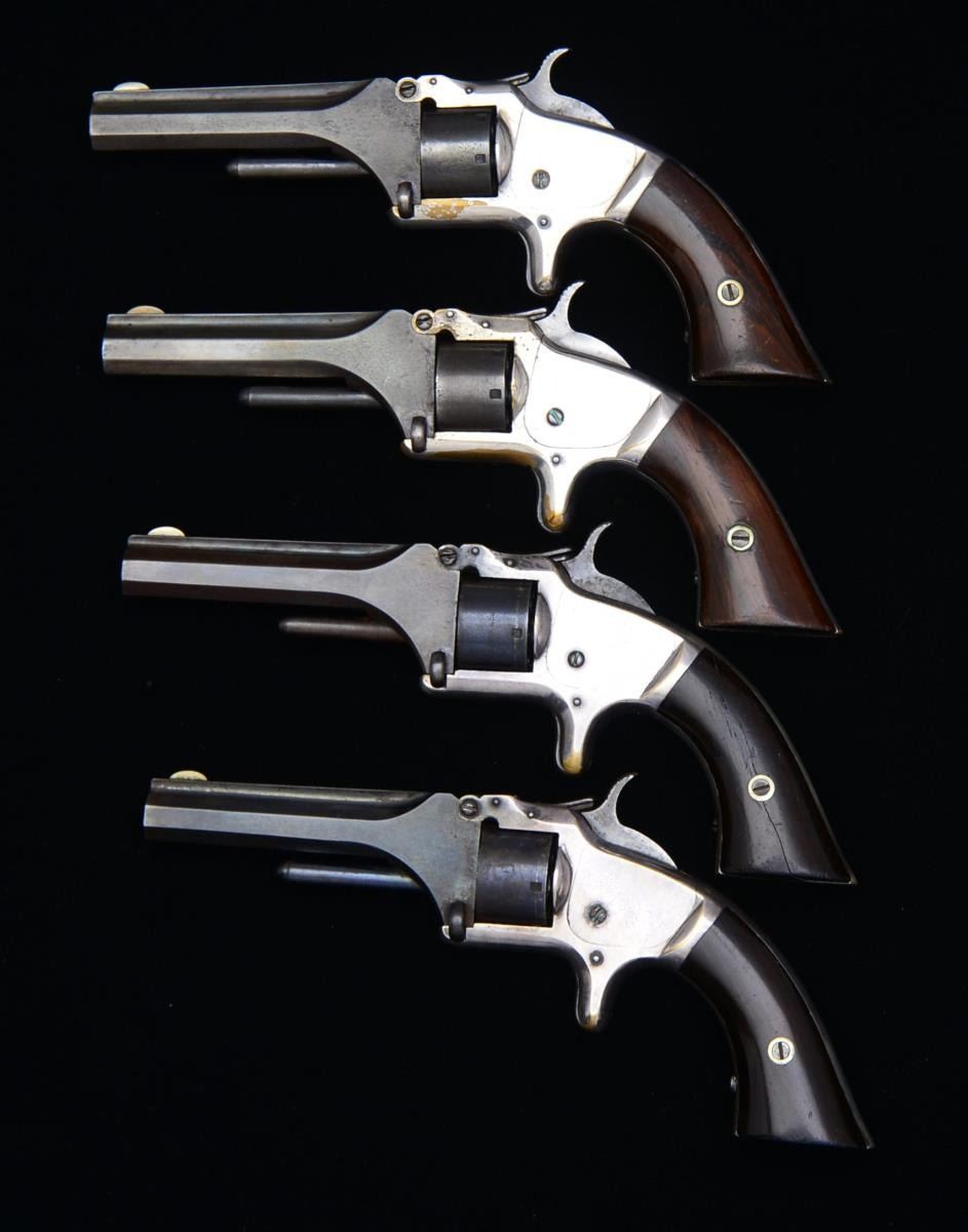 ALL: cal. 22 RF. Bbls. 3 1/8" oct. w/ rib & semicircular German silver front sights. 7 Shot rnd. cyls. Tip-up actions w/ spur triggers. Blued bbls. & cyls. w/ silver finished brass frames having case colored hammer & triggers. 2 Piece rosewood grips. Total of 117,000 Mfg. 1860-1868. 1) S# 50729. CONDITION: bbl. & cyl. blue are fading to brown showing light pitting & evidence of cold blue touch up. Frame retains 90% silver finish showing scratch marks in S# area. Grips show spots of peeling finish & handling marks. Sound action. Lightly pitted bore. (01-18545/DS). 2) S# 91350. CONDITION: bbl. & cyl. blue is fading to brown showing surface corrosion & evidence of cold blue touch up. Action retains 75% silver showing numerous scratches & sm. dents. Grips have worn & peeling finish showing scattered marks. Sound action. Dark lightly pitted bore. (01-18546/DS). 3) S# 24247. CONDITION: bbl. & cyl. have brown color from cold blue application. Action retains 75% silver showing edge wear w/ scratches & marks. Grips have worn finish showing handling marks. Right panel has crack extending from butt to screw attachment area. Action is bound up & will not cycle. Bore shows heavy wear w/ little remaining rifling. (01-18548/DS). 4) S# 20917. CONDITION: bbl. & cyl. show evidence of touch up finish. Frame retains 70% silver finish. Grips show light wear & handling marks. Dark pitted bore. Cyl. is out of time. (01-18550/DS). ALL ANTIQUE. $600-1,000.