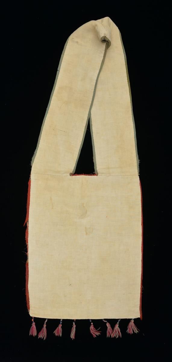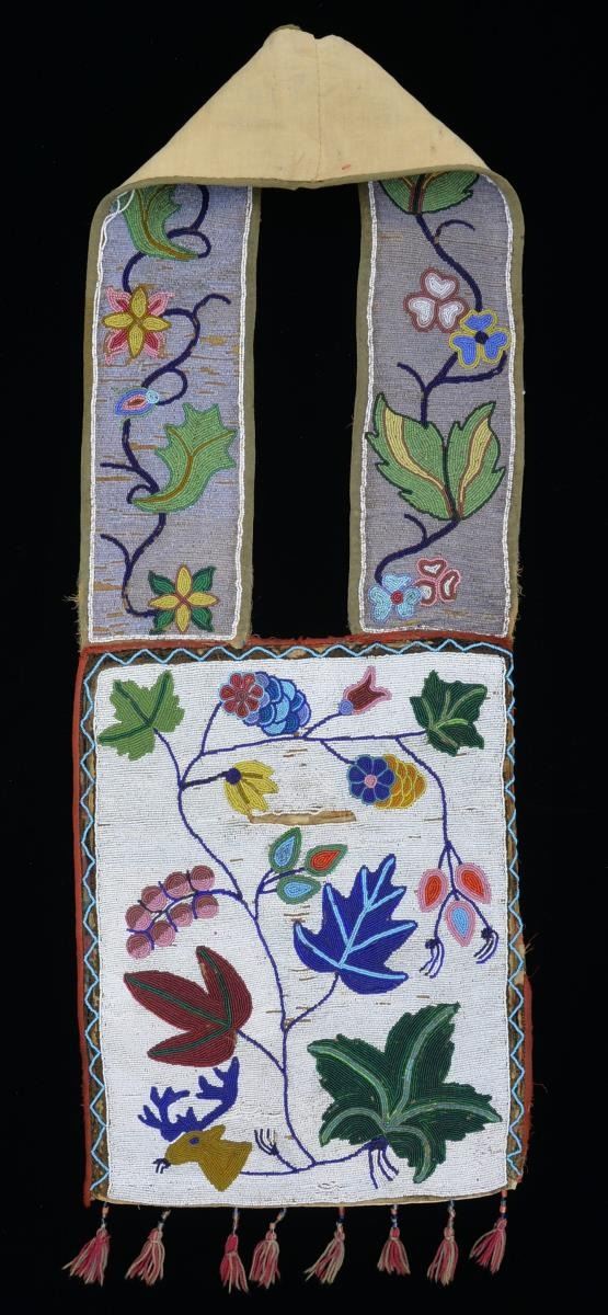 An exceptionally well executed bandolier bag possibly originating w/ the Iroquois tribes of North America. The bag body measures approx. 17 3/4" x 13 1/2", not including tassels. The shoulder band measures approx. 39” from end to end & 5” wide. The bag body is primarily white beads w/ a polychromatic design featuring leaves, a deer head, flowers & berries. The back of the bag is muslin. Bag is edged w/ a dark red tape material. Tassels are red & tan yarn topped w/ cylinder beads. The shoulder band is primarily violet in color w/ leaf & floral polychromatic decoration. It is also backed in muslin & has a dull olive green border. CONDITION: bag shows honest wear & losses to the edging tape on the bag & shoulder strap. There are scattered areas of minor bead loss not affecting the overall visual impact of the bag. A stunning piece of Native American art. (02-14018/BF). $1,200-2,000.
