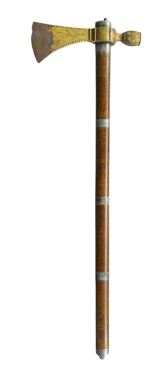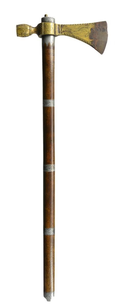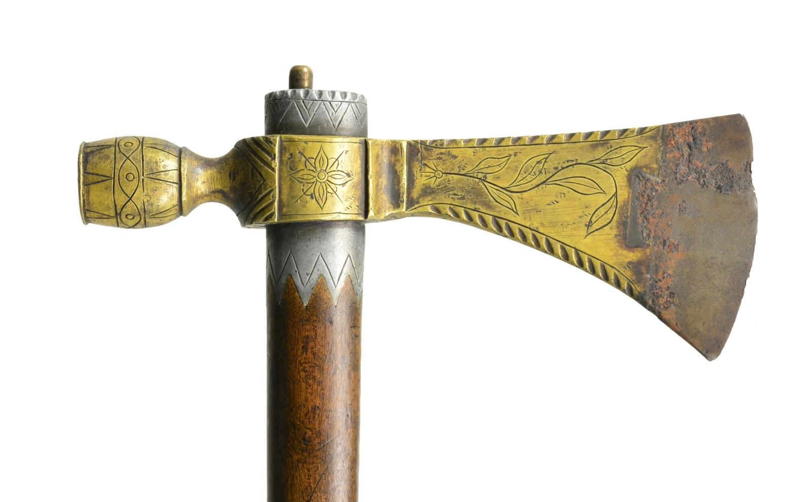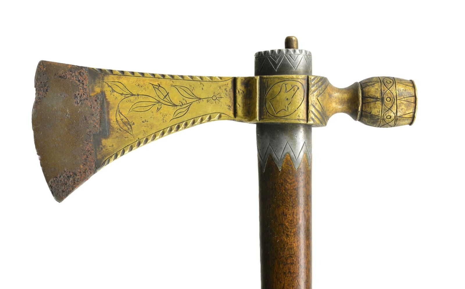 HAVING PEWTER MOUNTED HAFT. 6 1/2" Head, 2 1/2" cutting edge, 20 3/4" haft. Engraved leaf design on blade, flower on one side of eye, & howling Wolf design on the other, elongated bowl has geometric design. Top edges have punched circles surrounding eye. The haft has pewter bands decorated w/ leaves like blade. CONDITION: very good overall, the iron has rust, pitting & nicks in cutting edge, brass has medium mustard patina. PROVENANCE: From the Collection of John "Tim" Breth Jr. (02-13789/JS). $3,000-4,000.