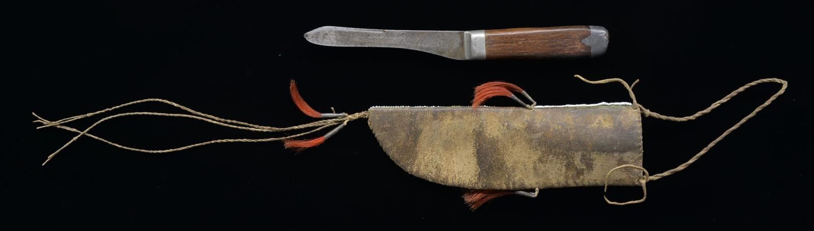 Skinning knife measures w/ wood & pewter grip measures 10.5" overall. Sheath is all sinew sewn, decorated in white seed bead ground, w/ red, greasy yellow, cobalt, turquoise, & pink bead decoration. Trimmed w/ tin cone pendants w/ red died horsehair. CONDITION: good to very good overall. (02-14580/JS). $1,500-2,000.